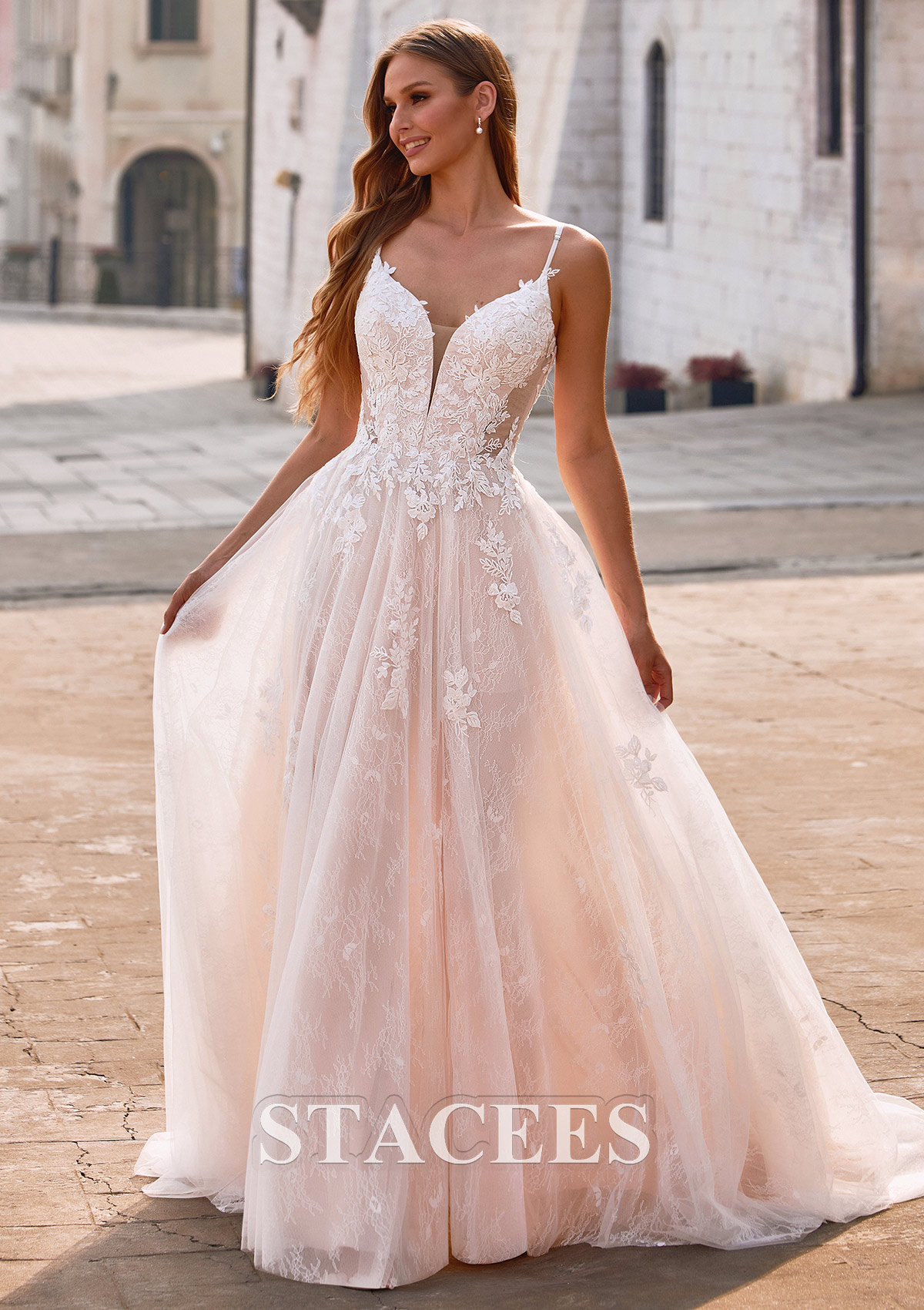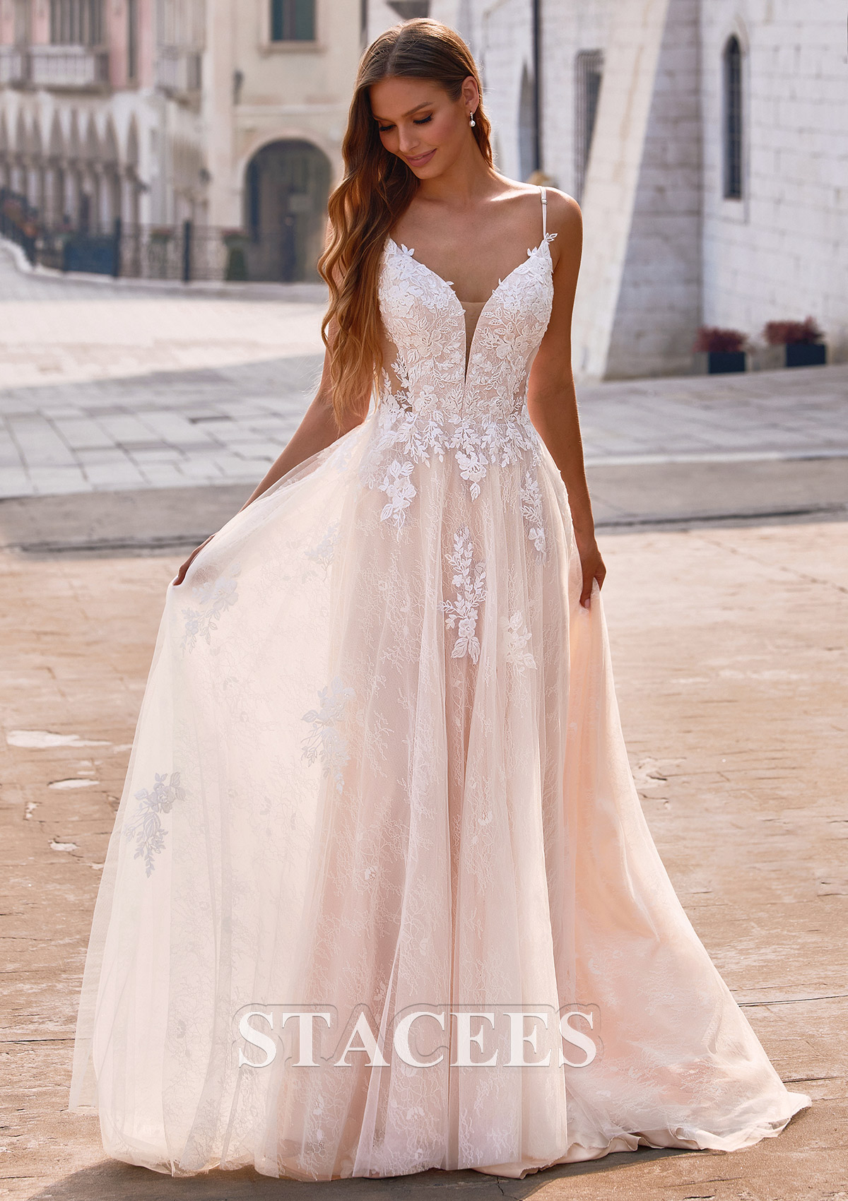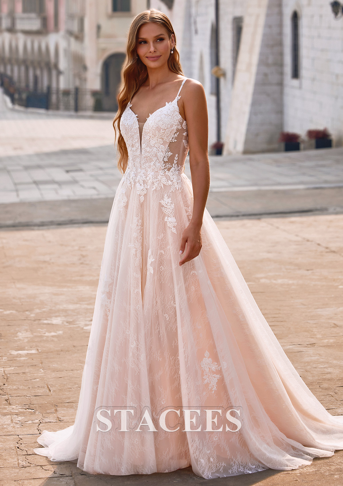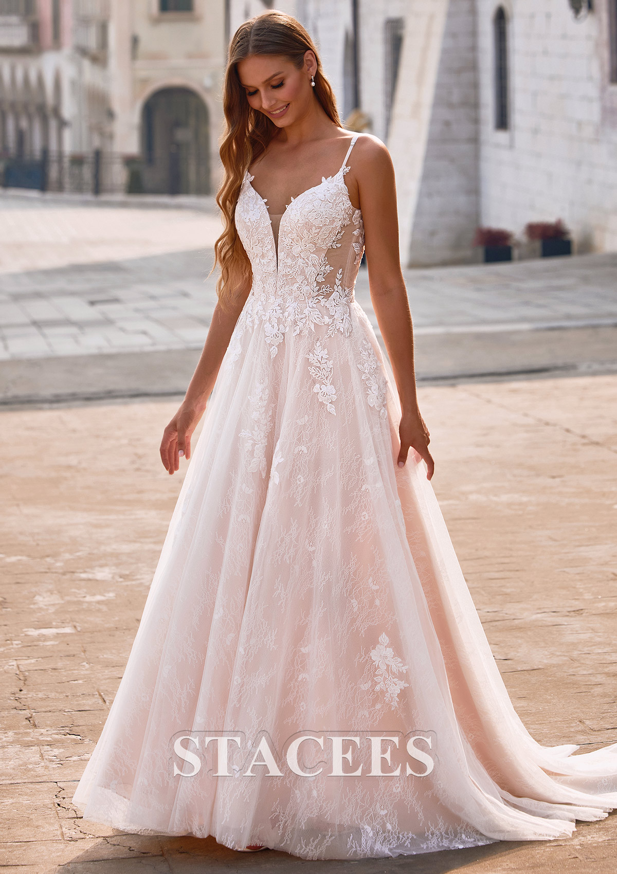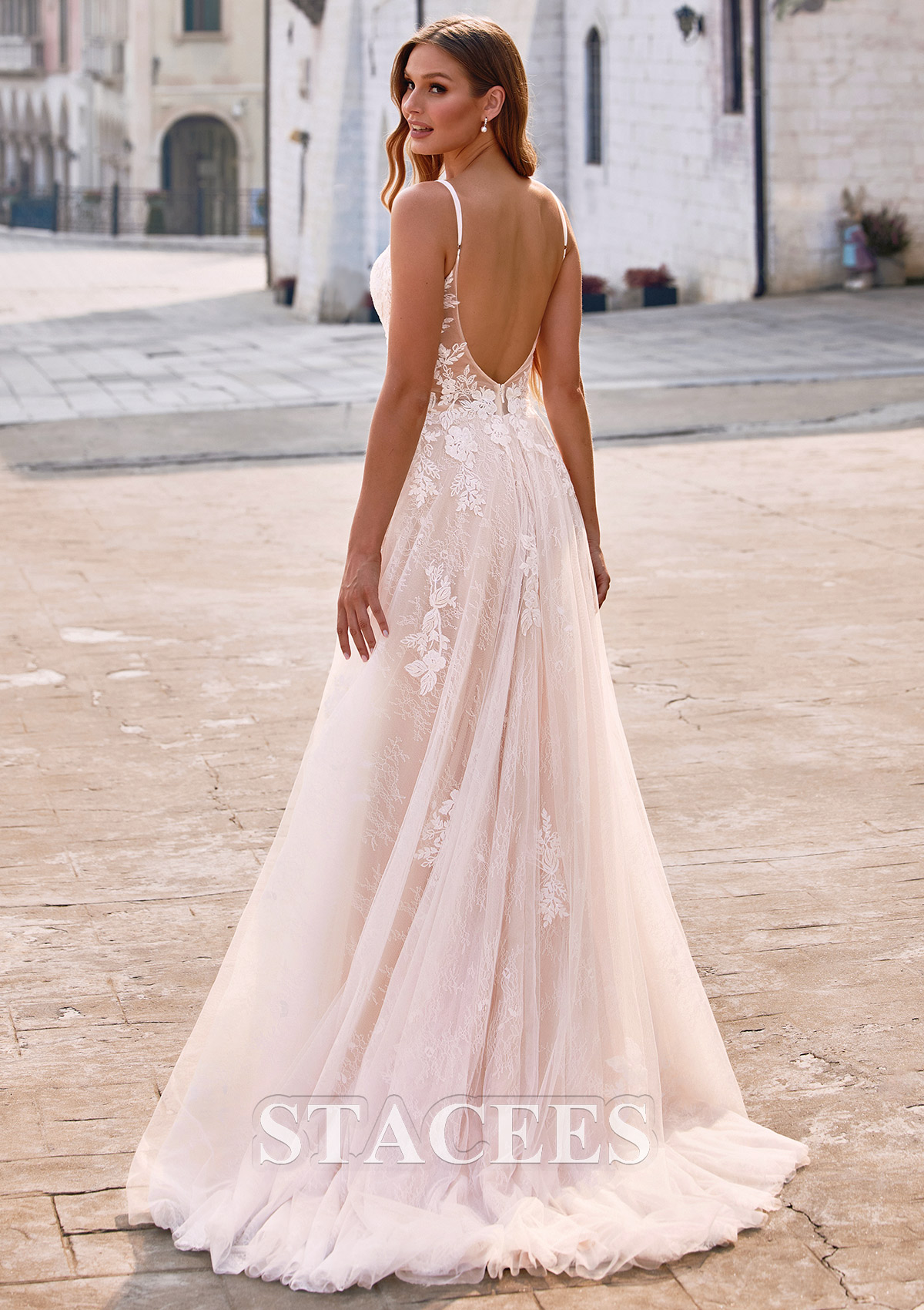 Trapèze col en v dentelle traîne légère robe de mariée avec appliqué S3178W - Robes de mariée - Stacees.fr