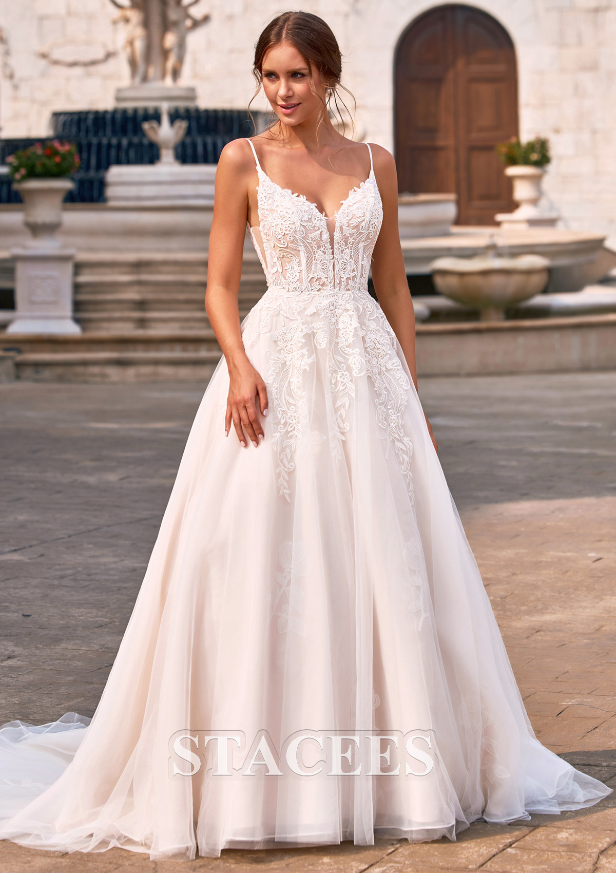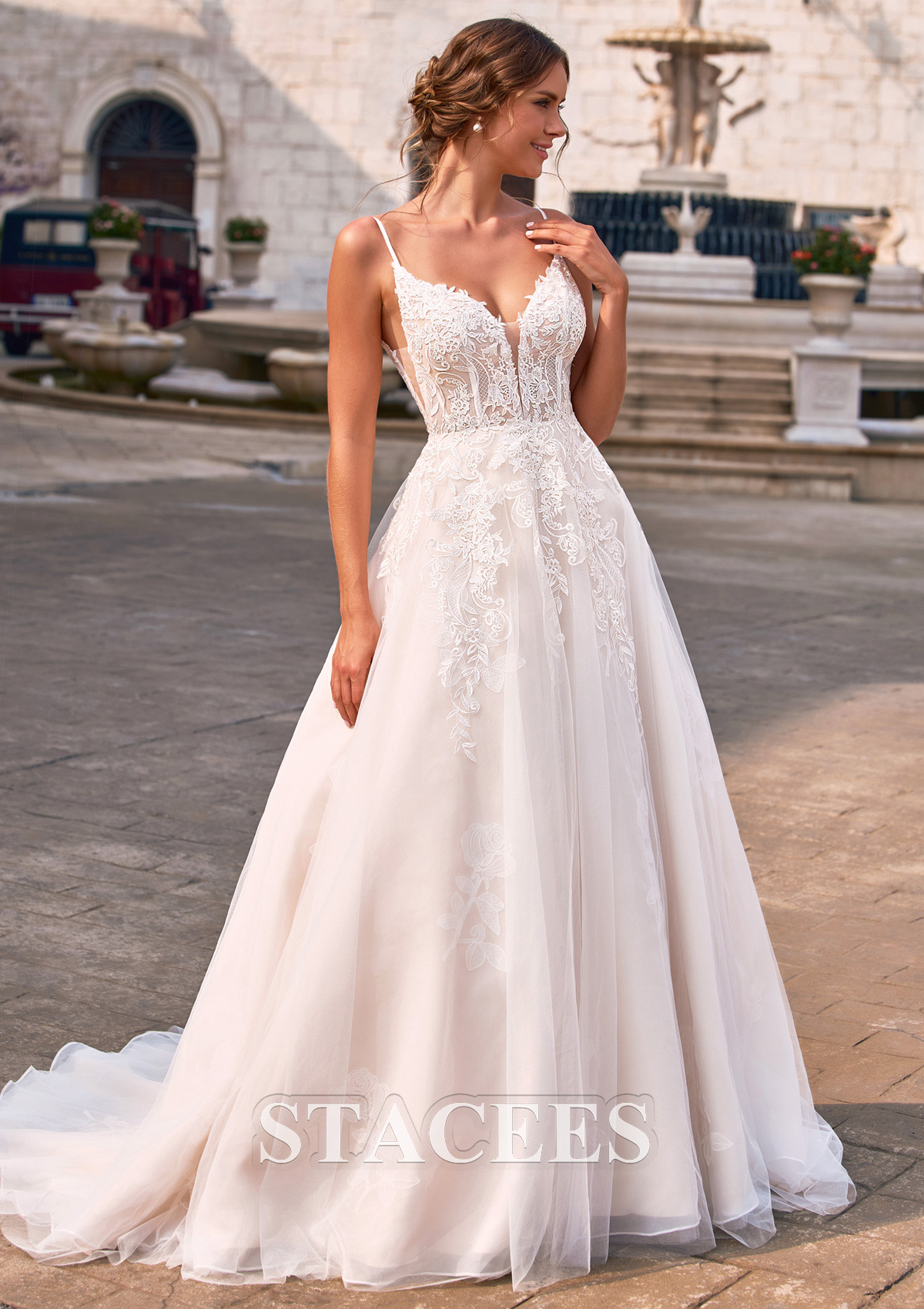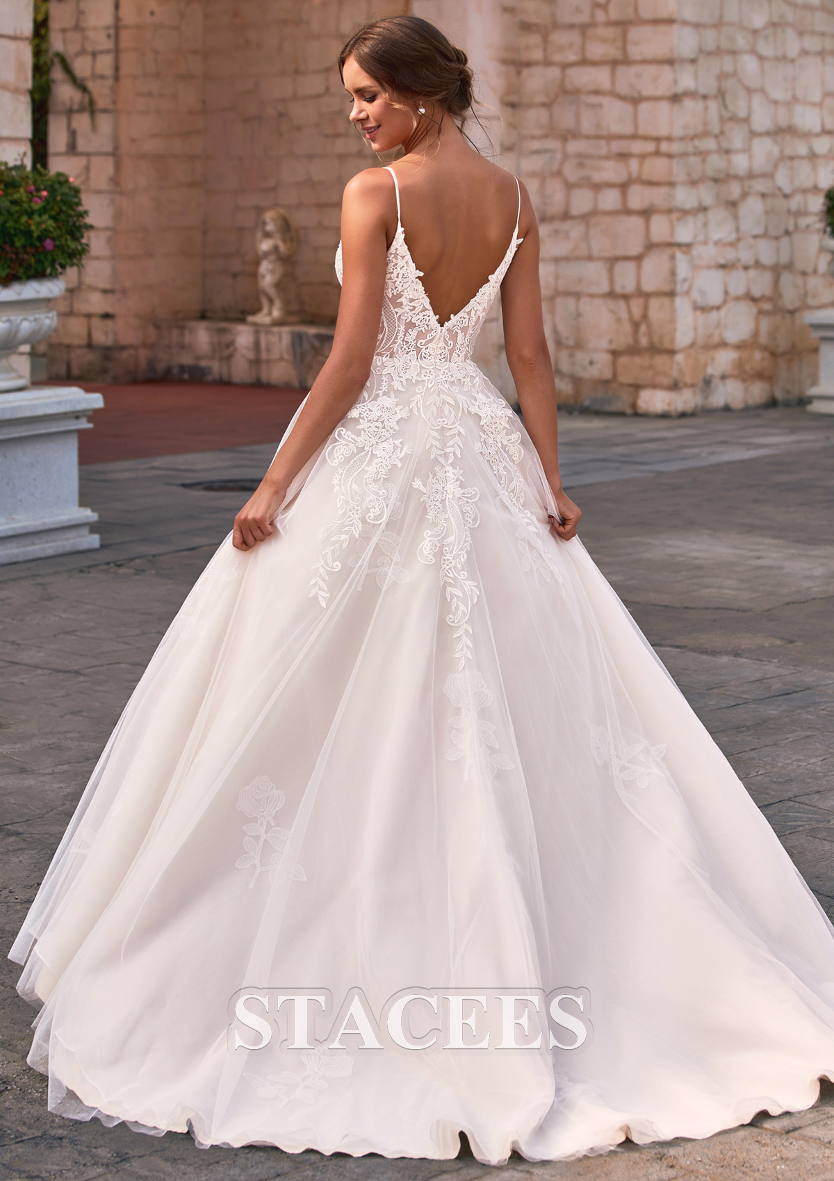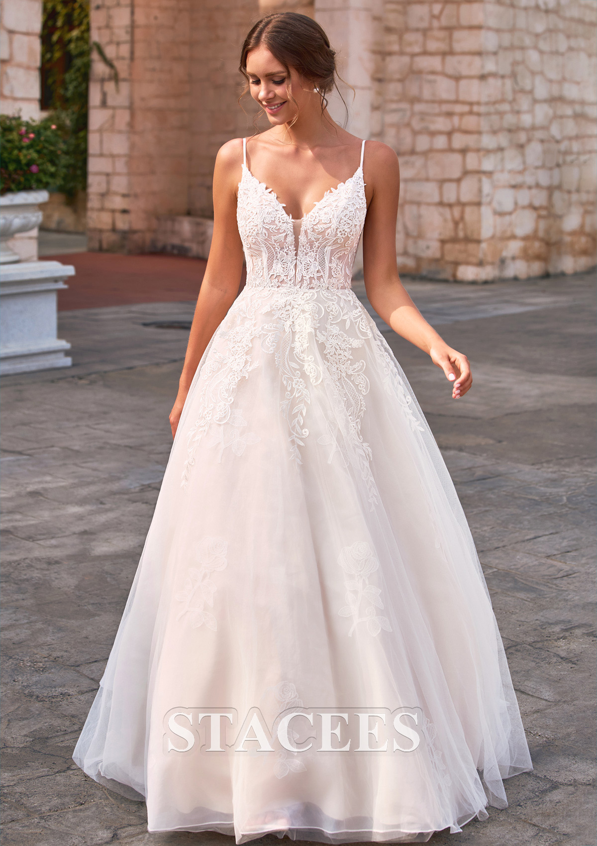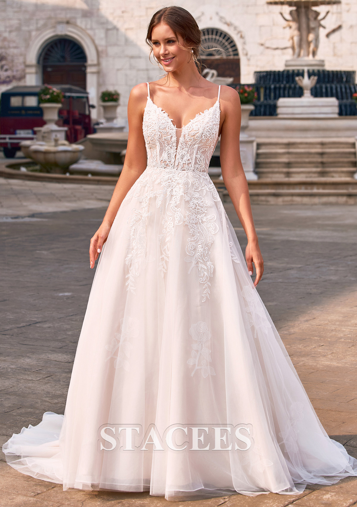 Trapèze col en v tulle traîne courte robe de mariée avec dentelle appliques S3170W - Robes de mariée - Stacees.fr