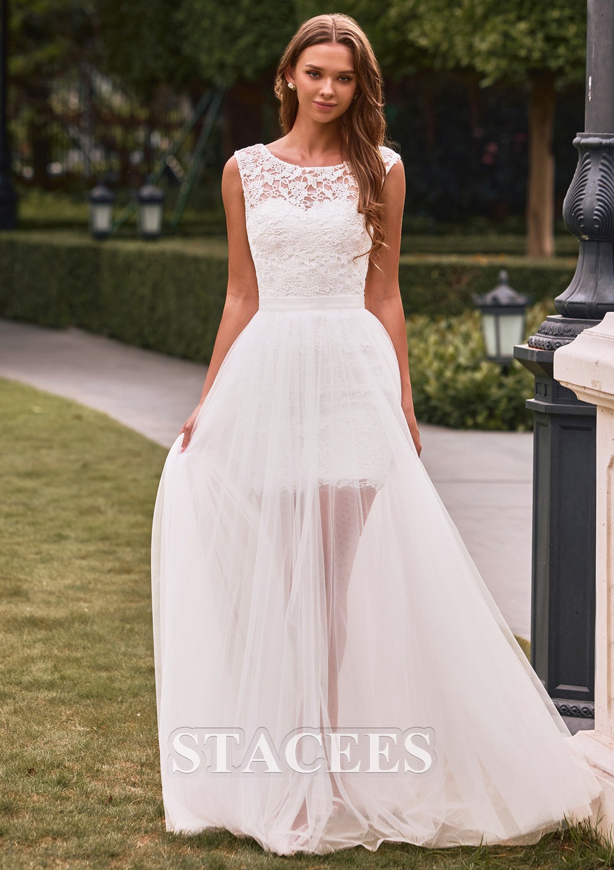 Trapèze col illusion tulle longueur ras du sol robe de mariée avec dentelle S3218W - Robes de mariée - Stacees.fr