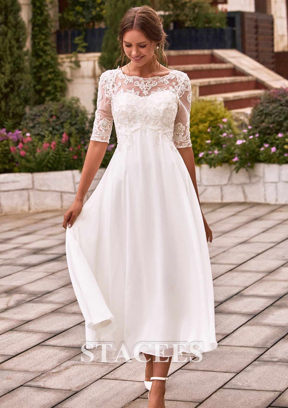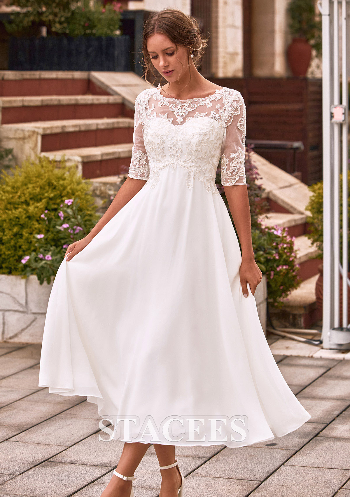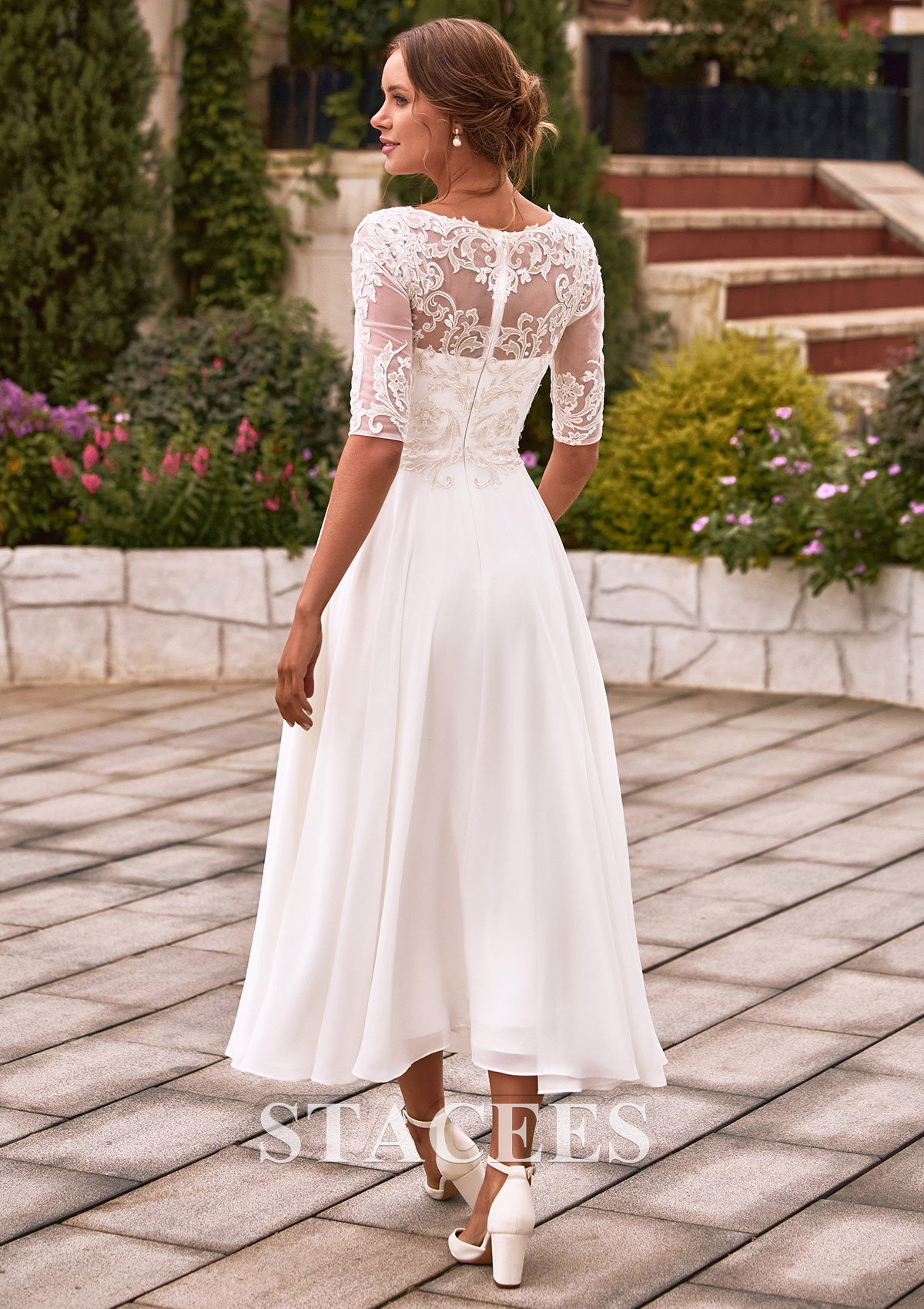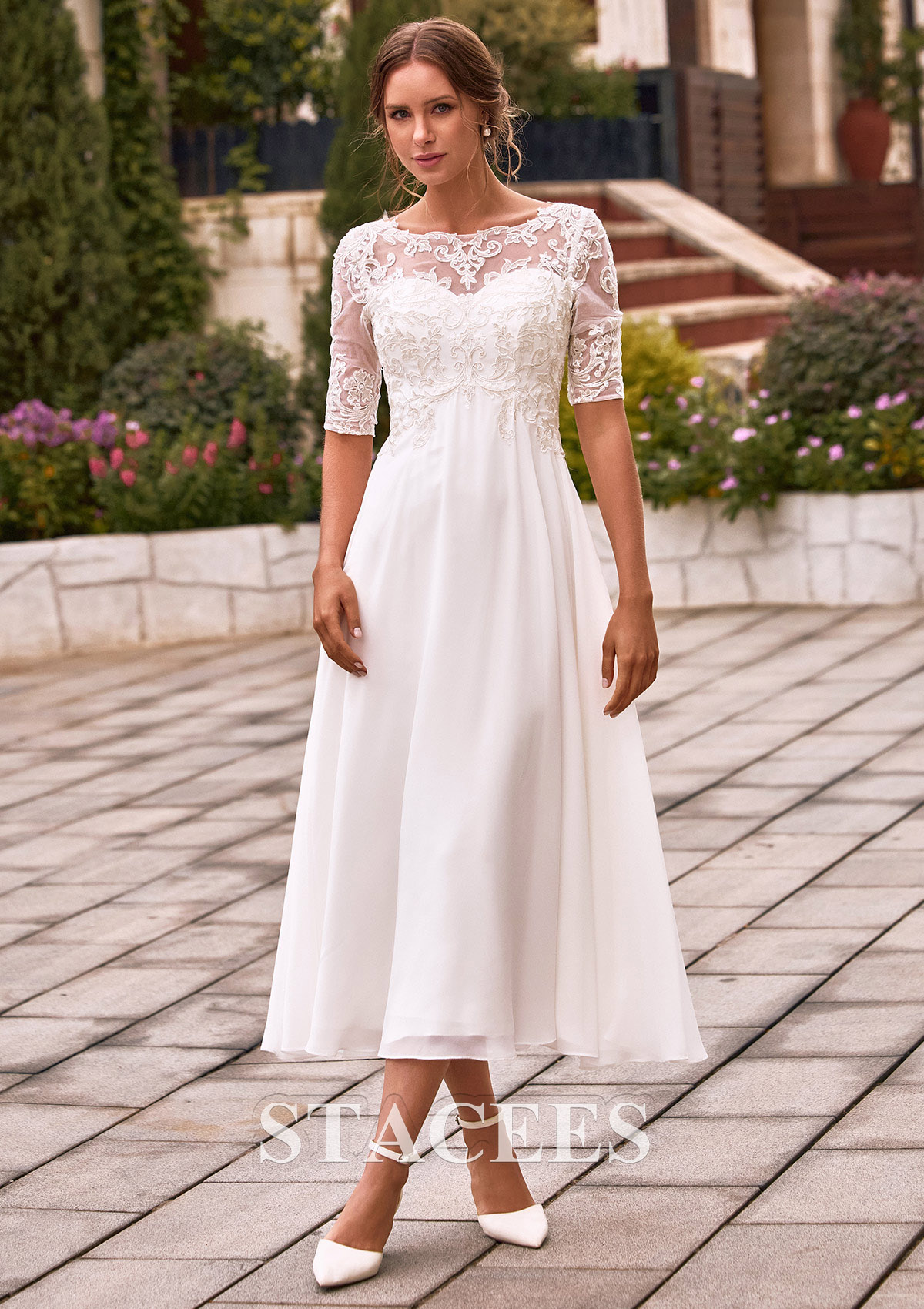 Step back in time with a touch of modern grace in this stunning tea-length wedding dress. This wedding dress features a delicate combination of lace and chiffon fabric, adorned with sparkling sequins for a touch of glamour. This gown is a masterpiece of classic bridal design, featuring a delicate illusion lace bodice with elegant half sleeves and a sophisticated bateau neckline. The bodice is adorned with intricate floral embroidery that tapers beautifully into a high waistline, leading to a flowing A-line chiffon skirt. From the back, the illusion lace bodice continues, with a hidden zip closure, offers a modest yet breathtaking look. The lightweight chiffon skirt flows gracefully, providing effortless movement and a breezy feel, making it a stunning choice for any bridal occasion.