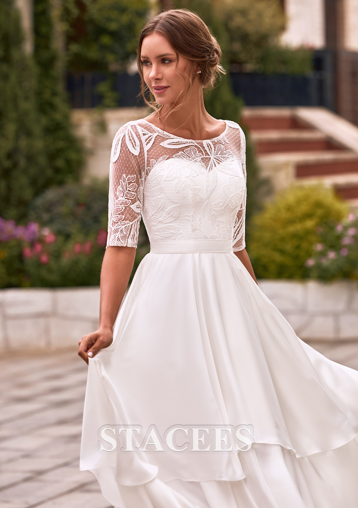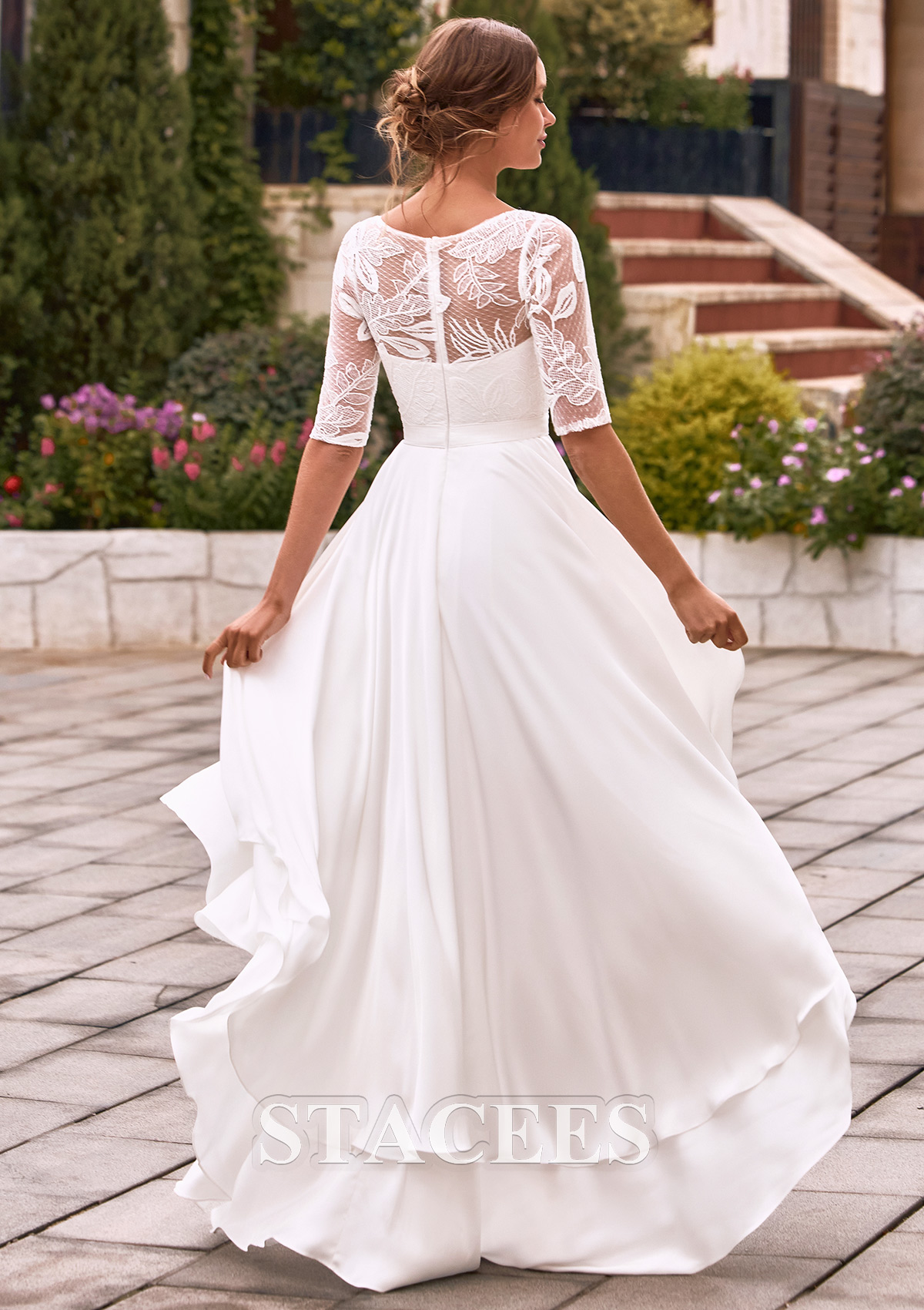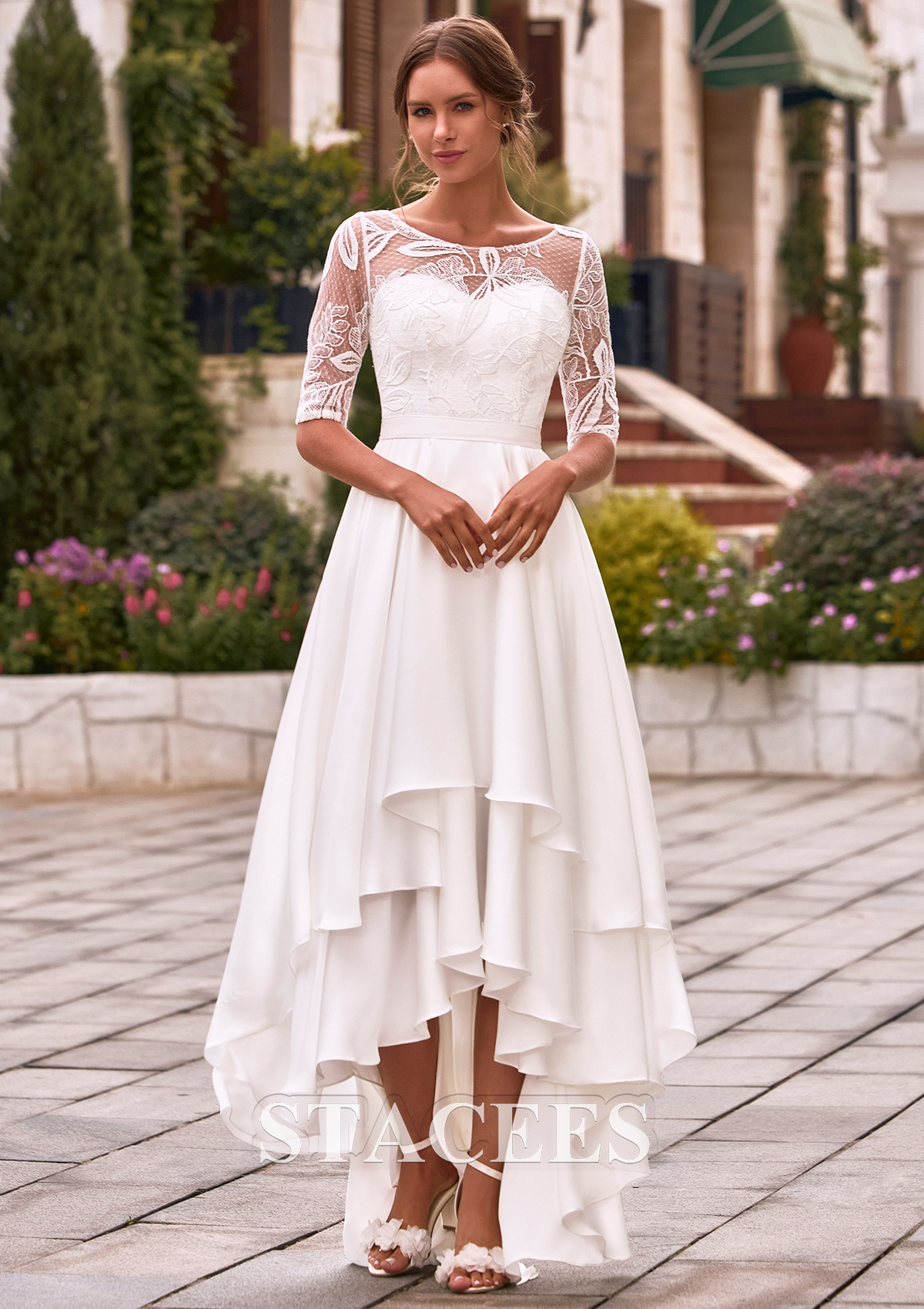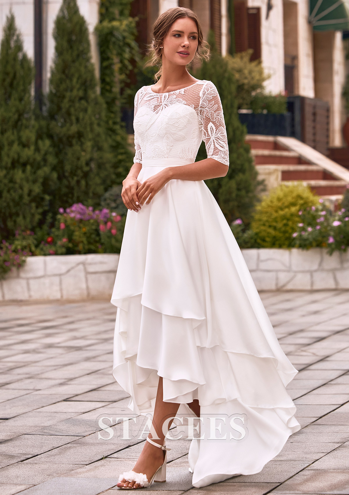 Make a captivating statement on your special day in this stunning high-low A-line wedding dress. The bodice of this wedding dress features a charming illusion bateau neck crafted from intricate floral lace, which leads into elegant half-sleeves for a dignified and refine vibe. Underneath the sheer lace overlay, a structured sweetheart corset provides a supportive and feminine fit, seamlessly cinched at the waist with a sleek band. Flowing gracefully from the fitted waist is a dramatic asymmetrical ruffled A-line skirt. The multi-layered, tiered high-low hemline creates a captivating sense of movement, allowing you to showcase your bridal heels in the front while maintaining a majestic, sweeping look in the back. Beautiful, feminine and chic, this bridal gown is designed for the bride who seeks both sophistication and a playful silhouette for her garden wedding, rehearsal dinner, or reception.