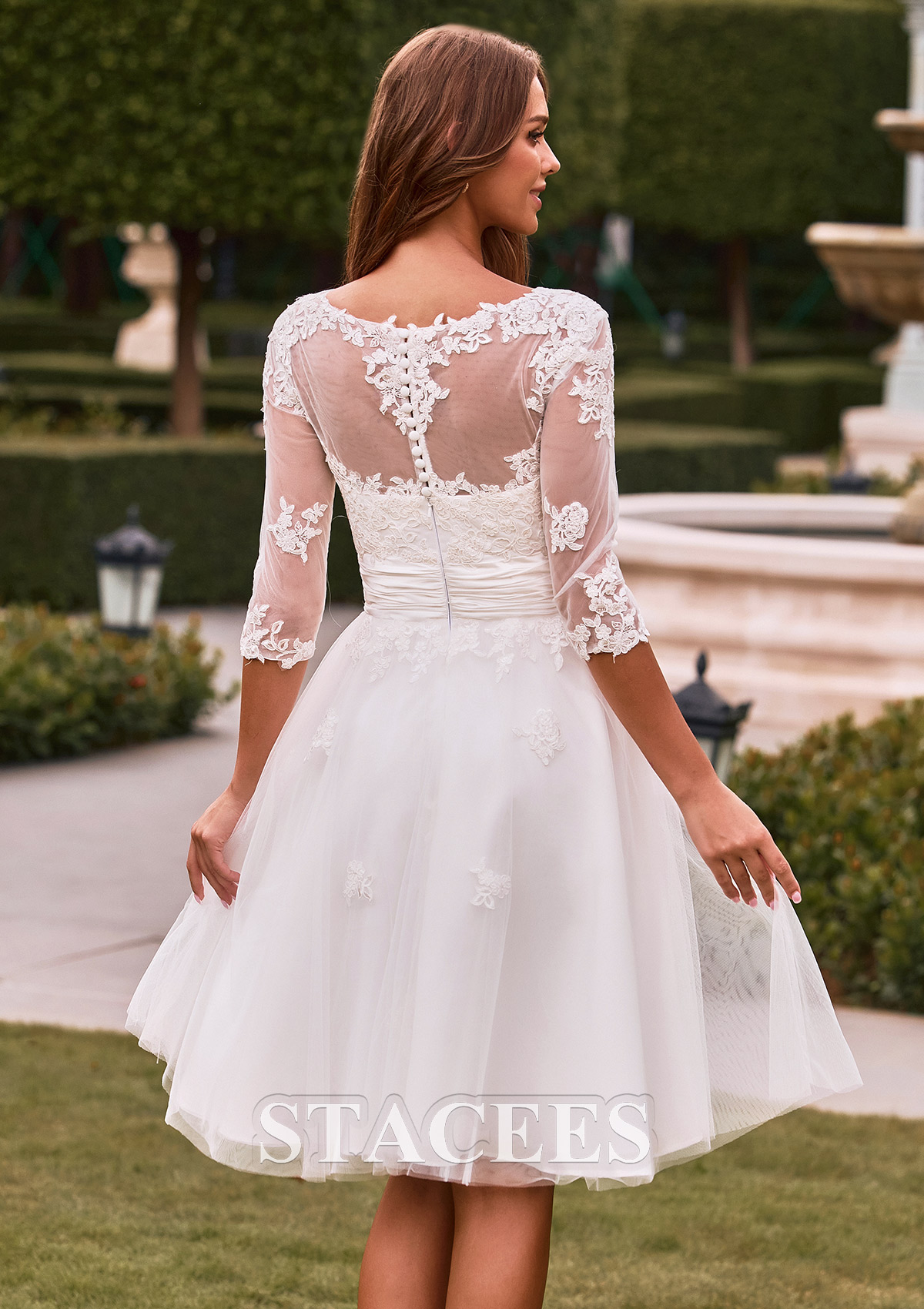 Experience comfort without compromising on style in this elegant tea-length lace bridal dress. Ideal for the modern bride, this gown offers a playful yet refined look with its illusion lace bodice and delicate floral embroidery that extends along the 3/4 sleeves. The design features a romantic sweetheart neckline overlaid with delicate illusion lace, creating a graceful bateau effect. The waist is beautifully cinched with a pleated satin sash and a signature 3D rose applique, leading into a voluminous, flared tulle skirt that falls to a tea-length hem. The back of the gown is equally stunning, showcasing sheer lace detailing and a row of classic fabric-covered buttons. This short bridal gown is the perfect choice for a vintage-inspired wedding, a courthouse ceremony, or as a chic second dress for your reception.
