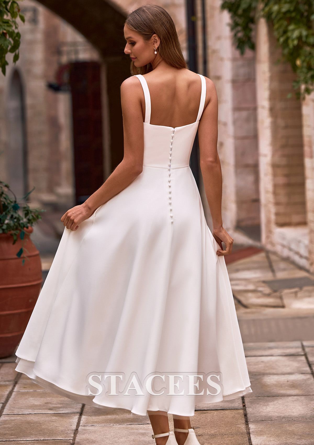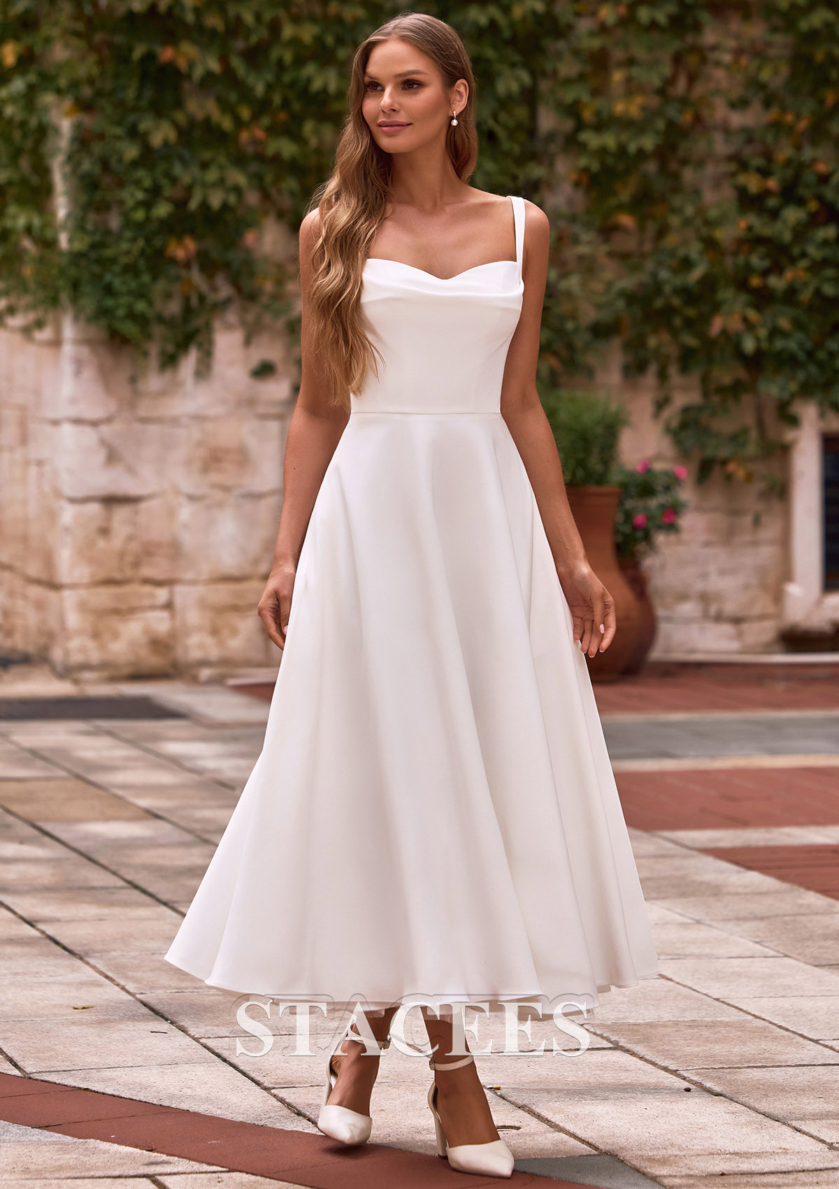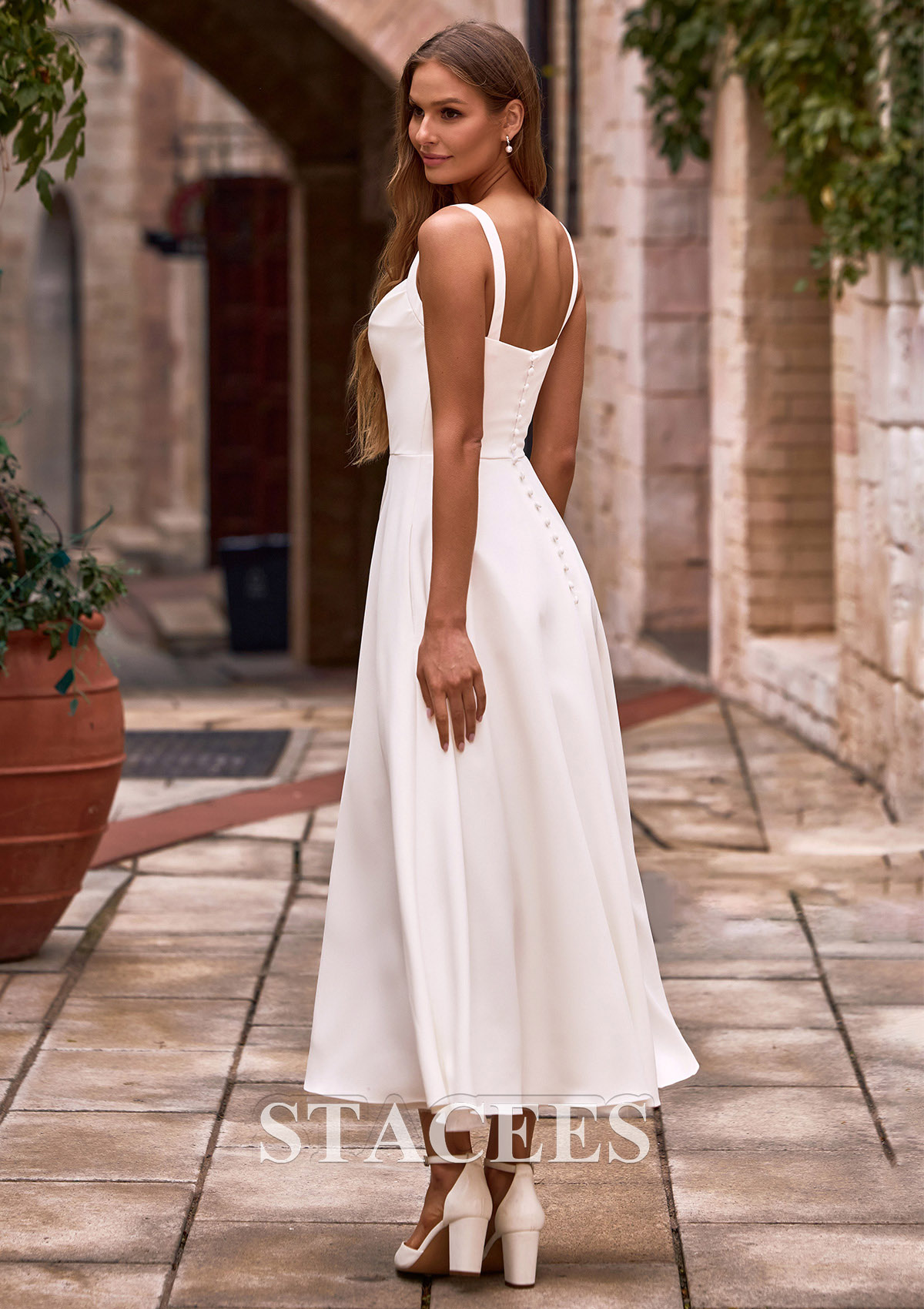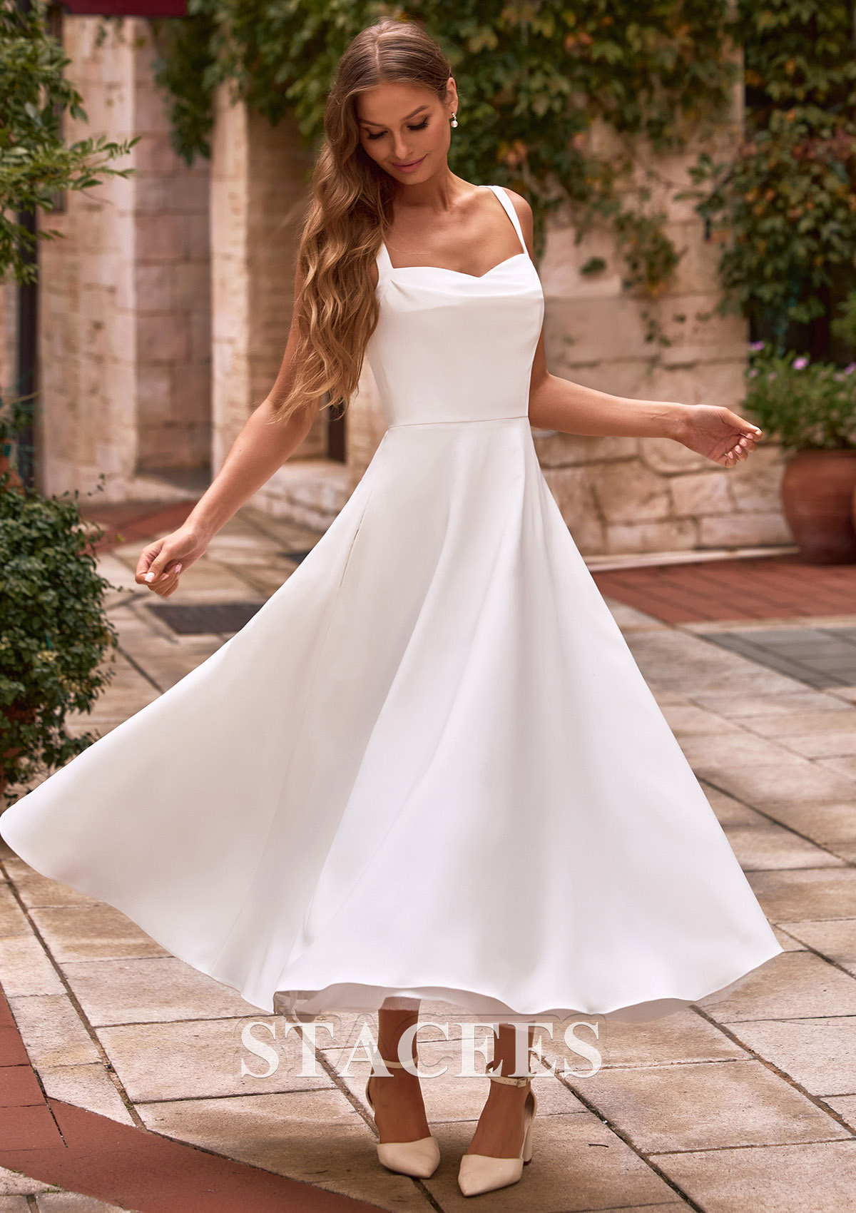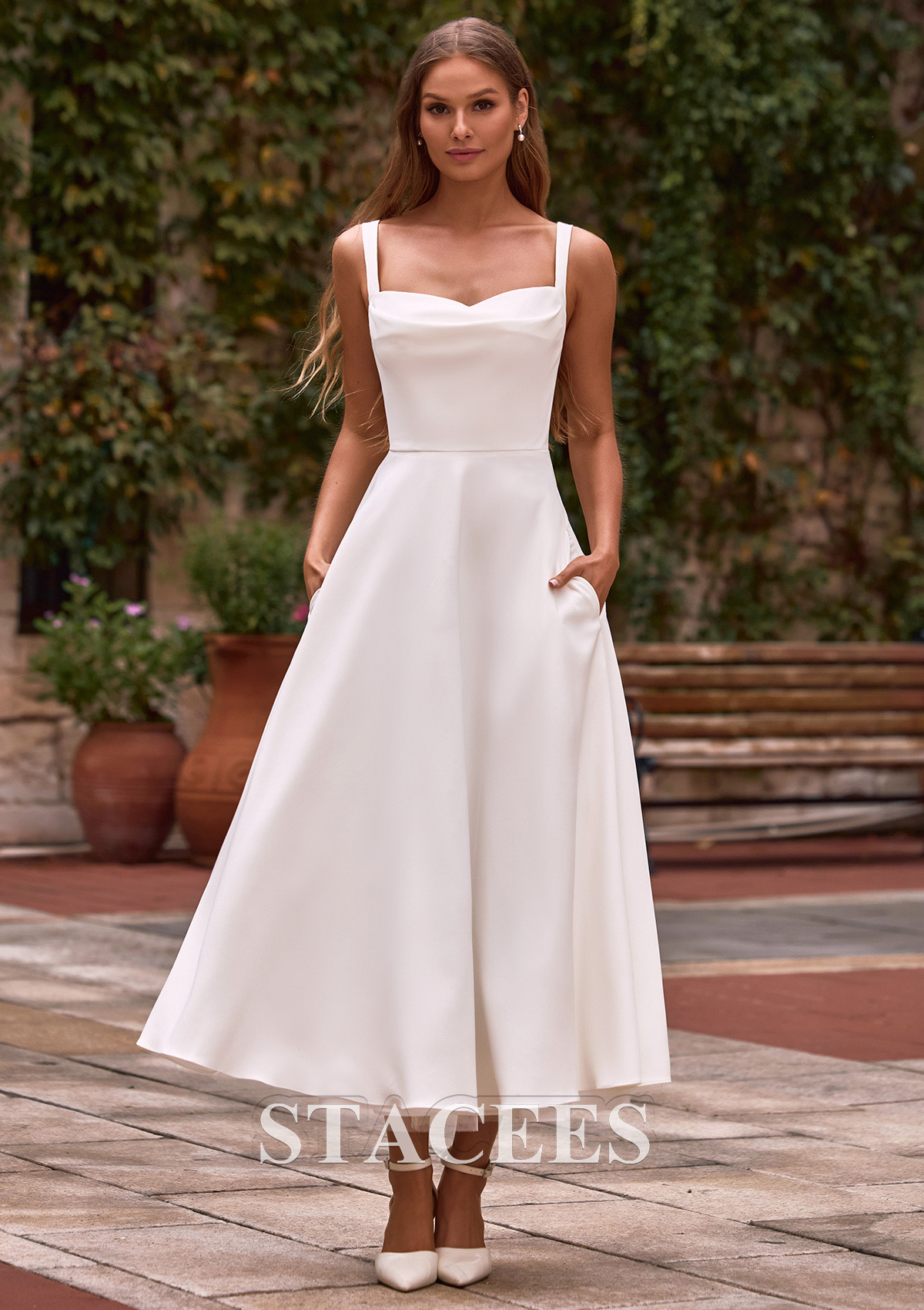 Elegant and charming, this A-line reception wedding dress exudes effortless sophistication with its delicate lines and feminine silhouette. Designed with a flattering A-line silhouette, this bridal dress perfectly cinches at the waist and flows into a graceful tea-length skirt, creating a feminine and effortlessly sophisticated look. The cowl neckline and delicate regular straps of this wedding gown highlights the collarbone and shoulders, adding an alluring vibe. Practical yet stylish, this bridal dress includes functional side pockets, ideal for carrying small essentials without compromising on elegance. The back is finished with a chic buttoned closure, adding a look of vintage charm and secure fit. Whether you are attending a daytime garden wedding or an evening affair, this versatile bridal gown strikes your perfect bridal charm and grace.