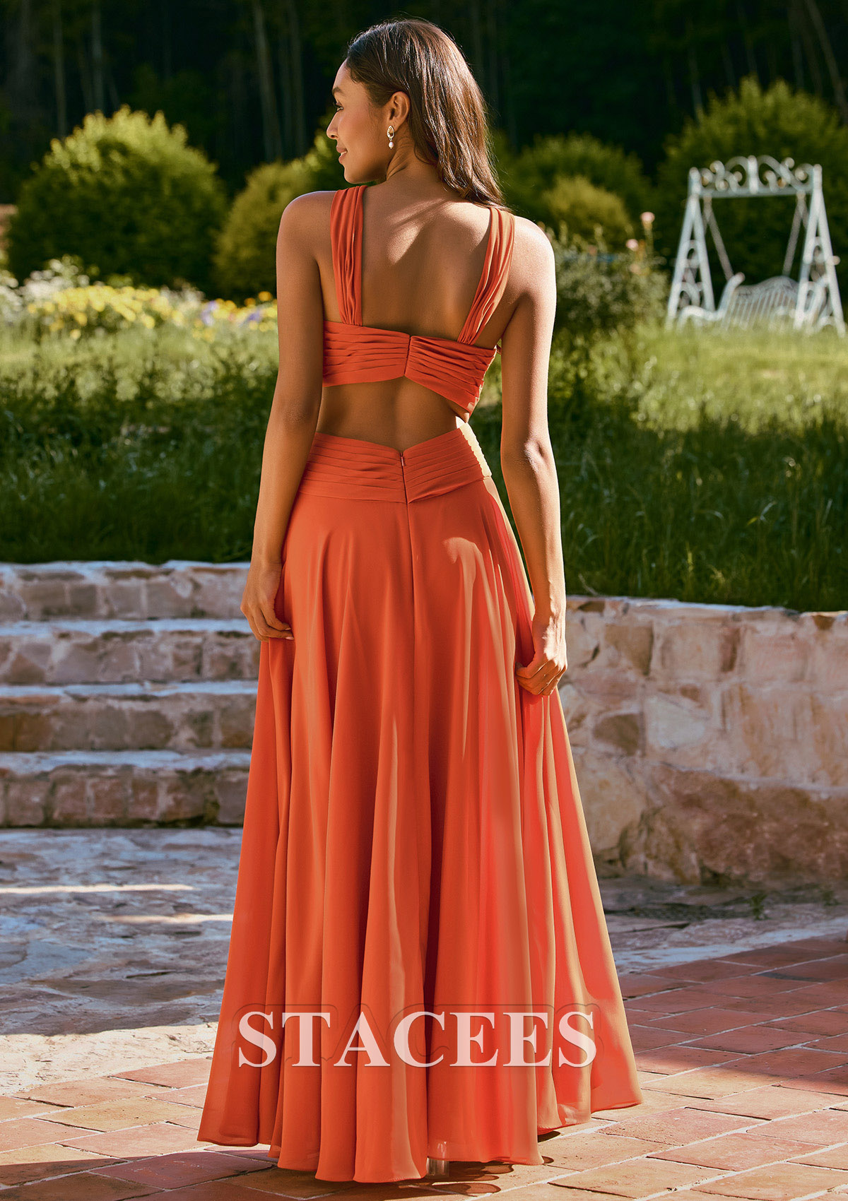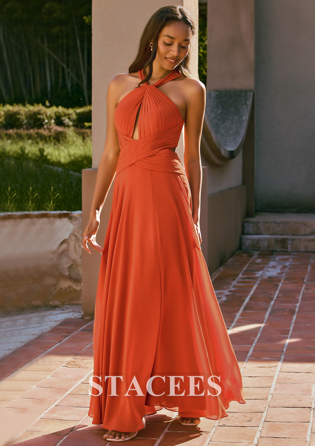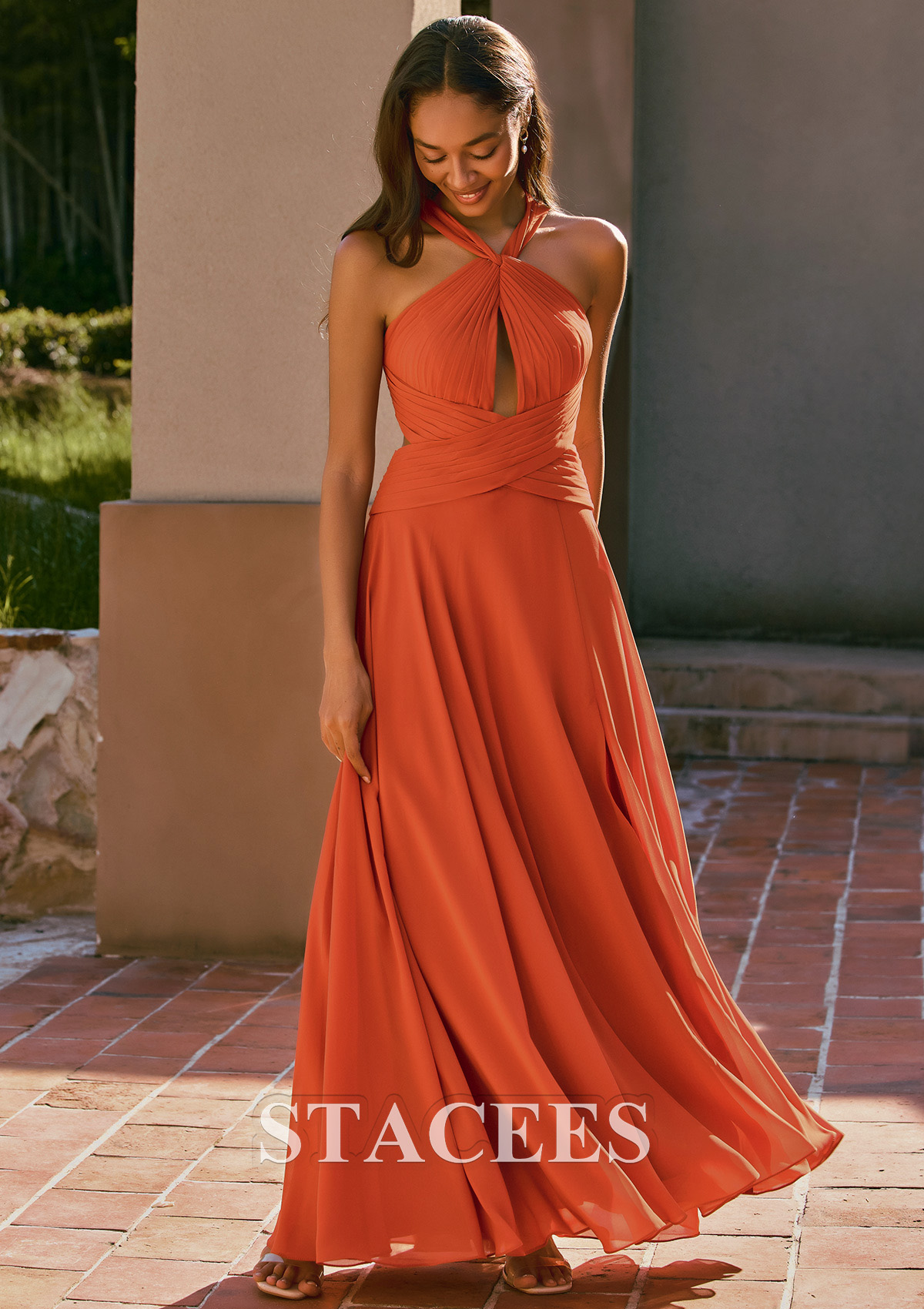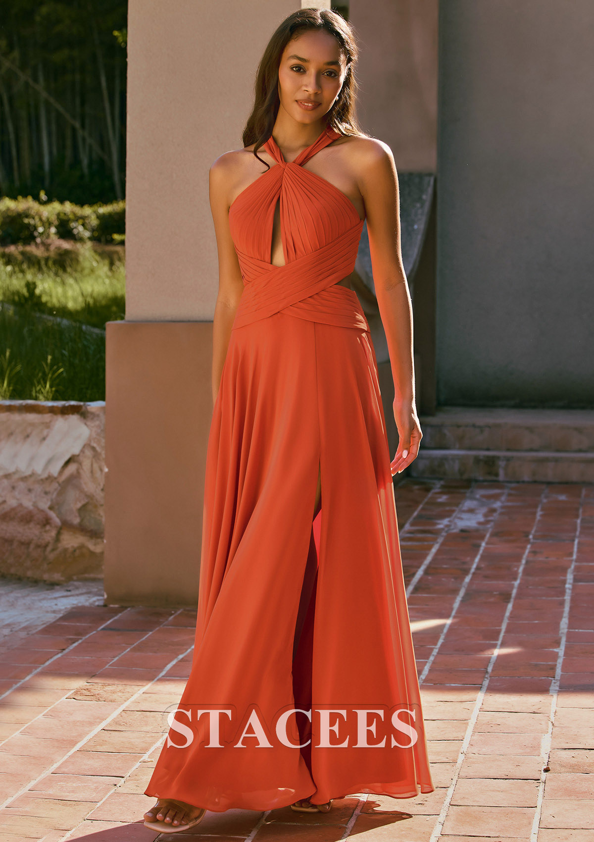 Bring warm, sunset tones to your bridal party with this chiffon halter bridesmaid dress from Stacees. The bodice features fine pleating and a chic halter neckline that twists into a stylish front keyhole cutout, beautifully framing the shoulders and collarbone. A crisscross waistband wraps the torso to highlight the natural waist and create a flattering hourglass shape. The flowy chiffon A‑line skirt cascades softly to the floor, giving the dress a romantic, airy movement with every step. A front slit adds a flirty touch while making it easy to walk and dance all night long. From the back, this gown stuns with its strappy open‑back design and gathered waistband detail, offering a modern, eye‑catching look that photographs beautifully from every angle. Perfect for boho, rustic, outdoor, barn, vineyard, and beach weddings, this orange bridesmaid dress complements autumn palettes and sunset ceremonies especially well. Style it with nude or gold heels, loose waves, and delicate jewelry for an effortless, bohemian‑inspired bridal party look. Thanks to its on‑trend color and flowy silhouette, this dress also works as a formal evening gown, prom dress, or special‑occasion maxi dress you can rewear beyond the wedding day.