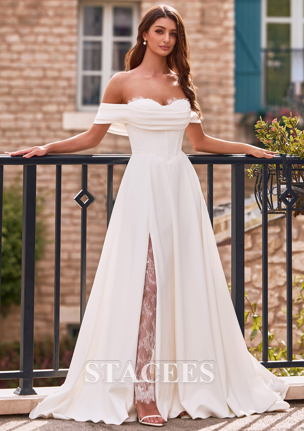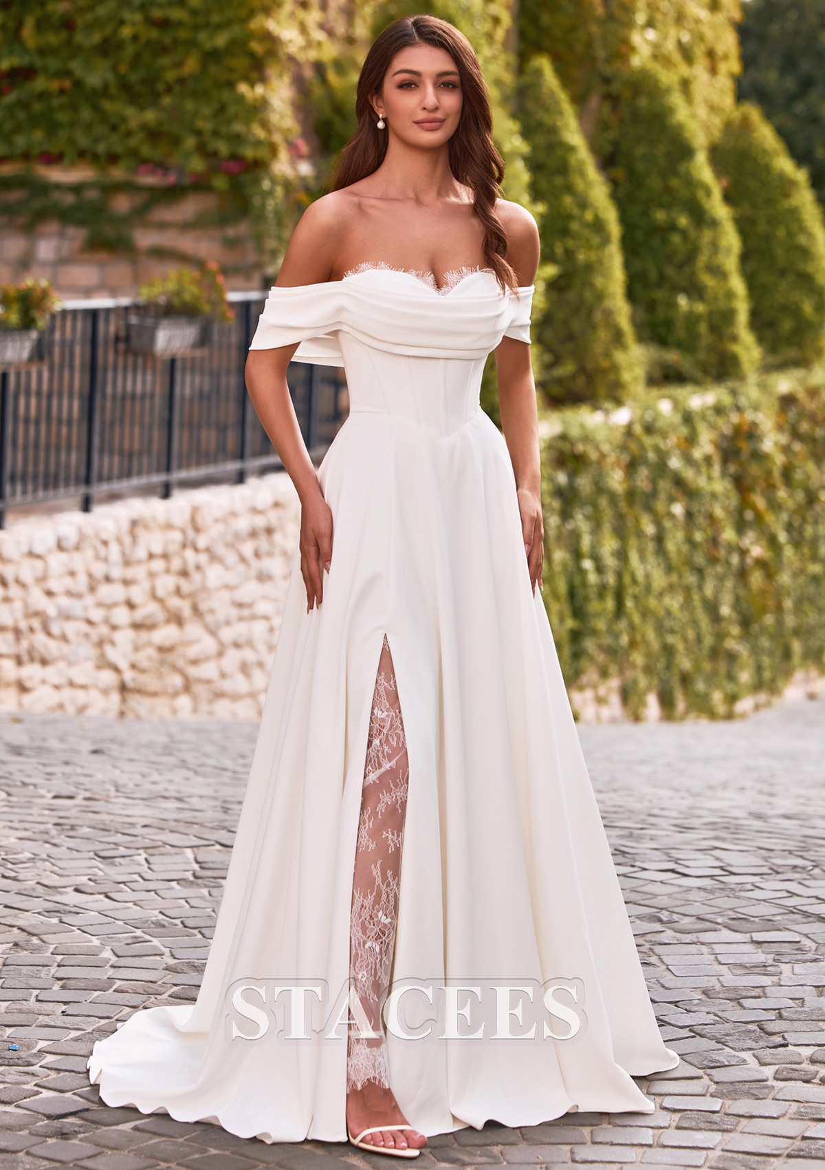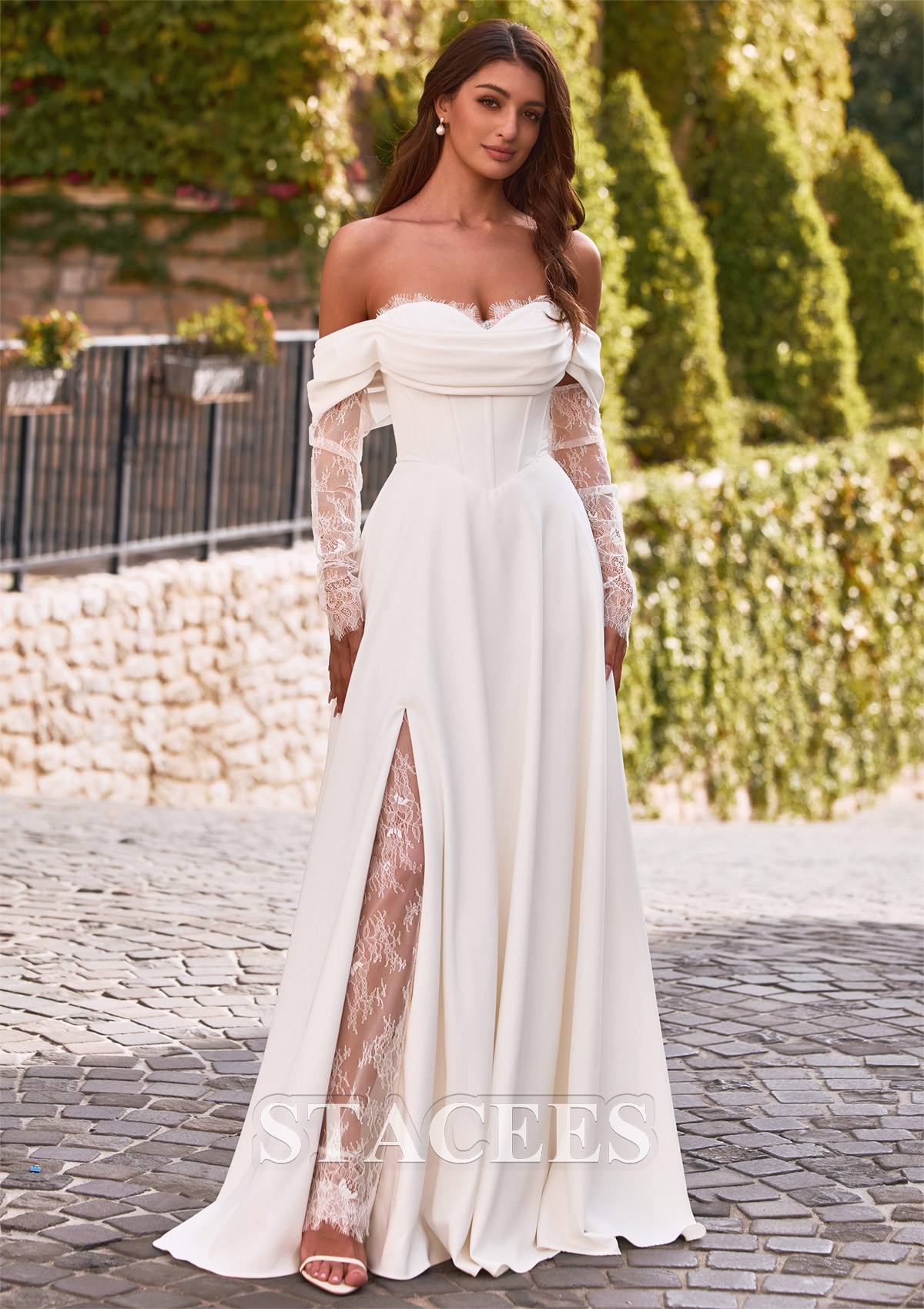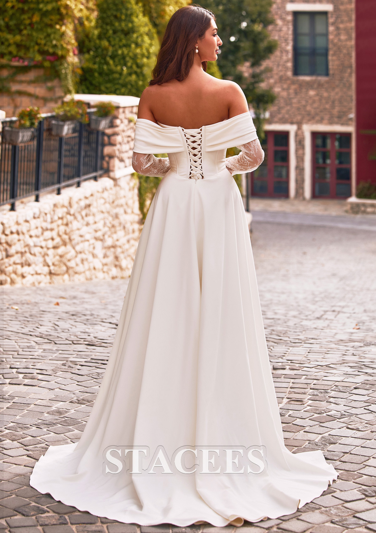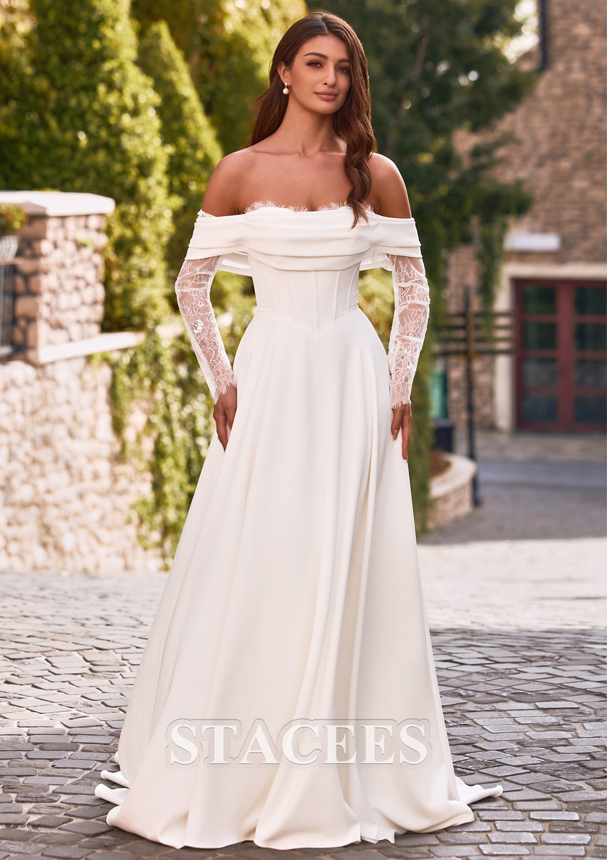 This romantic A-line wedding dress features an elegant off-the-shoulder neckline that gracefully frames the collarbone and shoulders, creating a soft and enchanting feminine silhouette. Sheer long lace sleeves add a touch of vintage charm and delicate sophistication. The back is finished with a lace-up design, allowing for an adjustable fit while enhancing the gown with a classic bridal detail. Perfect for brides who appreciate romance, elegance, and refined beauty.