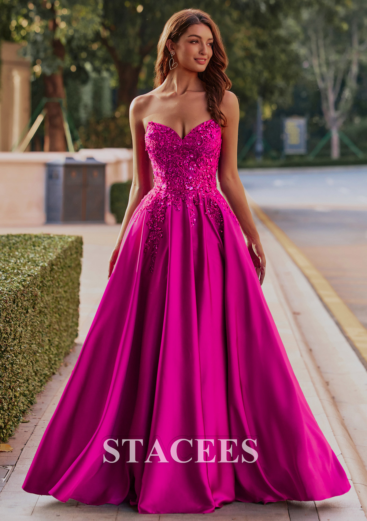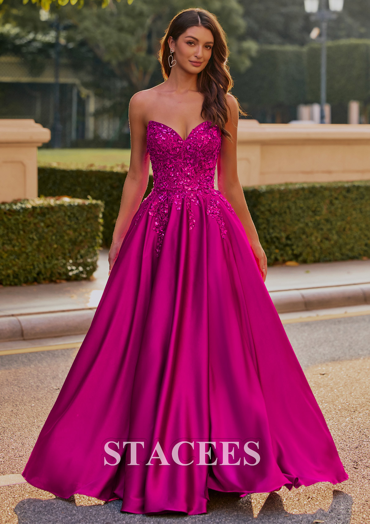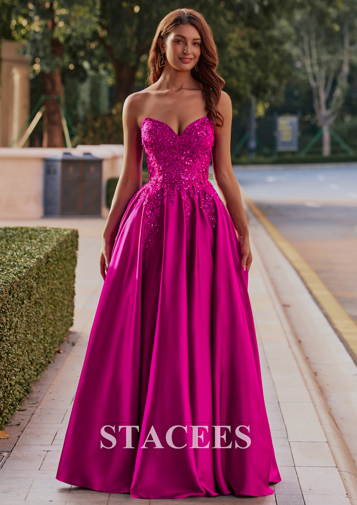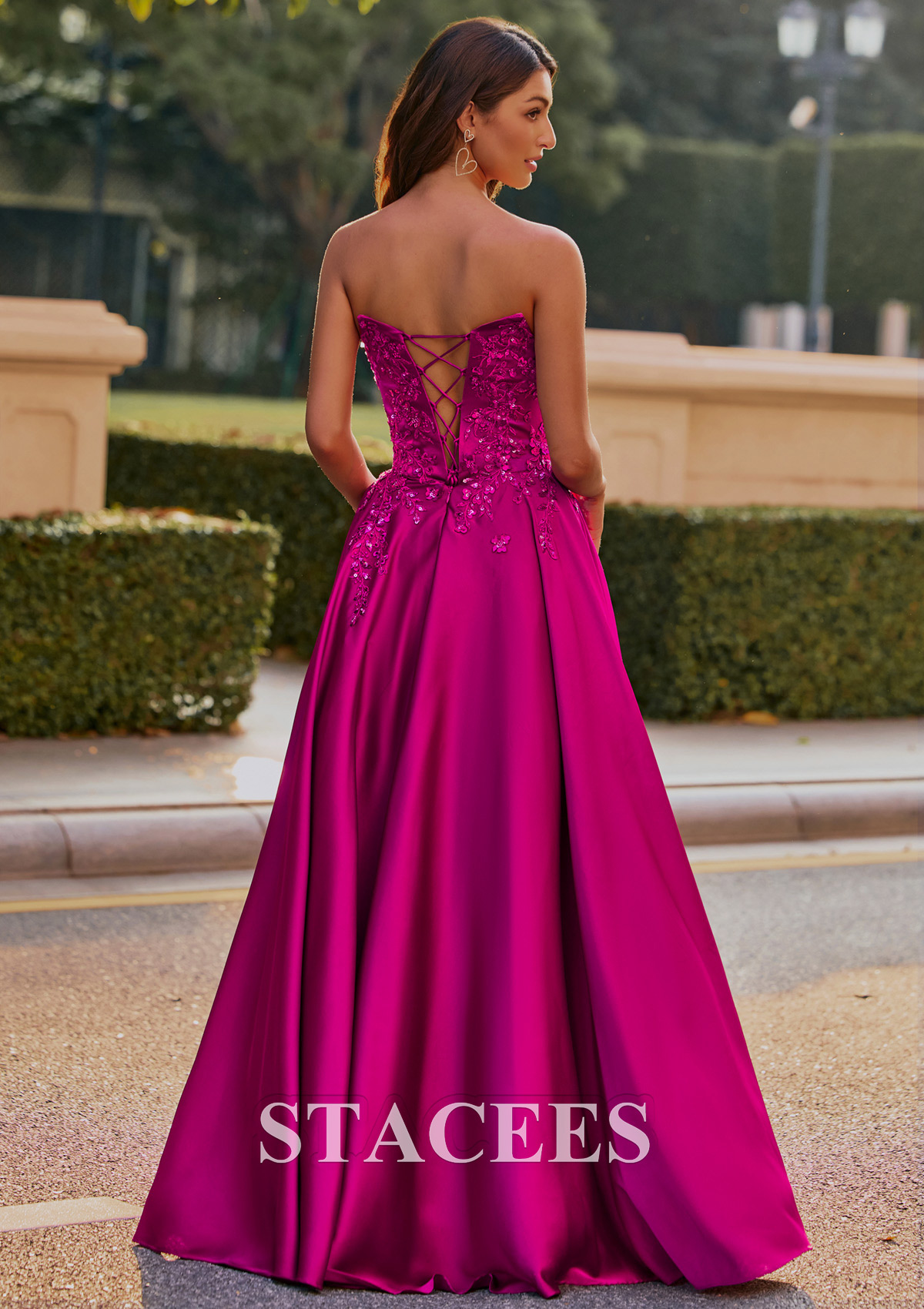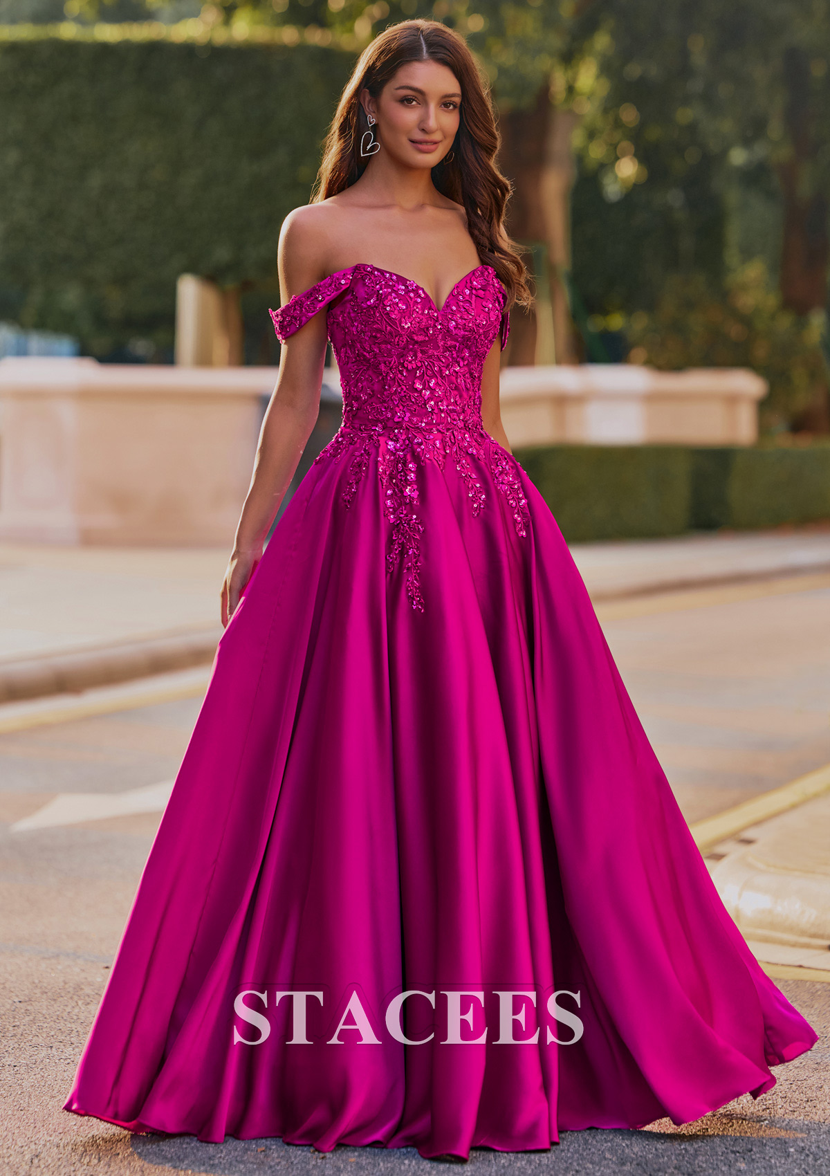 This breathtaking formal gown showcases a rich satin with a dramatic, voluminous ball gown skirt, perfect for making an entrance at any formal event. The bodice is richly detailed with intricate floral applique and shimmering beadwork, creating a glamorous, textured look. Off-the-shoulder detachable straps add an elegant, feminine touch, while the corset-style lace-up back provides both structure and adjustability. From the front, detailed embroidery extends down from the structured bodice, blending beautifully into the full, flowing skirt. The middle view highlights the ornate embellishments and graceful draping of the neckline and straps. The detachable straps make this dress more versatile, you can wear it in two different ways! Turning to the back, the gown reveals a glamorous lace-up corset, allowing for an adjustable, flattering fit while mirroring the embellishment motif of the front. This striking dress is ideal for prom, galas, or weddings, combining classic ball gown drama with contemporary, eye-catching color and details.