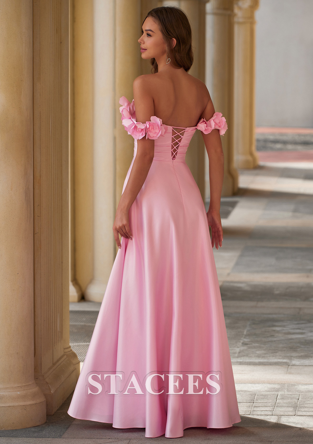 Steal the spotlight in this romantic prom dress, designed for anyone who loves soft, feminine elegance. The smooth, satin-like fabric creates a clean, luxurious finish that catches the light beautifully while still feeling comfortable and flowy. A straight, off-the-shoulder neckline frames your collarbones, and a draped fitted ruched bodice cinches the waist to create a flattering, hourglass silhouette. Delicate 3D floral applique straps sit gracefully on the upper arms, adding a dreamy, garden-inspired touch without overwhelming the minimalist design. The full A-line skirt falls effortlessly to the floor, giving you plenty of movement for dancing while maintaining a classic, formal look. From the back, the gently scooped off-shoulder design and smooth seams keep the gown sleek and polished, ideal for prom, bridesmaid dresses, formal parties, and evening events, this pink off-the-shoulder gown is a beautiful choice if you want a simple yet romantic statement. Style it with soft curls, dainty jewelry, and strappy heels for a complete, princess-worthy look.