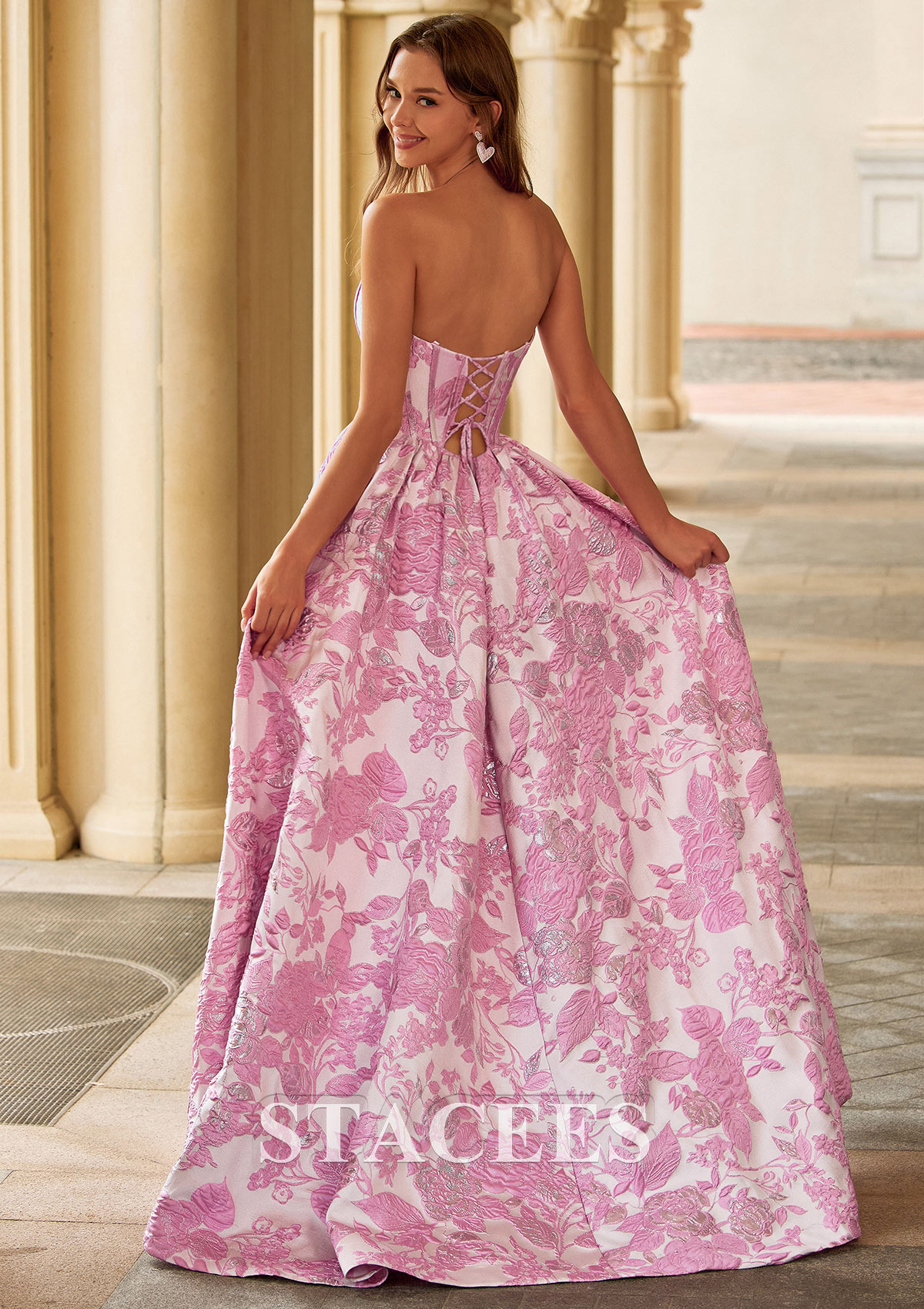 Make a statement at prom in this romantic rose floral ball gown prom dress. The strapless, structured bodice features vertical seaming that sculpts and supports, creating a flattering, cinched-in waist. Crafted in a luxurious pink and light-toned metallic jacquard fabric with an allover floral pattern, this long formal dress looks rich and elegant when wearing. The full A-line skirt flows to the floor for classic ball gown drama, while the high front slit adds a modern, eye‑catching touch that shows off your legs and shoes as you walk. From the back, the clean, structured bodice and voluminous skirt create a timeless silhouette that is perfect for prom, formal galas, pageants, and dressy spring or summer events. Pair this pink floral strapless prom dress with metallic heels and delicate jewelry for a sophisticated, feminine look.