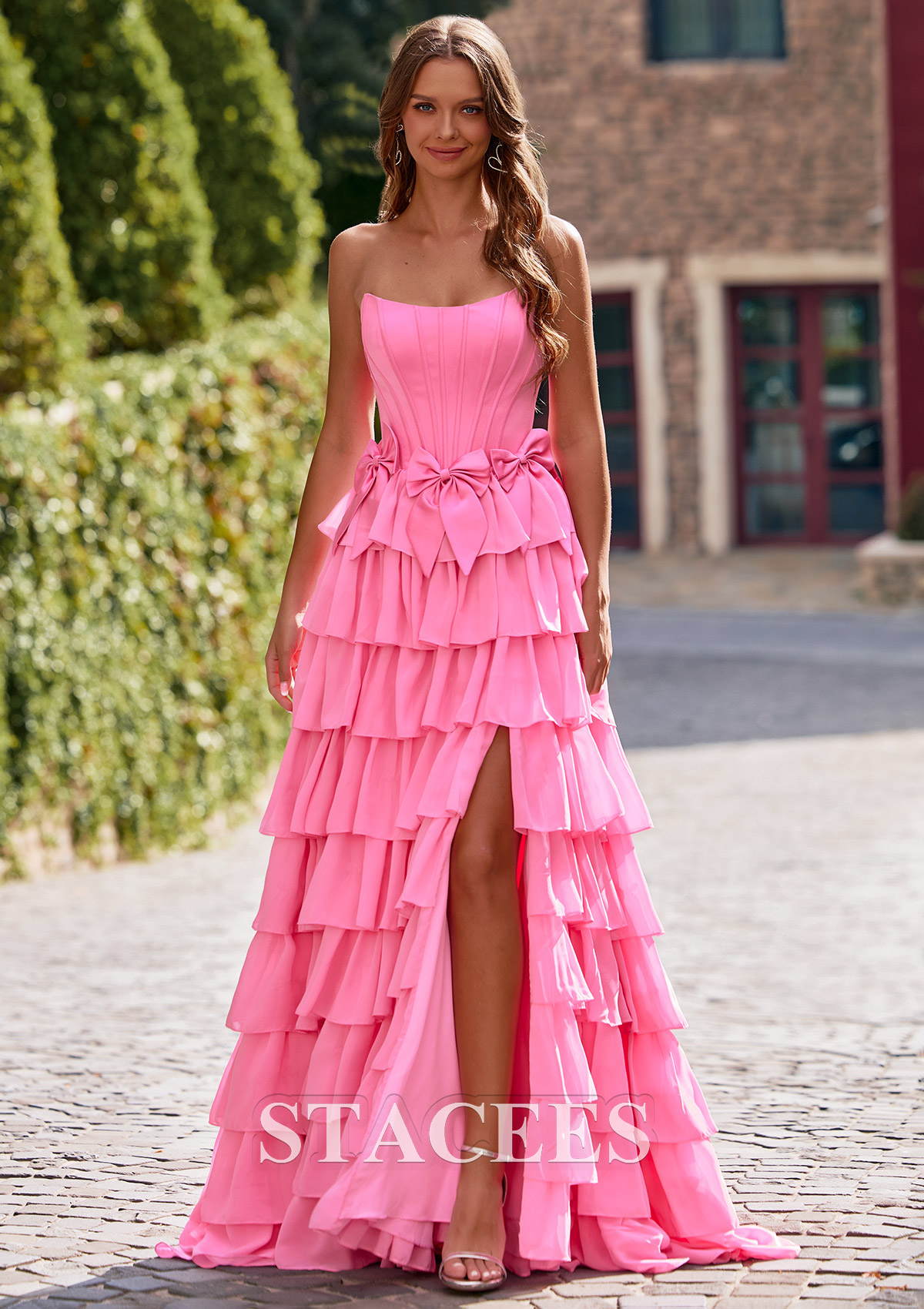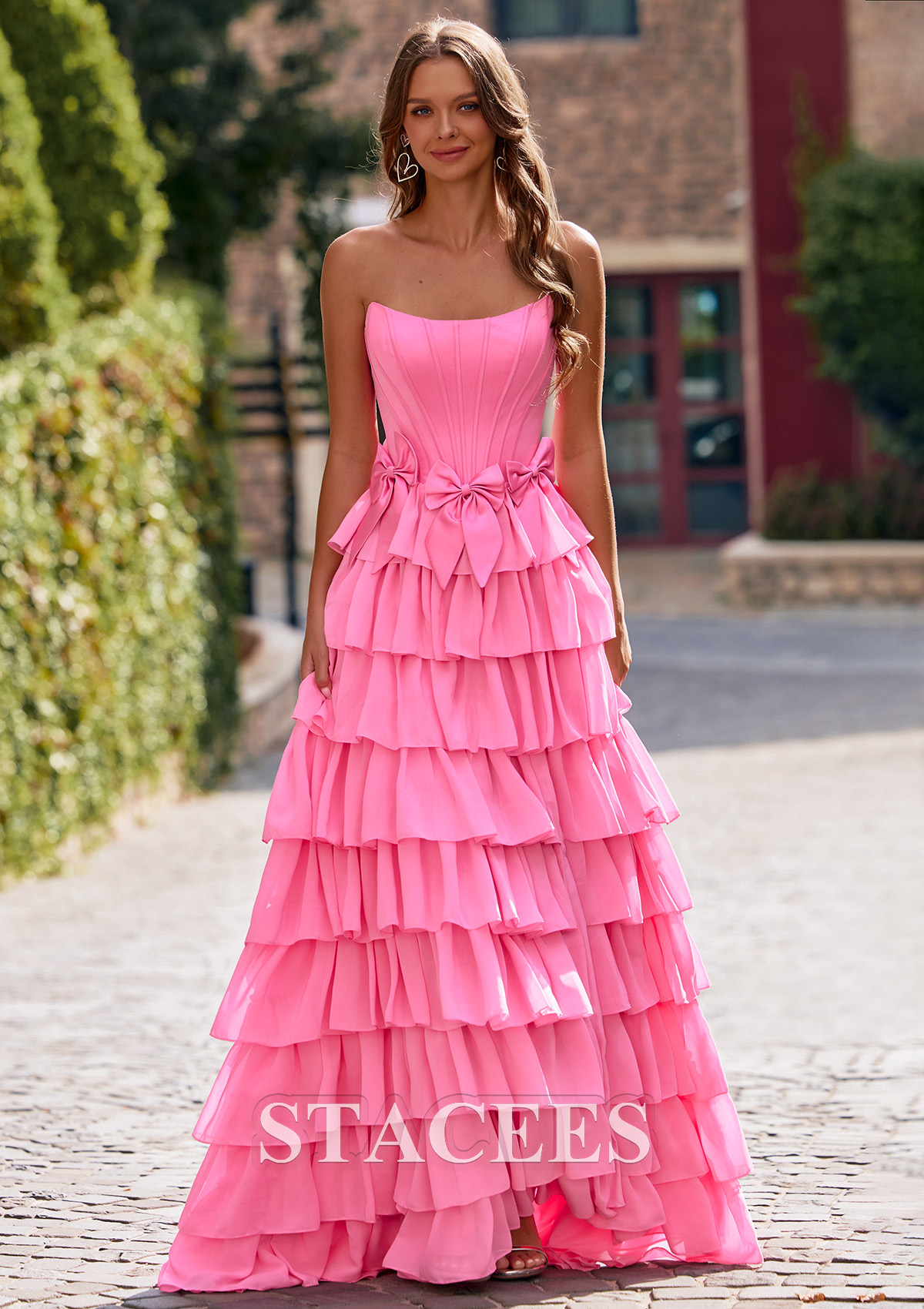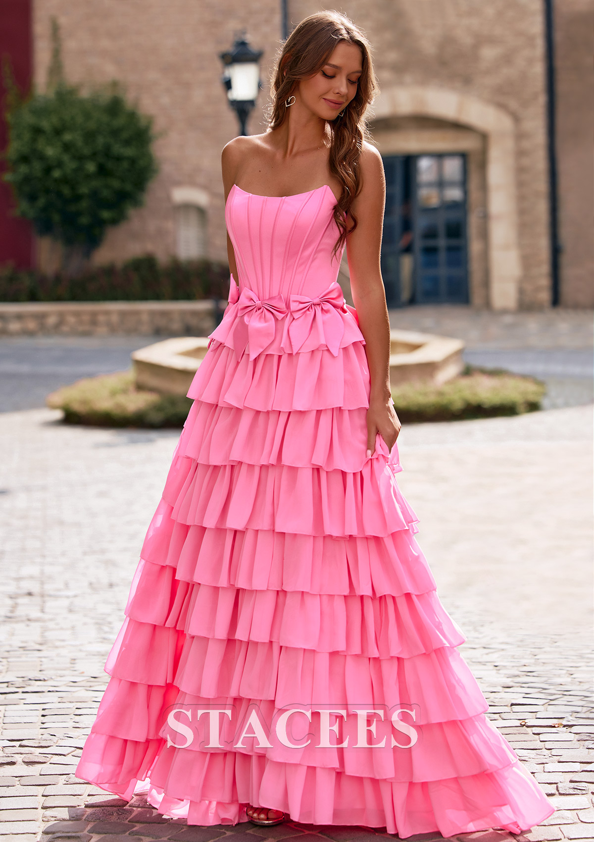 A-line Strapless Corset Chiffon Tiered Ruffle Prom Dress with Bows S8875P - Prom Dresses - Stacees
