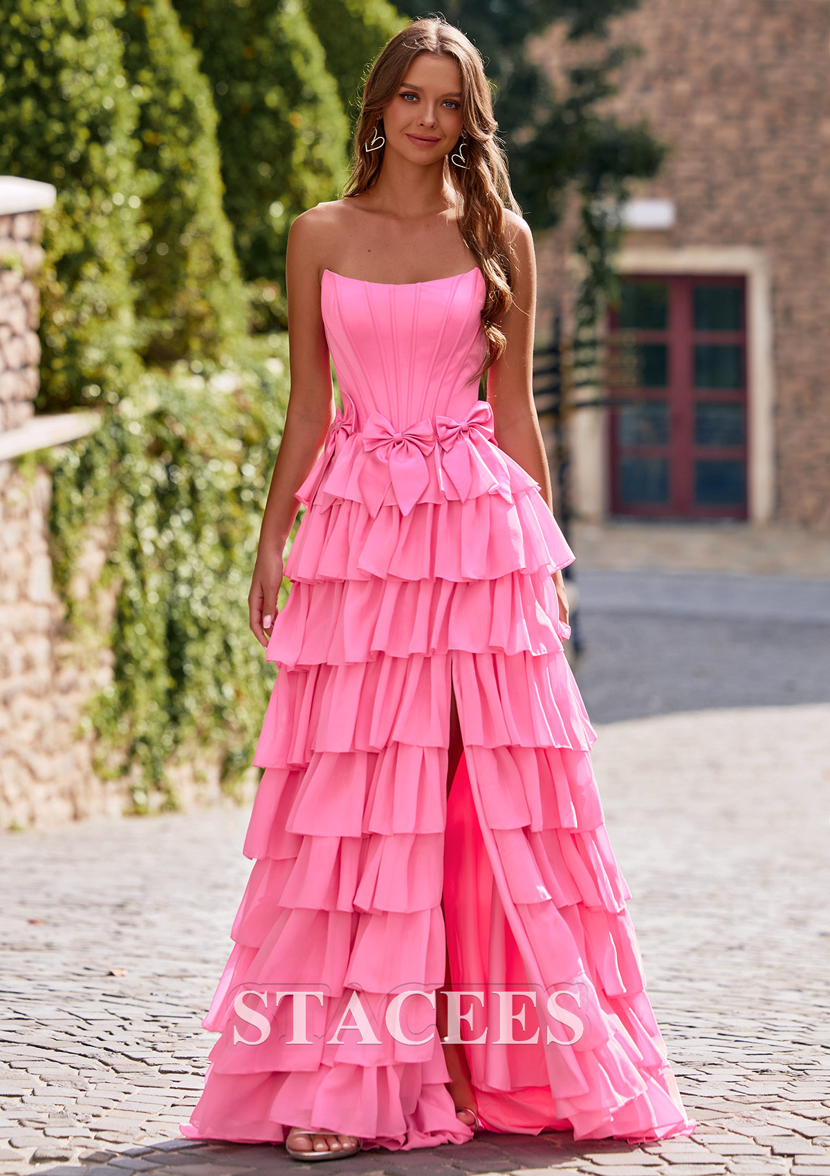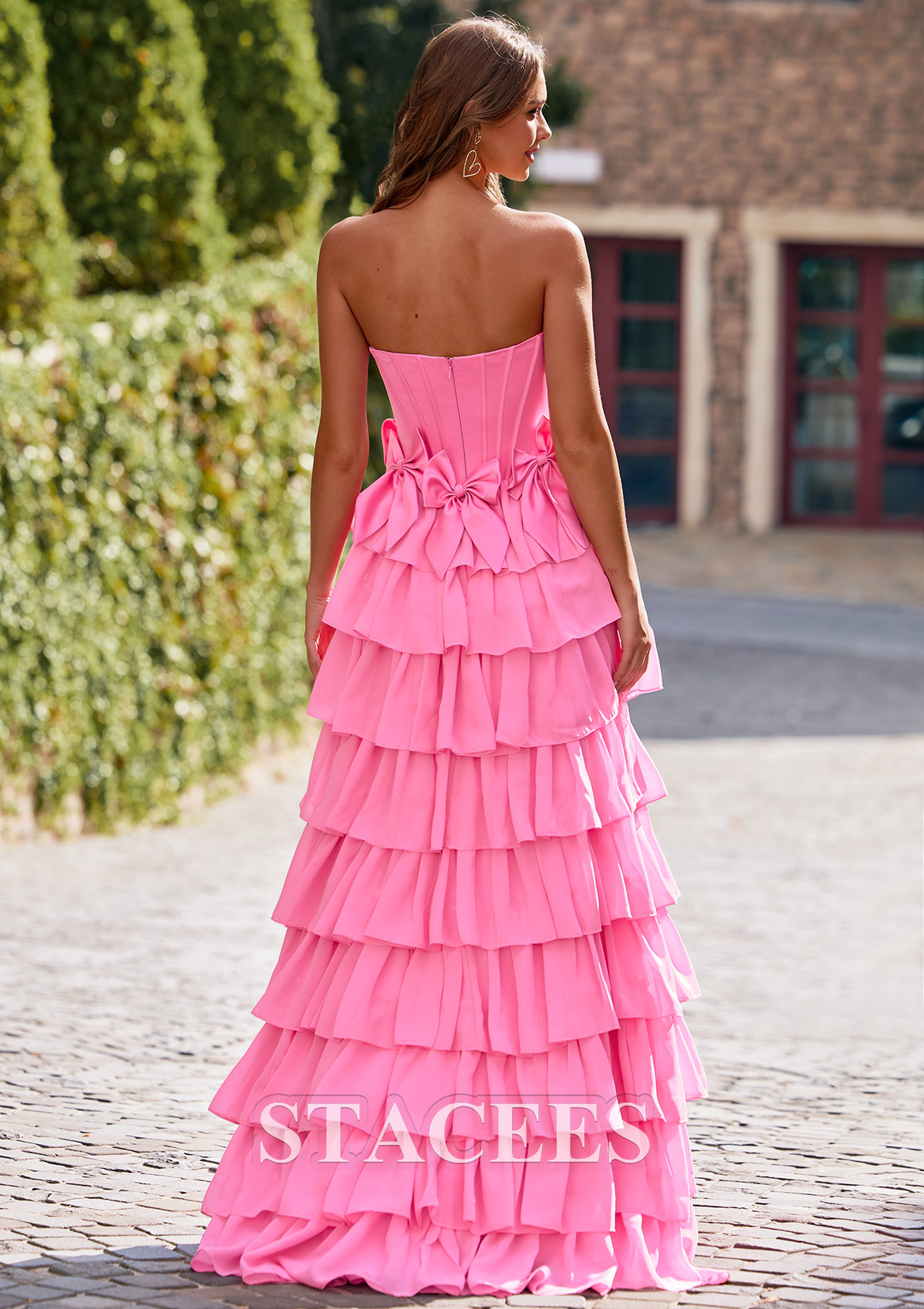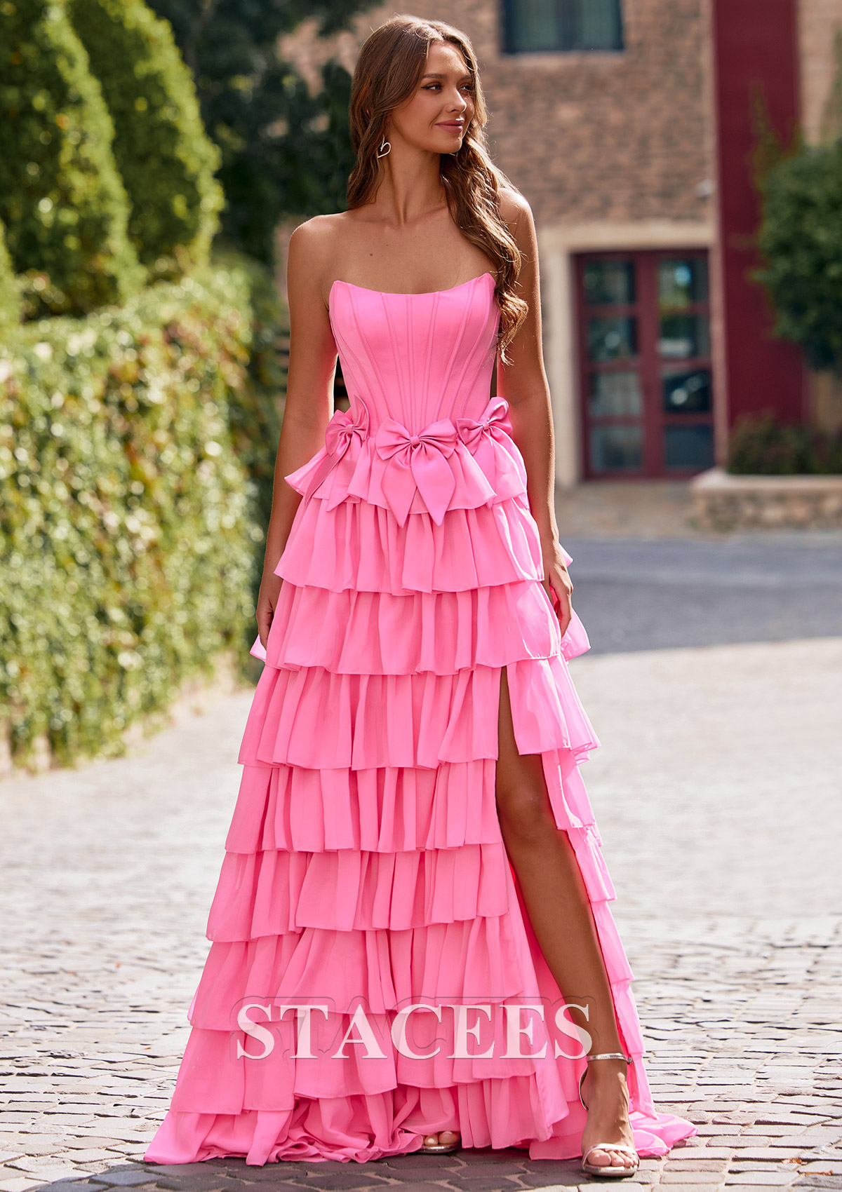 A-line Strapless Corset Chiffon Tiered Ruffle Prom Dress with Bows S8875P - Prom Dresses - Stacees