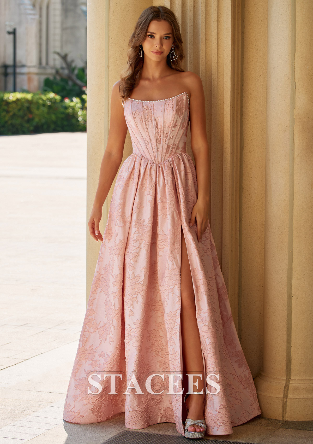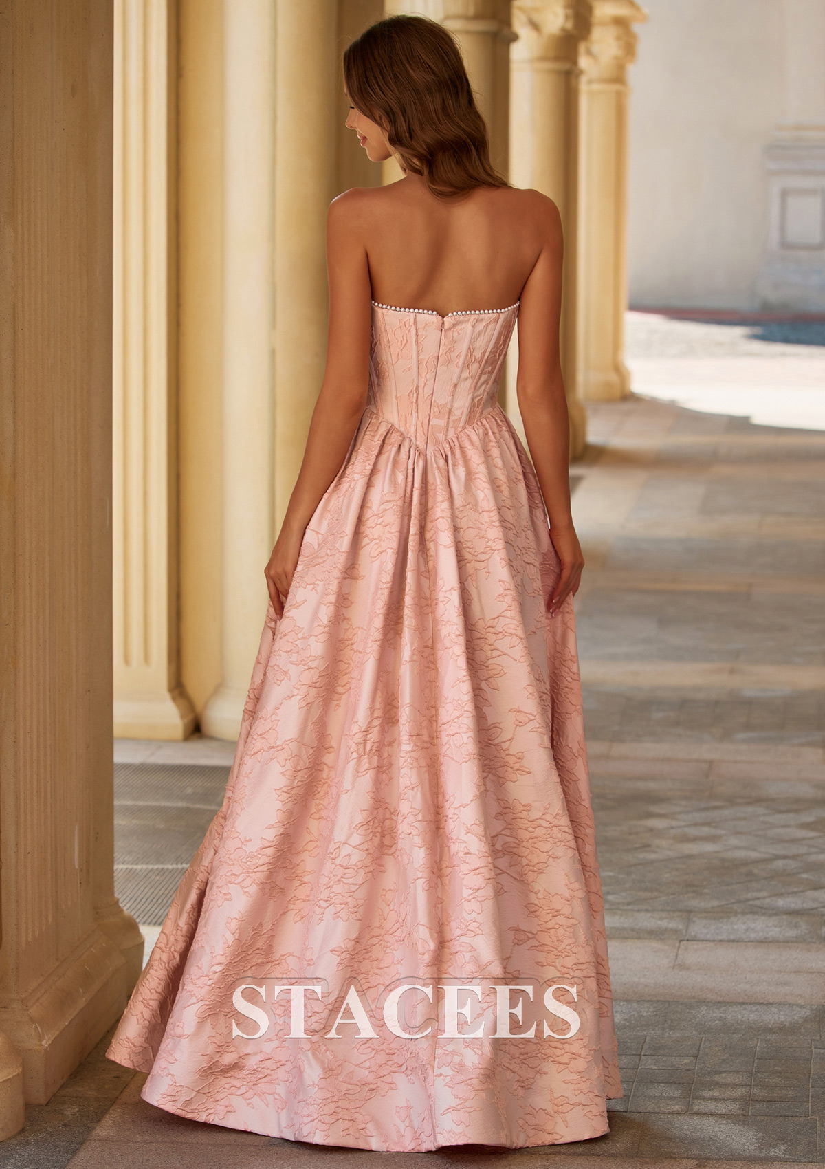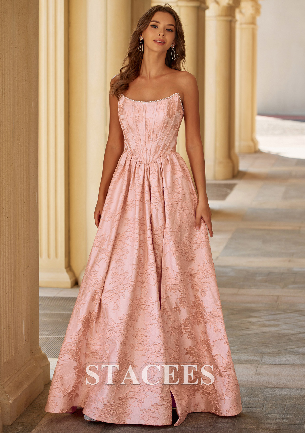 A-line Strapless Corset Floral Jacquard Prom Dress with High Slit Pockets S9035P- Prom Dresses - Stacees