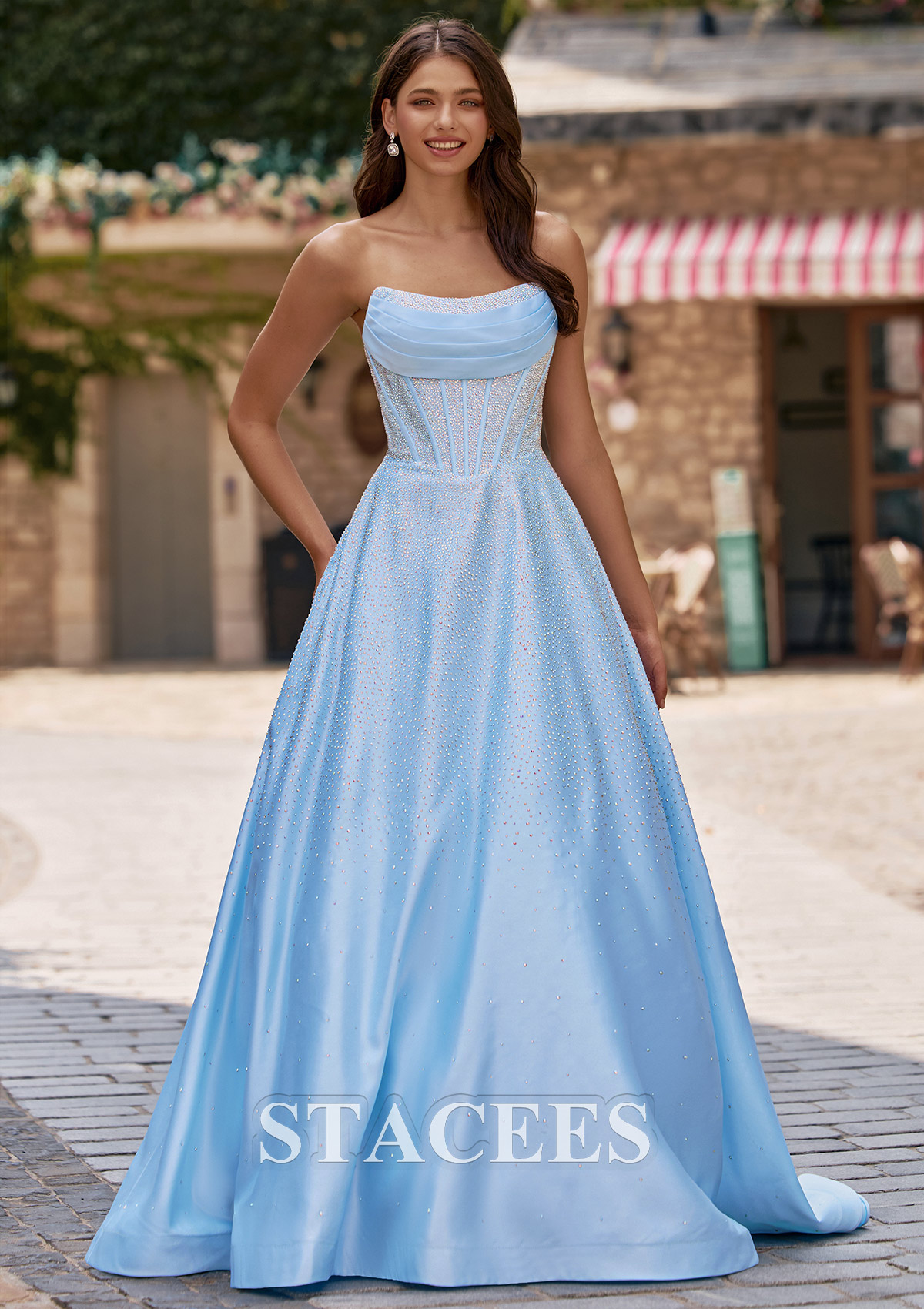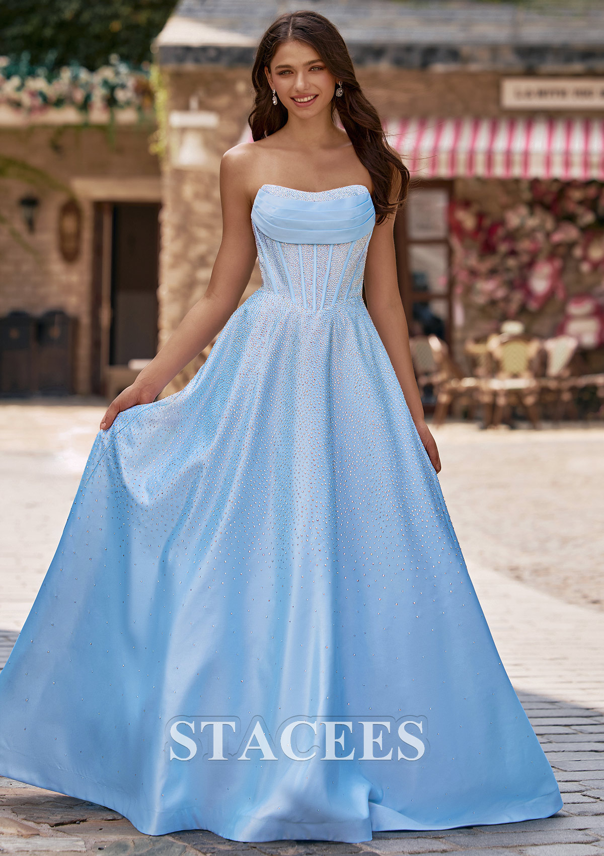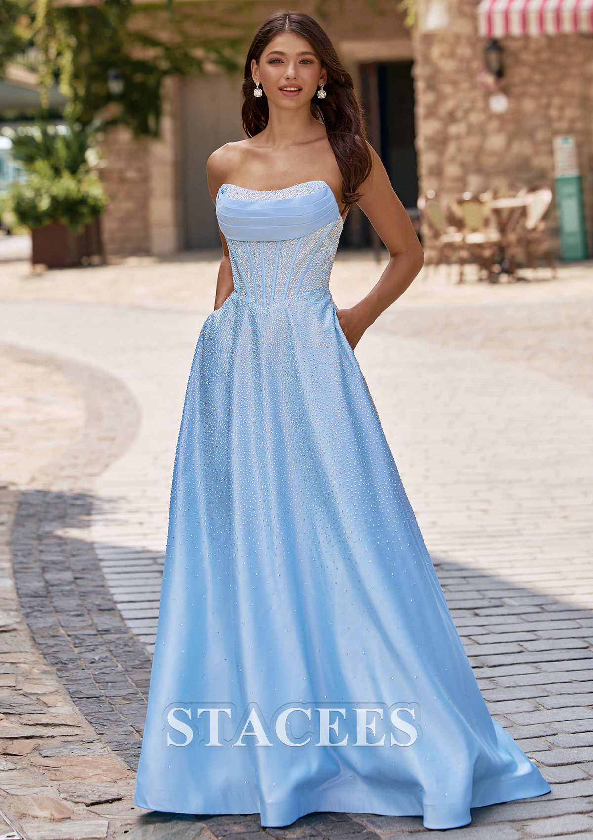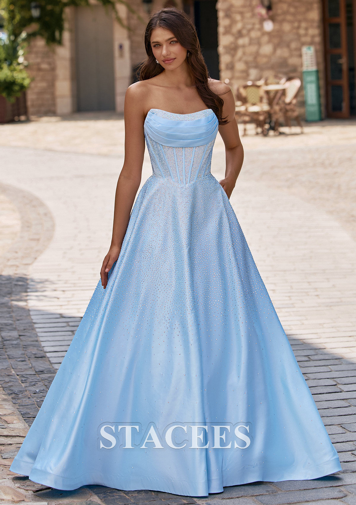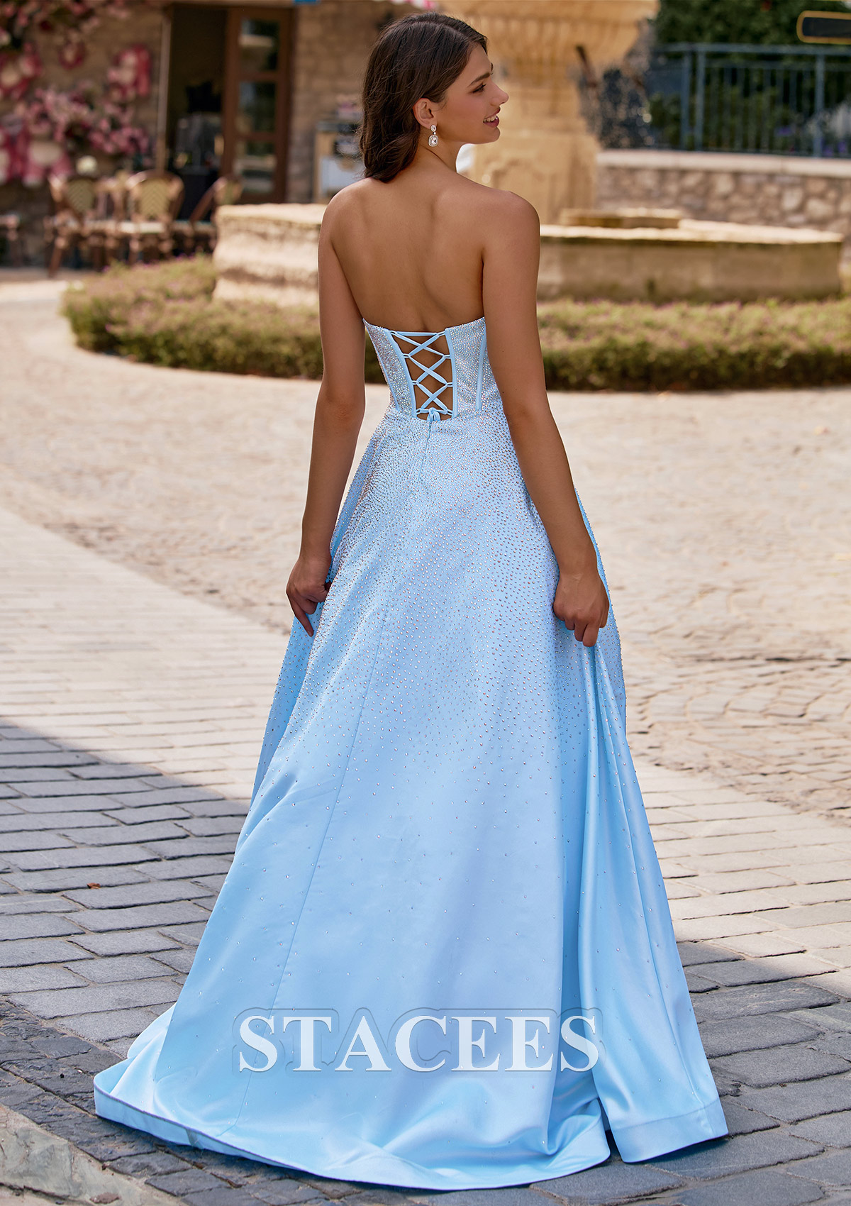 This enchanting prom dress features a shimmering fabric that flows gracefully to the floor in an A-line silhouette. The strapless neckline is softly draped, creating a romantic and elegant look, while the bodice is structured with visible corset-style boning for added support and shape. Sparkling hot fix embellishments are scattered throughout the entire dress, catching the light for a dazzling effect. The back of the gown showcases a chic lace-up corset detail, offering an adjustable and flattering fit. Perfect for prom or any formal evening occasion, this gown combines timeless beauty with a touch of modern sparkle.