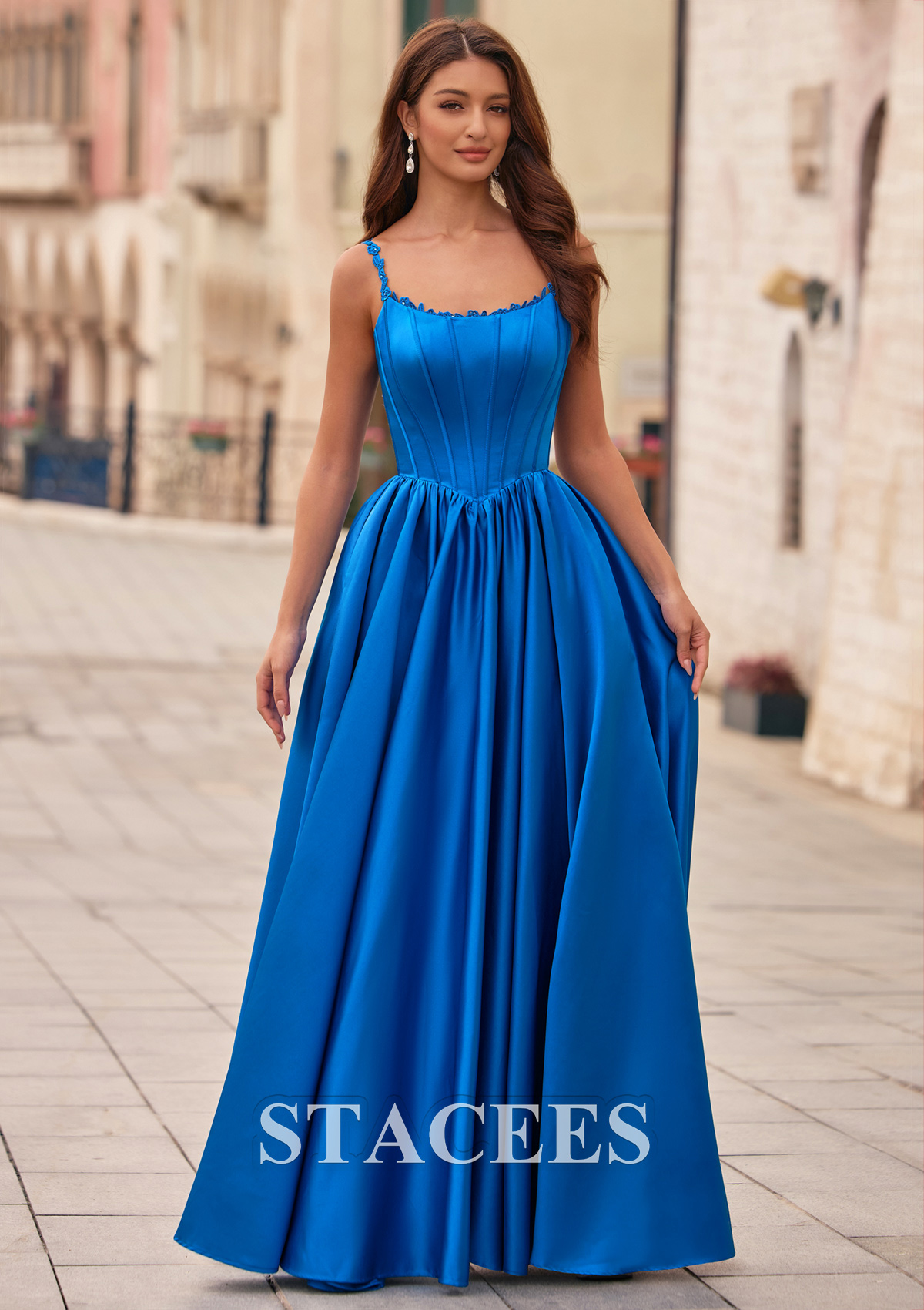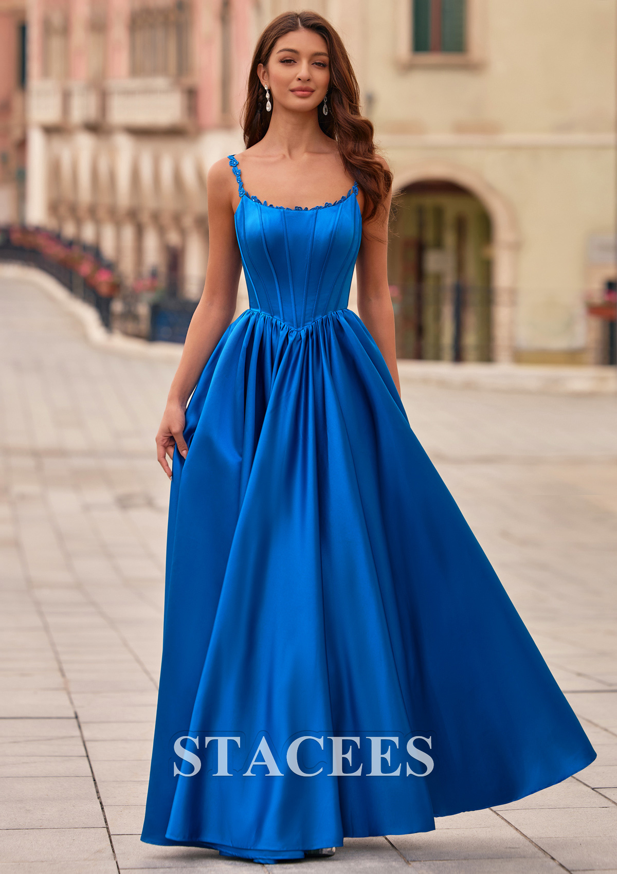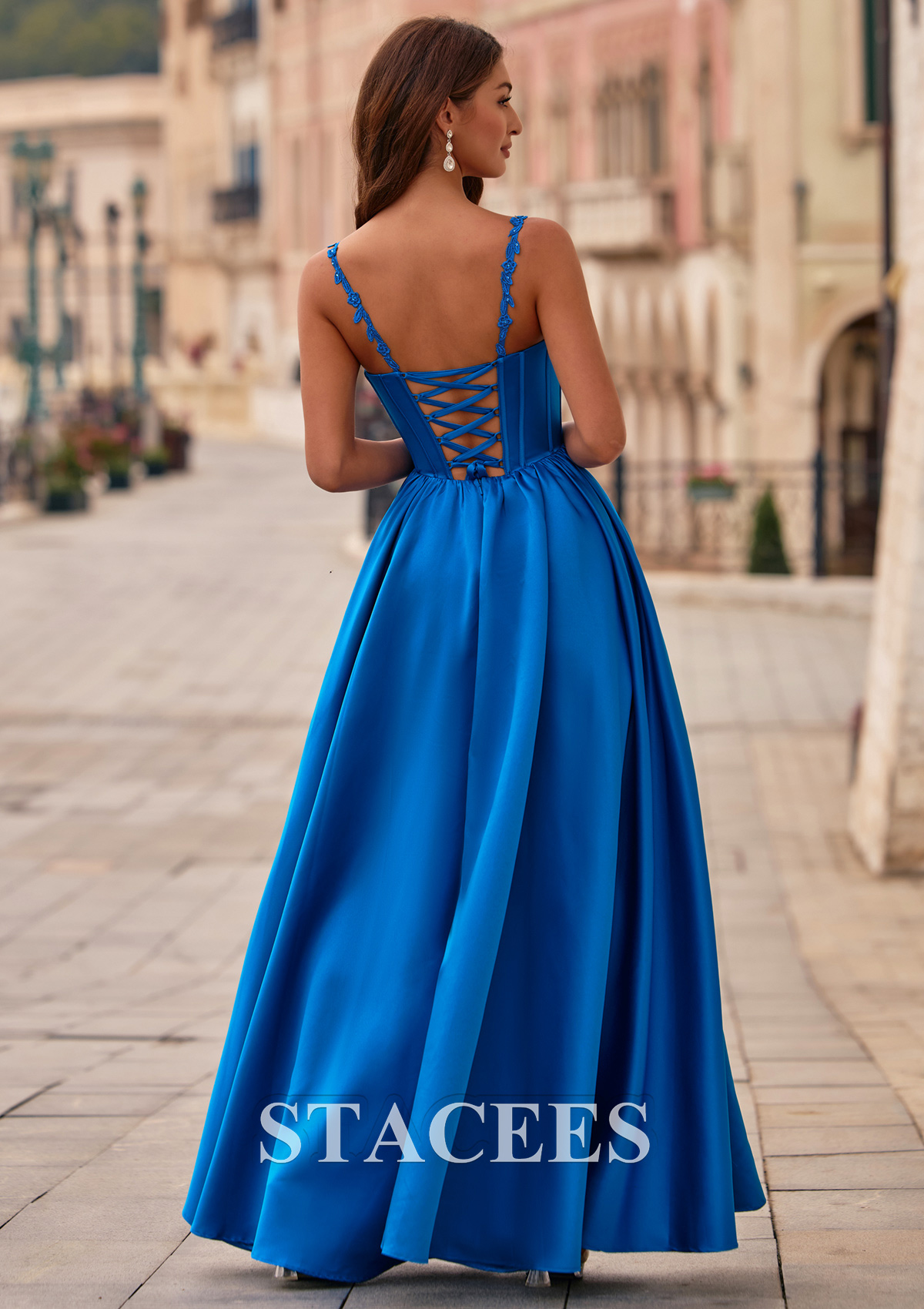 Step into the spotlight with this stunning long ball gown prom dress, designed to turn heads at any formal event. This floor-length ball gown features a beautifully structured corset bodice with delicate lace spaghetti straps and subtle ruffle trim at the neckline for a romantic touch. The fitted top gives way to a voluminous, flowy skirt that drapes gracefully to the floor, offering both movement and drama. Practical pockets add a modern twist to the classic silhouette, allowing you to keep your essentials close at hand. The back showcases a chic lace-up corset detail, combining a flattering fit with timeless elegance. Crafted from high-quality satin, the vibrant blue fabric catches the light beautifully, making this dress perfect for prom, evening galas, and special occasions. Capture the magic of the night in this unforgettable blue ball gown that blends classic sophistication with contemporary style.