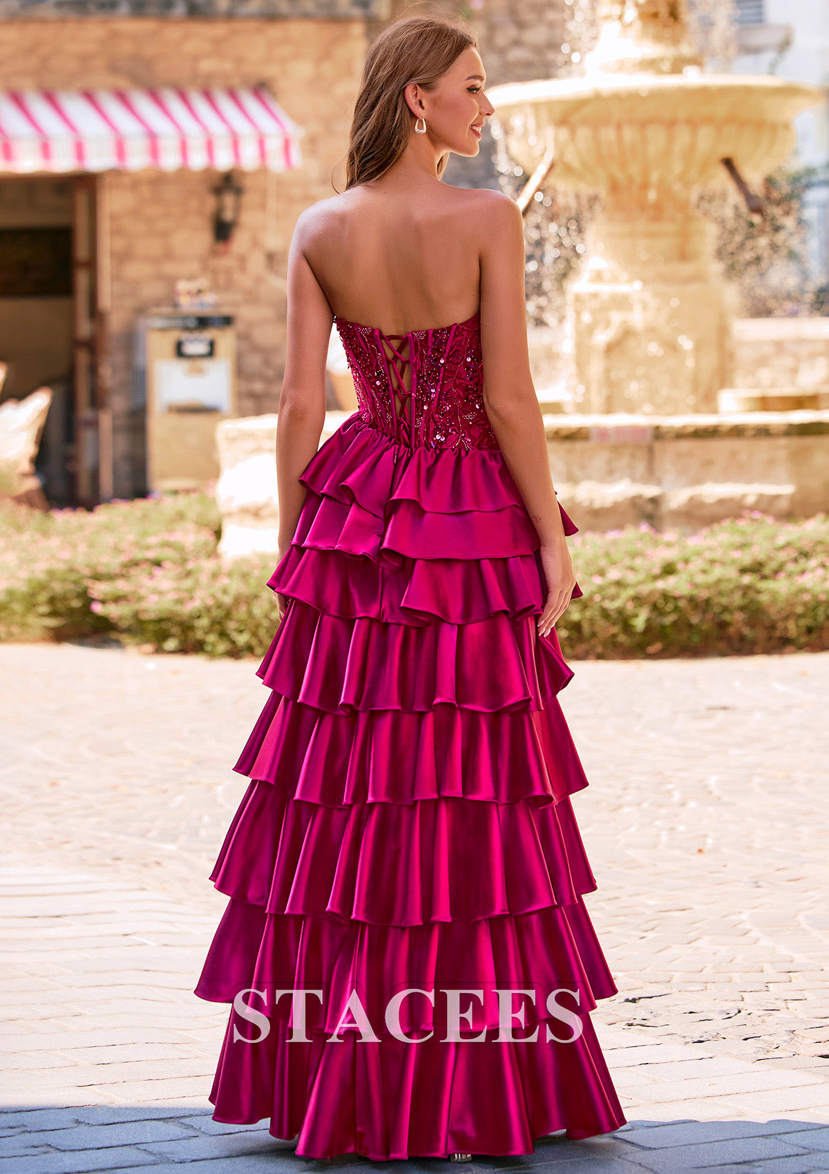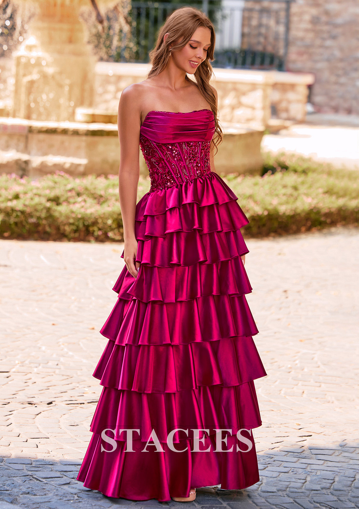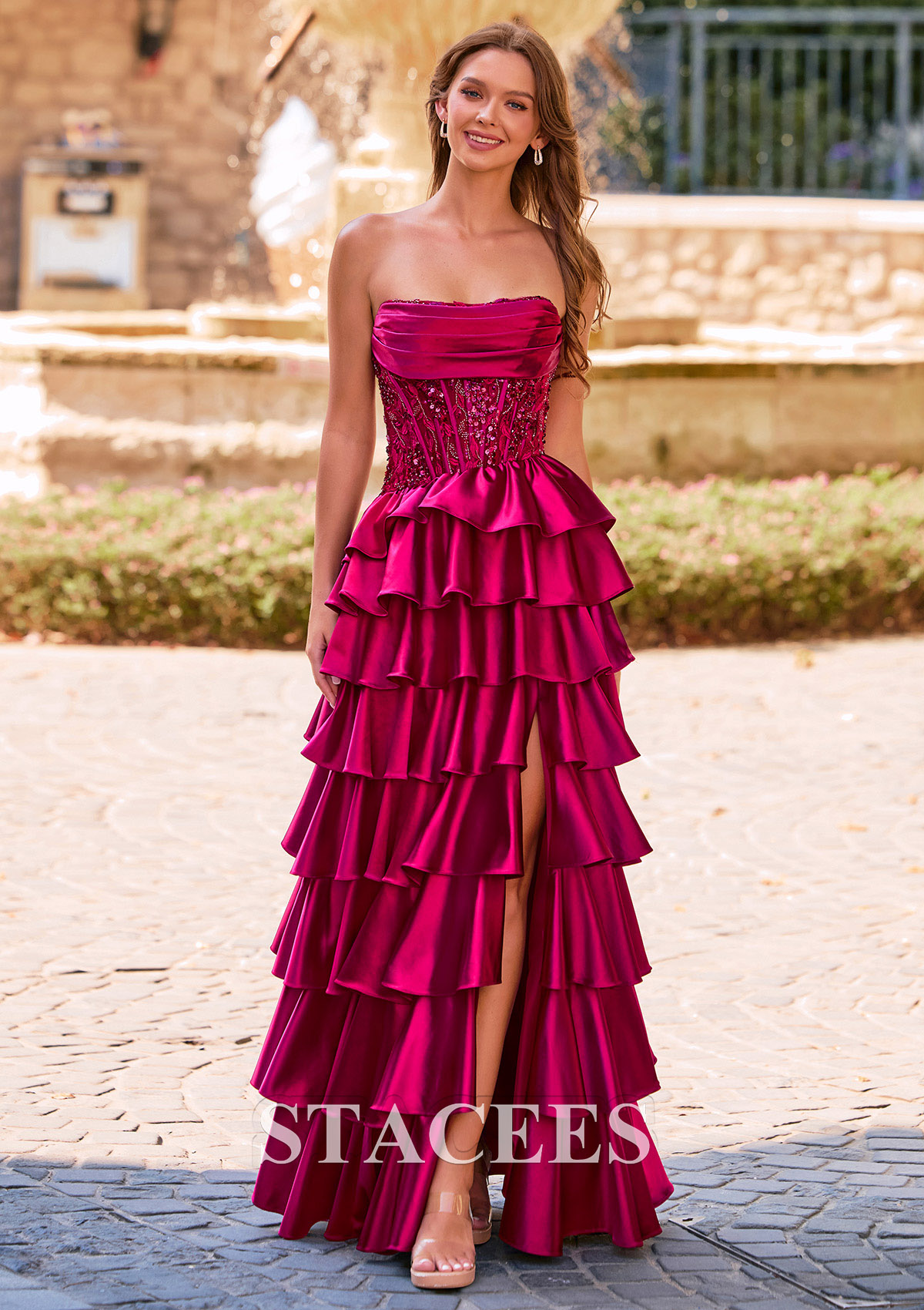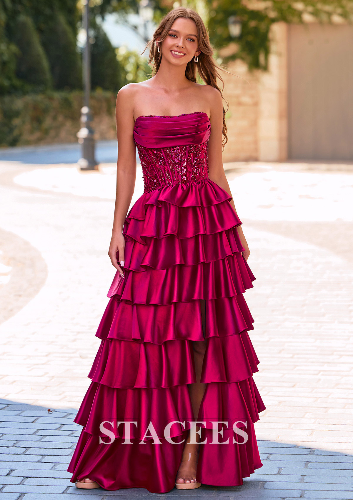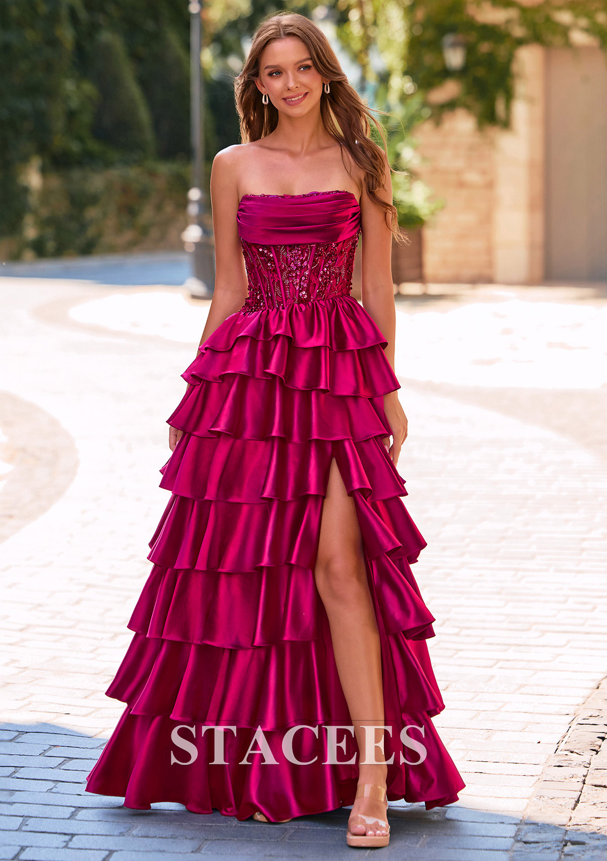 Step into the spotlight in this glamorous A-line strapless prom dress, this vibrant magenta evening gown features a romantic, layered design with multiple tiers of voluminous ruffles that cascade beautifully down the skirt. The bodice has a strapless, softly draped neckline and is adorned with sparkling embellishments adorned with intricate beadwork for a hint of glamour. The tiered ruffle design on the skirt adds a dramatic and feminine touch, creating a perfect balance of elegance and playfulness. The skirt is accentuated by a dramatic front slit, allowing for graceful movement and a show of leg. The lace-up back ensures a custom, flattering fit, making this dress as comfortable as it is stunning. This formal dress is perfect for prom or any special occasion where a head-turning look is desired, combining bold color, intricate texture, and sophisticated design.