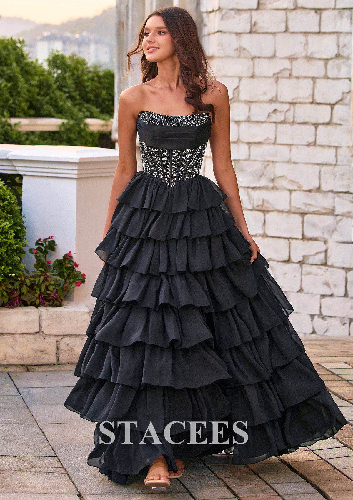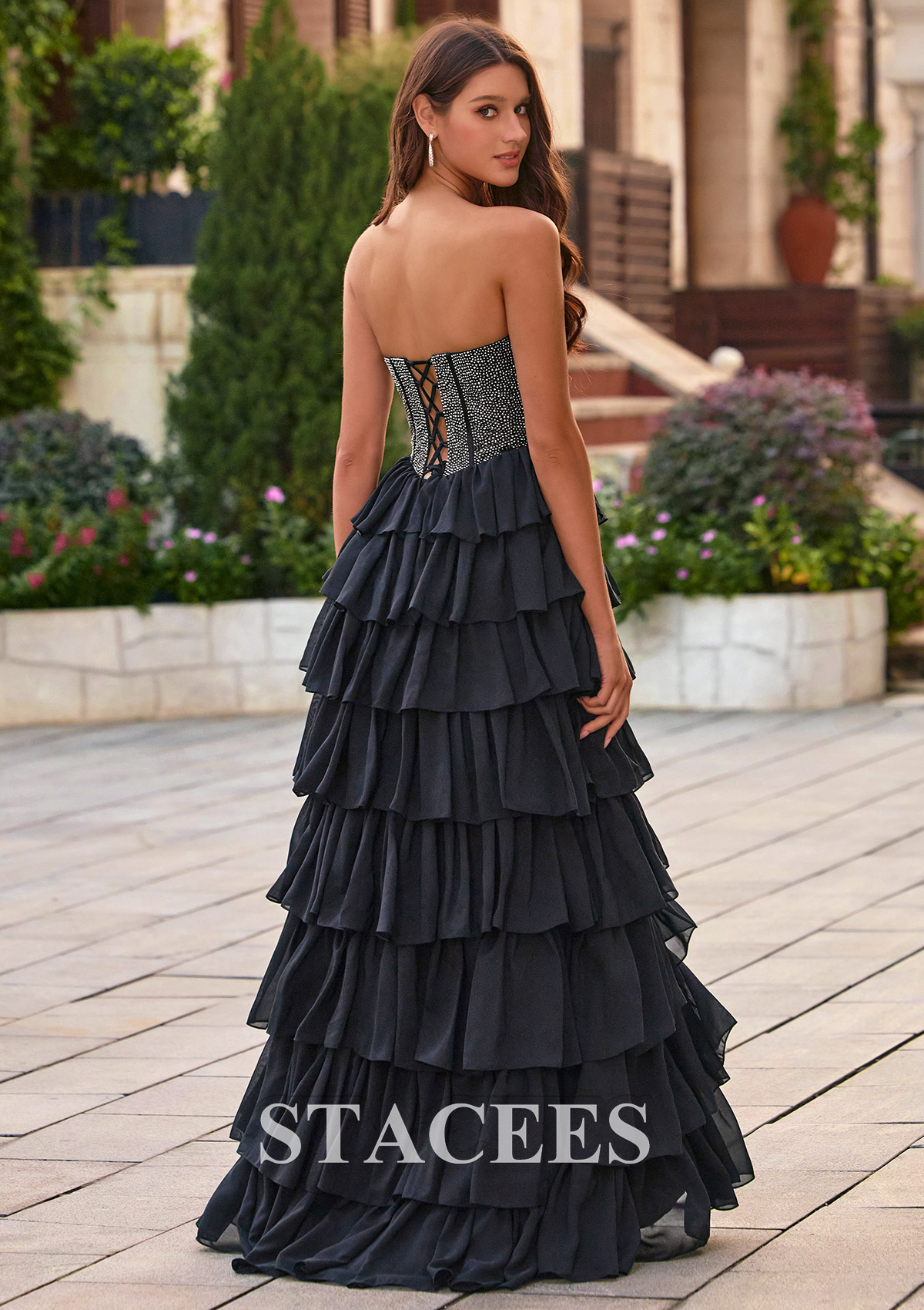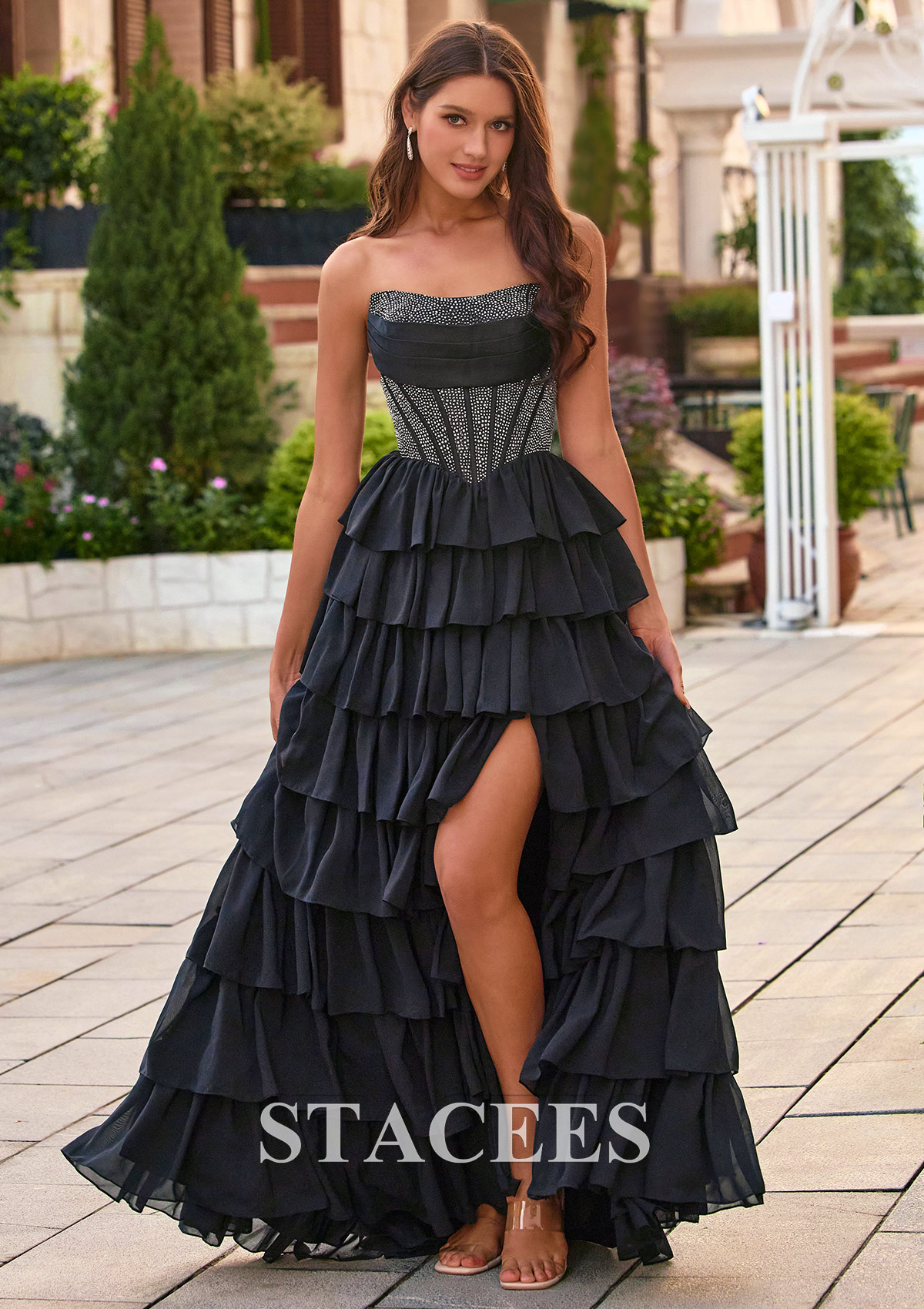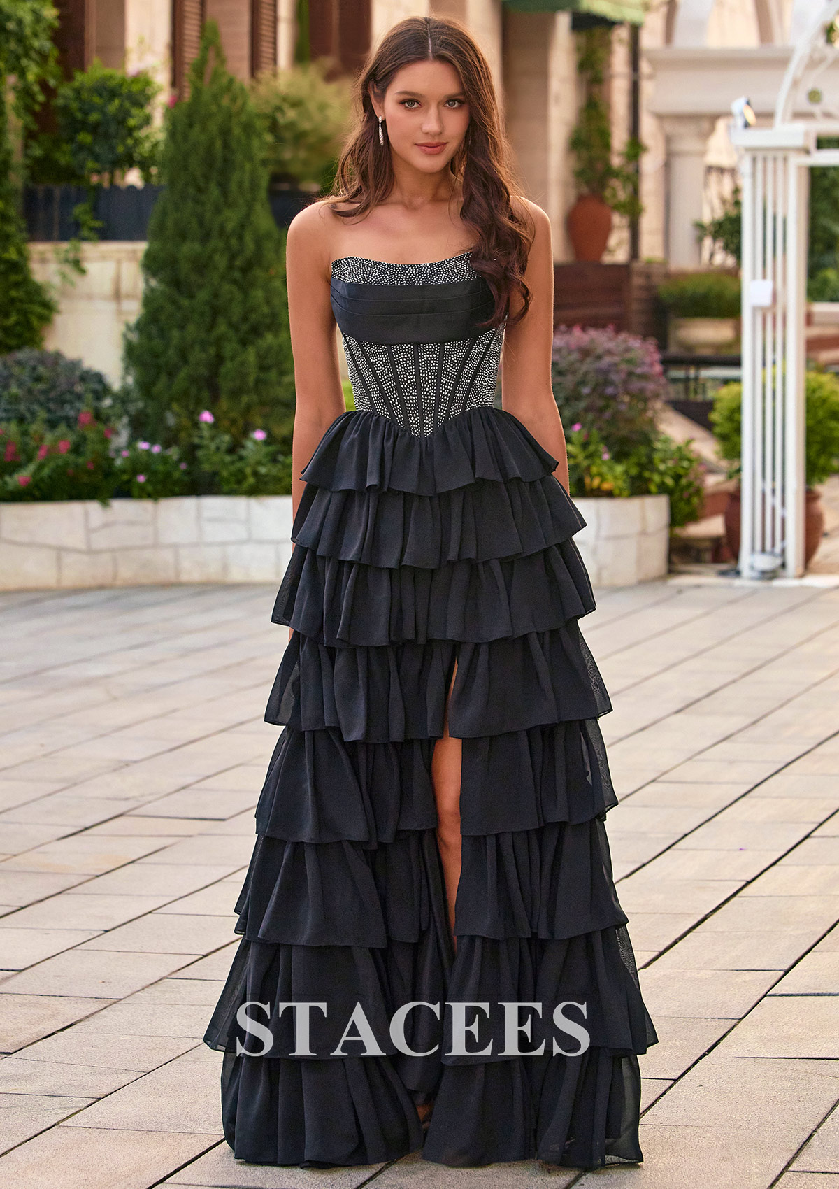 Stacees style S8856P is giving an ethereal princess, perfectly juxtaposing the structured corset with a light and feminine chiffon ruffle skirt. Turn every head on prom night in this stunning tiered ruffle prom dress in black, featuring a sleek strapless scoop sweetheart neckline and a figure‑flattering corset bodice. Detailed with Sparkling hot fixt, the shimmering, textured bodice cinches the waist and flows into a cascade of soft, layered ruffles that create a dramatic, voluminous skirt. A front high slit adds a flirty, modern touch, giving you plenty of movement to walk and dance comfortably. From the back, the lace‑up corset detail enhances your curves and allows for an adjustable, custom fit. The long, flowing ruffle skirt brings romantic drama to every step, making this black evening gown perfect for prom, formal dances, black‑tie weddings, and special occasions. Pair this strapless ruffle prom dress with delicate jewelry and strappy heels for a glamorous, red‑carpet‑ready look that photographs beautifully from every angle.