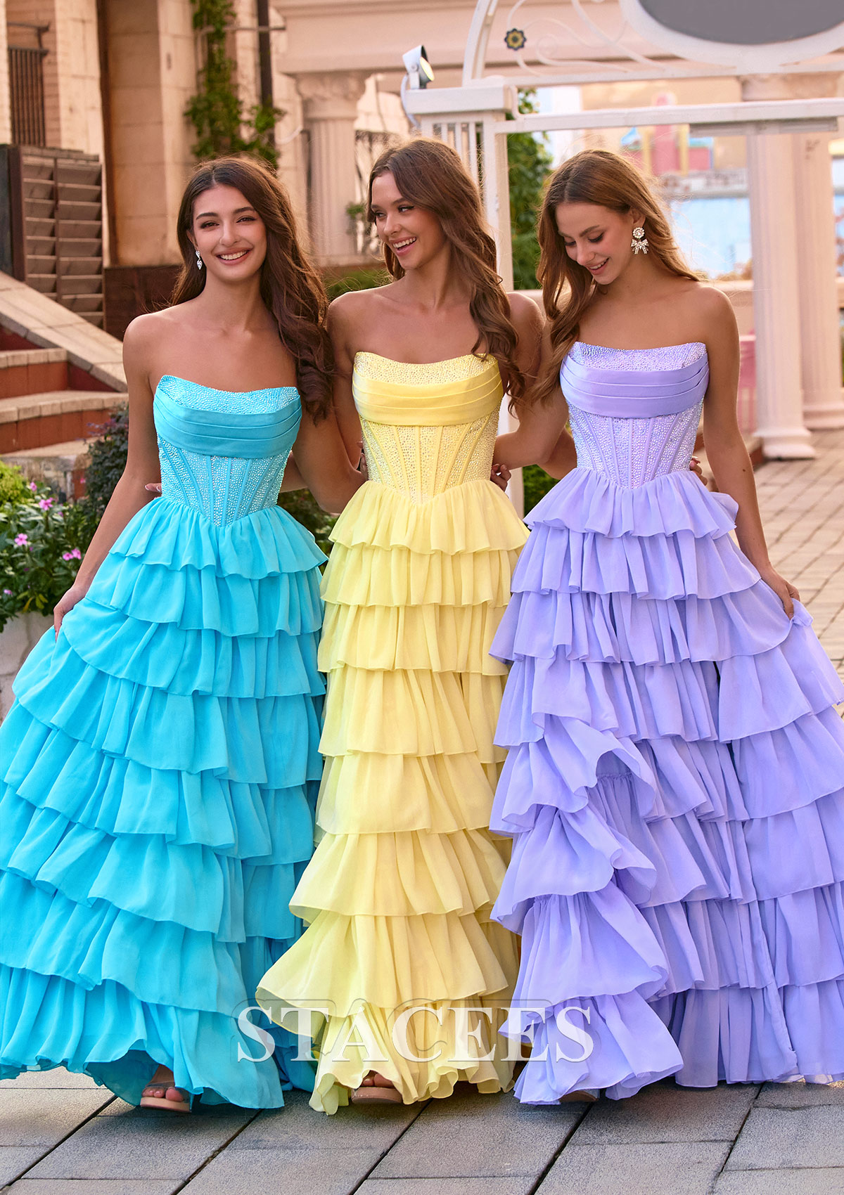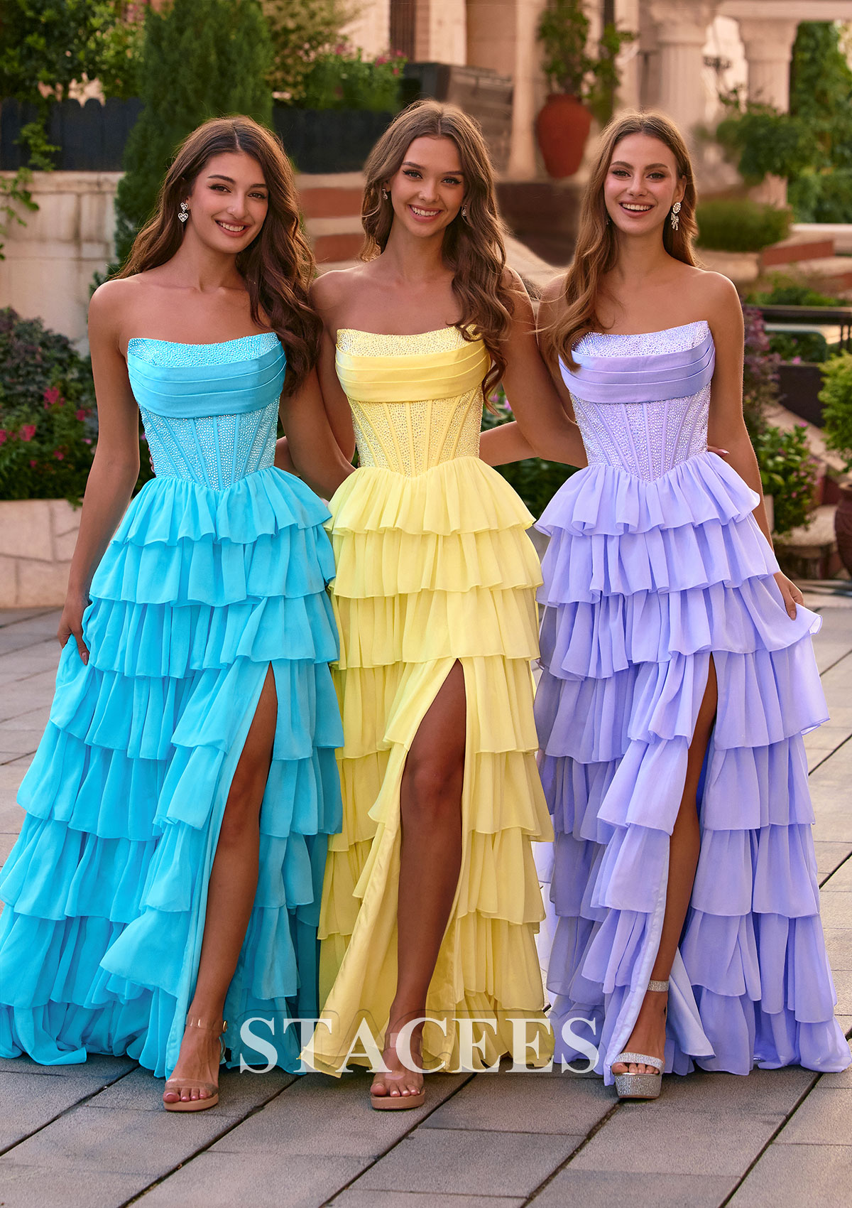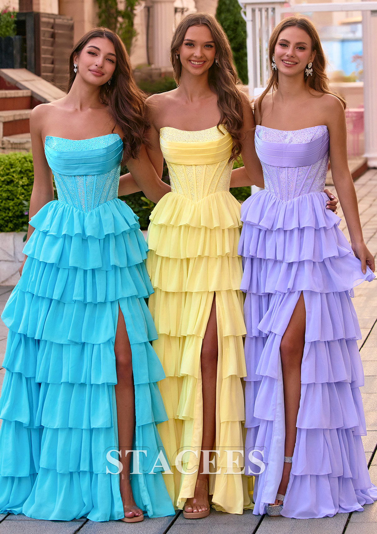 Make a showstopping entrance in these dreamy strapless corset prom dresses featuring a shimmering, structured trendy corset-style bodice and a flowing multi-tiered ruffle skirt. With hot-fix beads embellishmentthe glittery bodice cinches the waist and provides a flattering, snatched silhouette, while the lace‑up corset open back lets you customize the fit for extra support and comfort. Multiple soft ruffled layers create a romantic, voluminous look that floats with every step, and the high front slit adds a touch of modern drama, showing off your legs and heels. Available in more than three stunning pastel shades, aqua blue, butter yellow, and lilac purple and more, this tiered ruffle corset prom gown is perfect for prom, homecoming, sweet 16 parties, formal dances, and bridesmaid dresses. The long, flowing skirt and eye‑catching sparkle make it ideal for prom night, while the strapless neckline beautifully highlights your shoulders and collarbone. Style this pastel corset prom dress with strappy heels, a delicate necklace, and loose curls for a red‑carpet‑ready look that stands out in every picture.