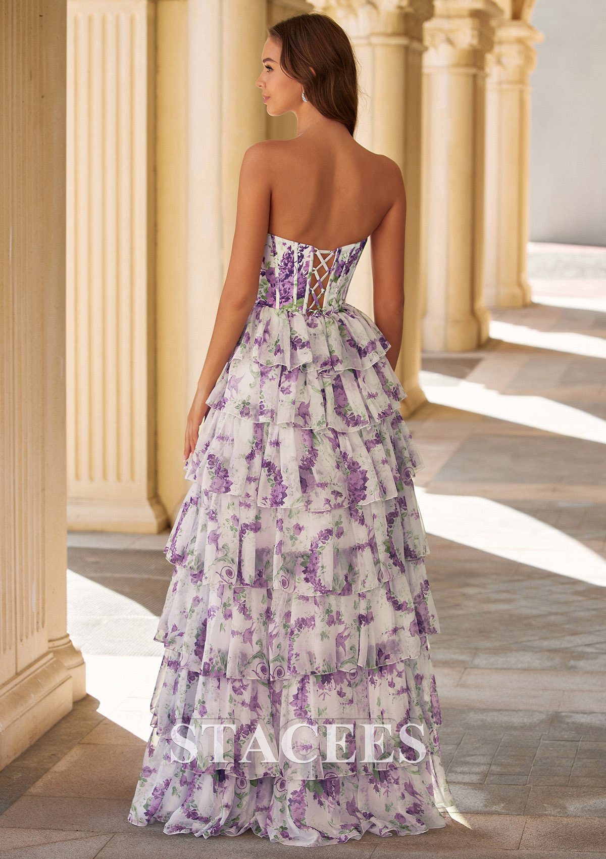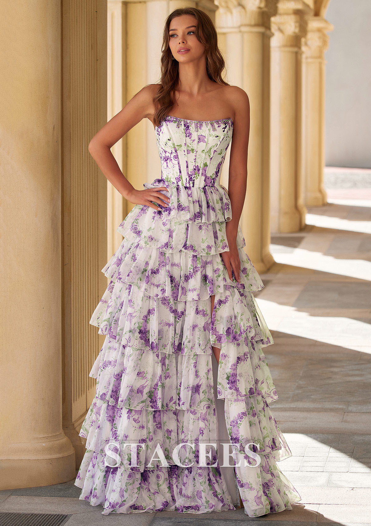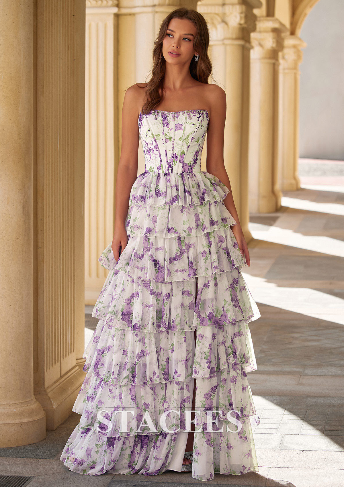 Make a romantic statement at prom with this enchanting strapless floral print prom dress. Designed in soft colorful tones, this gown features a delicate allover floral print that brings a fresh, garden-inspired elegance to any formal occasion. The fitted bodice is structured with corset boning and a lace-up back, offering a flattering silhouette and adjustable support. Elegant square neckline adorned with intricate beading detailing frames this stunning gown, while an ethereal floral print cascades down the silhouette. Flowing into a dramatic tiered ruffle skirt, this dress showcases a hemline with a subtle front opening for graceful movement and a modern touch. Crafted from lightweight, airy fabric, the layered skirt adds volume without feeling heavy, making it perfect for dancing all night long. Ideal for prom, spring formals, evening galas, or special occasions, this floral strapless gown blends classic romance with contemporary design for a truly unforgettable look.