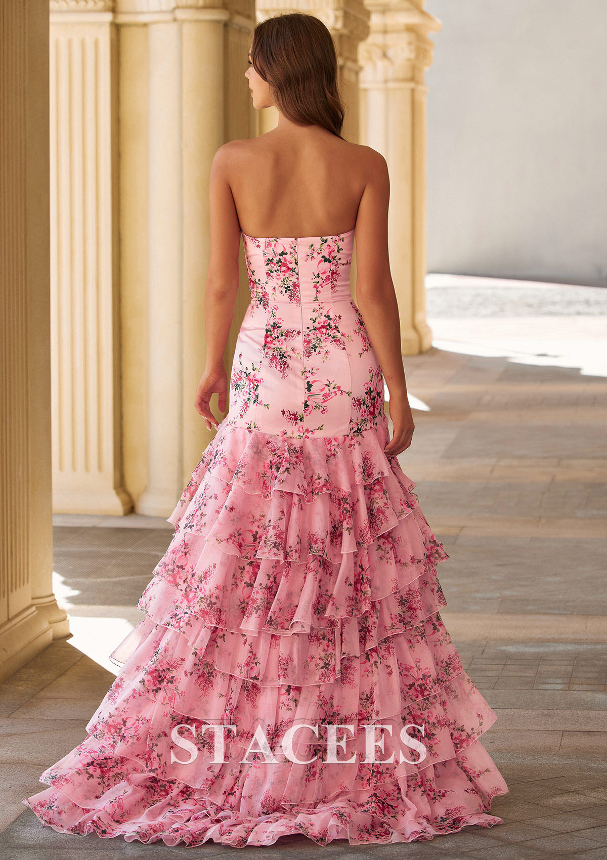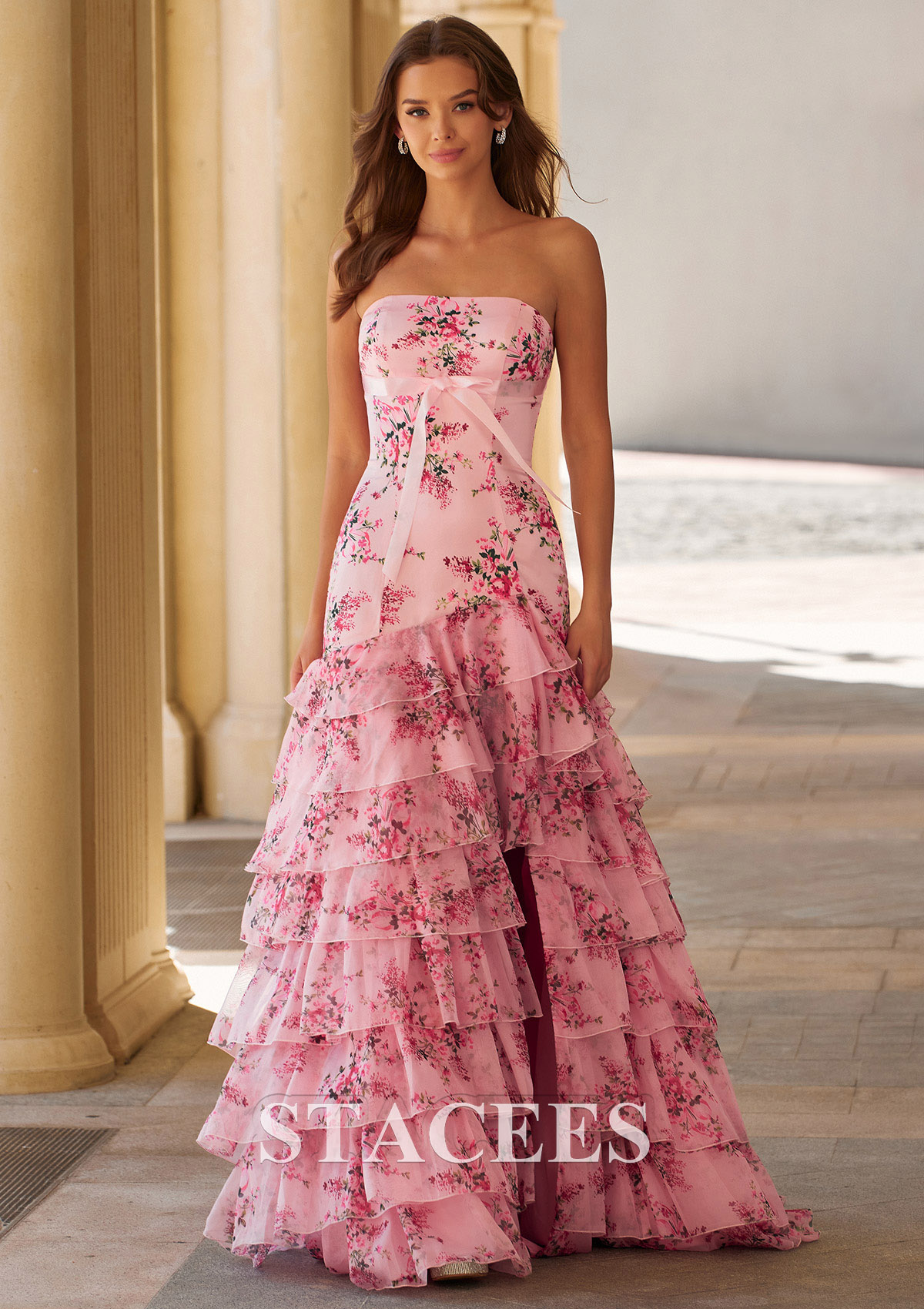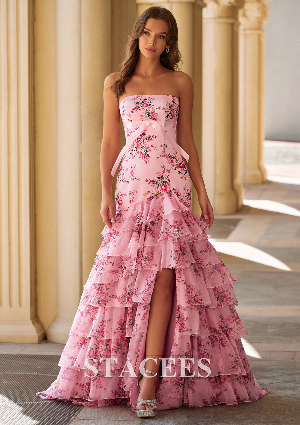 A-line Floral Strapless Ruffled Prom Dress with Tiered Skirt and Slit S9047P - Prom Dresses - Stacees