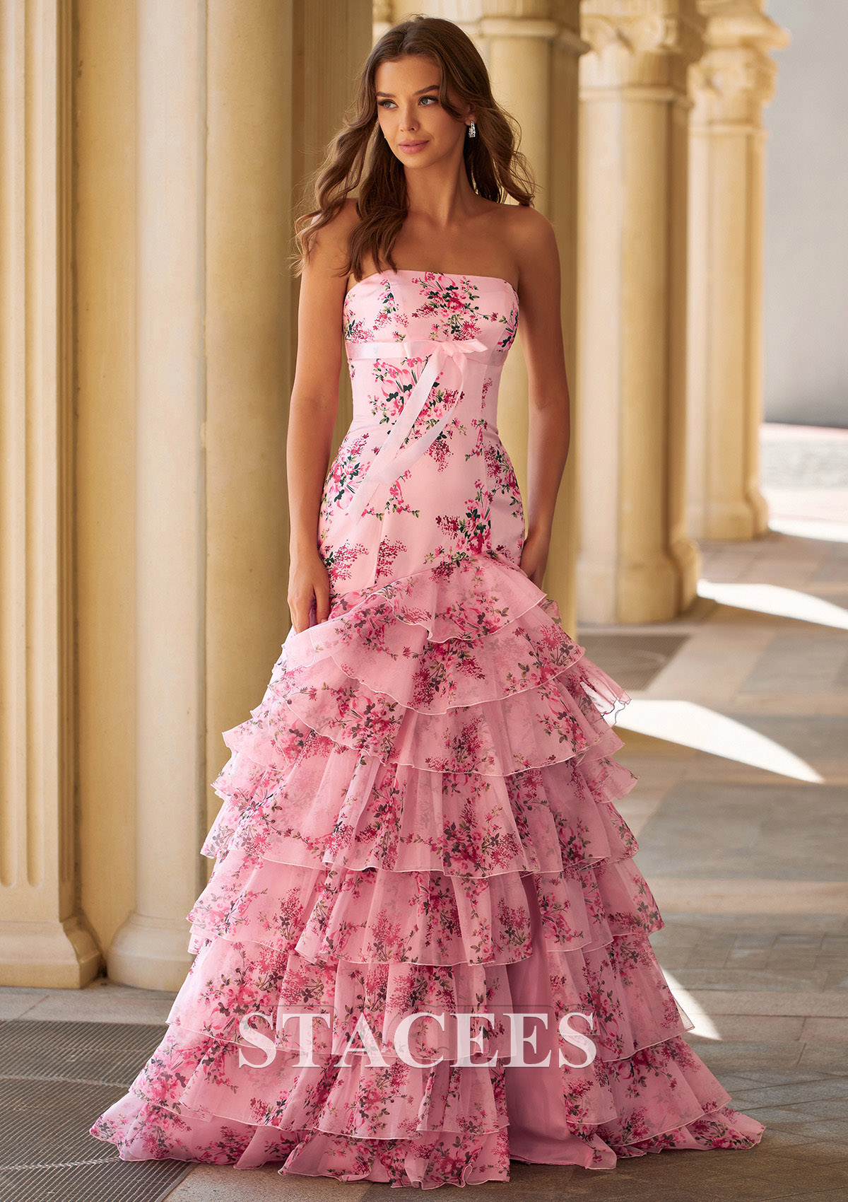 Make a romantic statement at prom with this elegant floral strapless prom dress. Designed with a structured, form-fitting bodice, this gown highlights the waist and creates a flattering silhouette. The soft fabric is adorned with delicate floral prints, adding a timeless and feminine charm. Delicate all-over floral prints and a subtle front bow detail enhance the ultra-girly, garden-party vibe, the floor-length skirt features cascading tiered ruffles that bring graceful movement and volume, while the subtle high slit adds a modern, alluring touch without compromising elegance. A strapless neckline enhances the shoulders and neckline, making it perfect for statement jewelry or an updo hairstyle. The back offers a clean, seamless finish for a polished look from every angle. Ideal for prom, formal evenings, spring galas, or garden-themed events, this floral ruffle prom dress blends classic romance with contemporary sophistication.