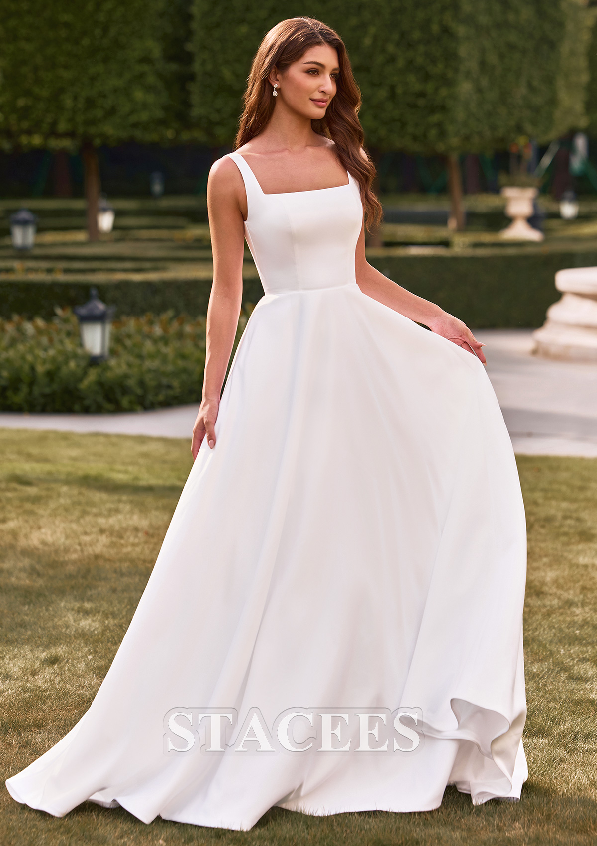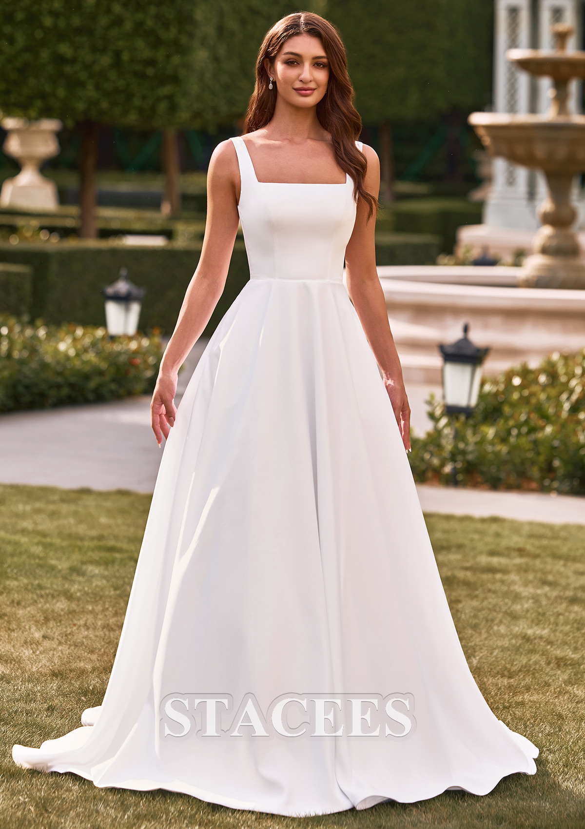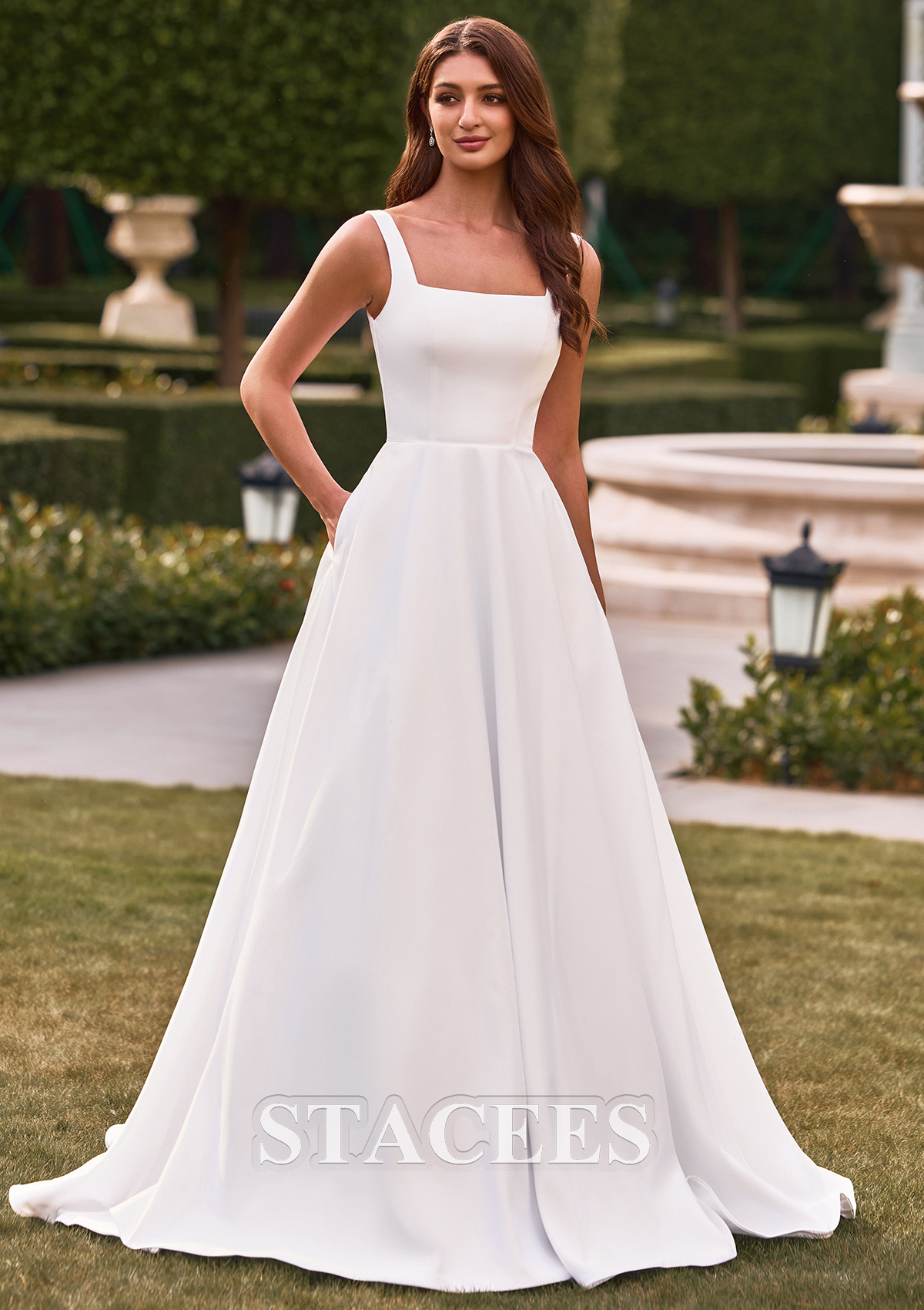 Step into timeless elegance with this A-line wedding dress, designed to create a graceful and sophisticated look for your most special occasions. Featuring a modern square neckline and wide shoulder straps, this gown offers a flattering, structured bodice that enhances the natural silhouette while providing comfortable support. The fitted bodice flows seamlessly into a classic A-line skirt, creating a beautifully balanced shape. Crafted from smooth, high-quality fabric, the gown drapes elegantly to the floor for a touch of drama and romance. The back features a stunning deep V-neck design and is adorned with a row of fabric-covered buttons, adding exquisite bridal-style details. Visible side pockets add practical elegance without interrupting the smooth lines. This elegant dress blends modern simplicity with classic charm, creating an unforgettable look.