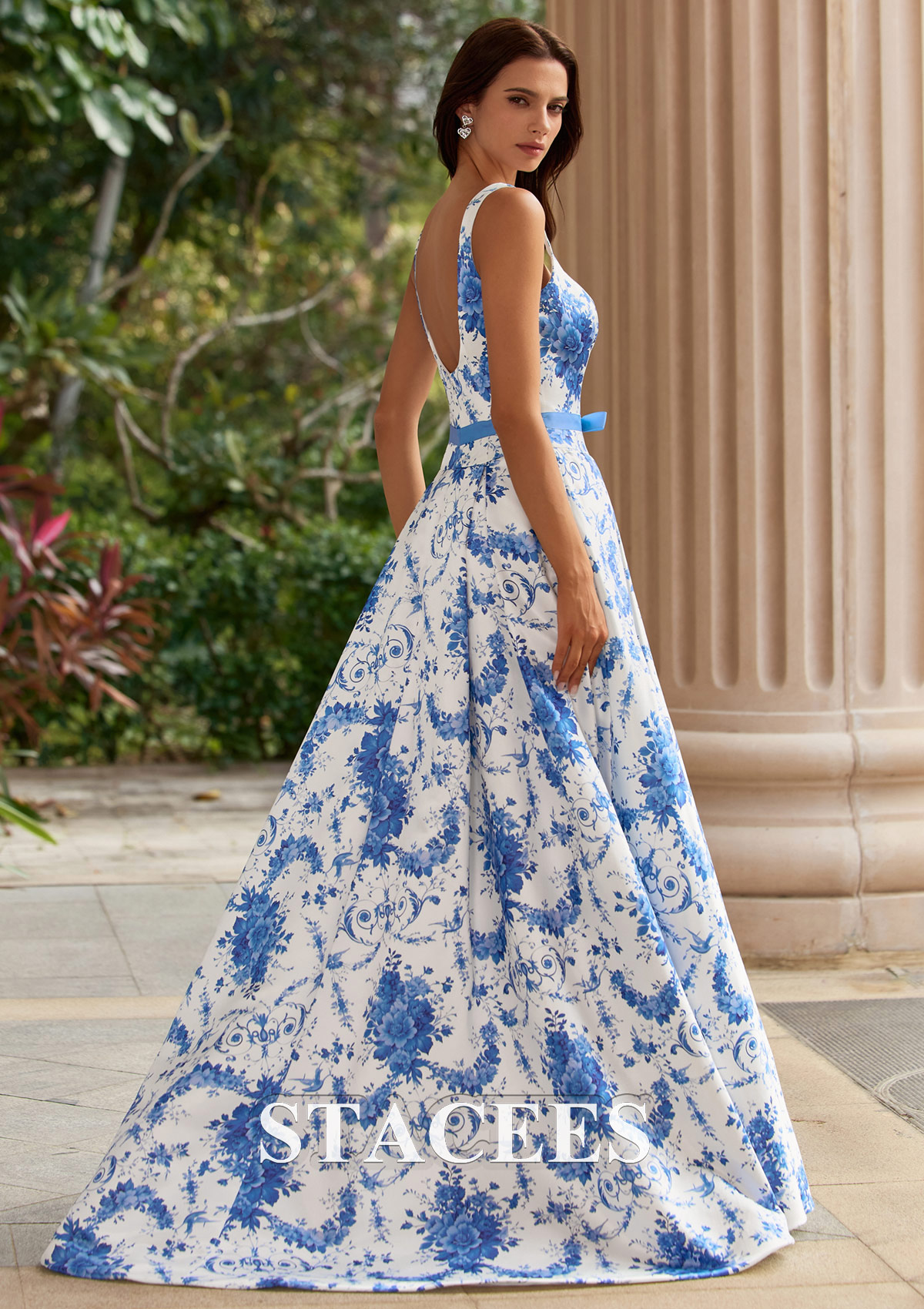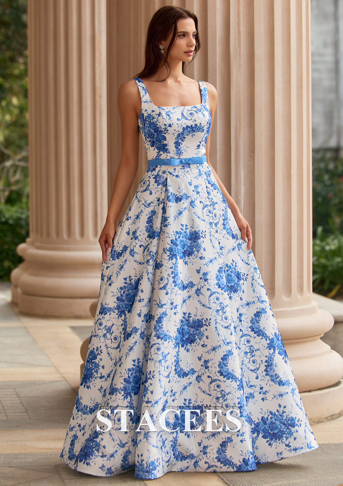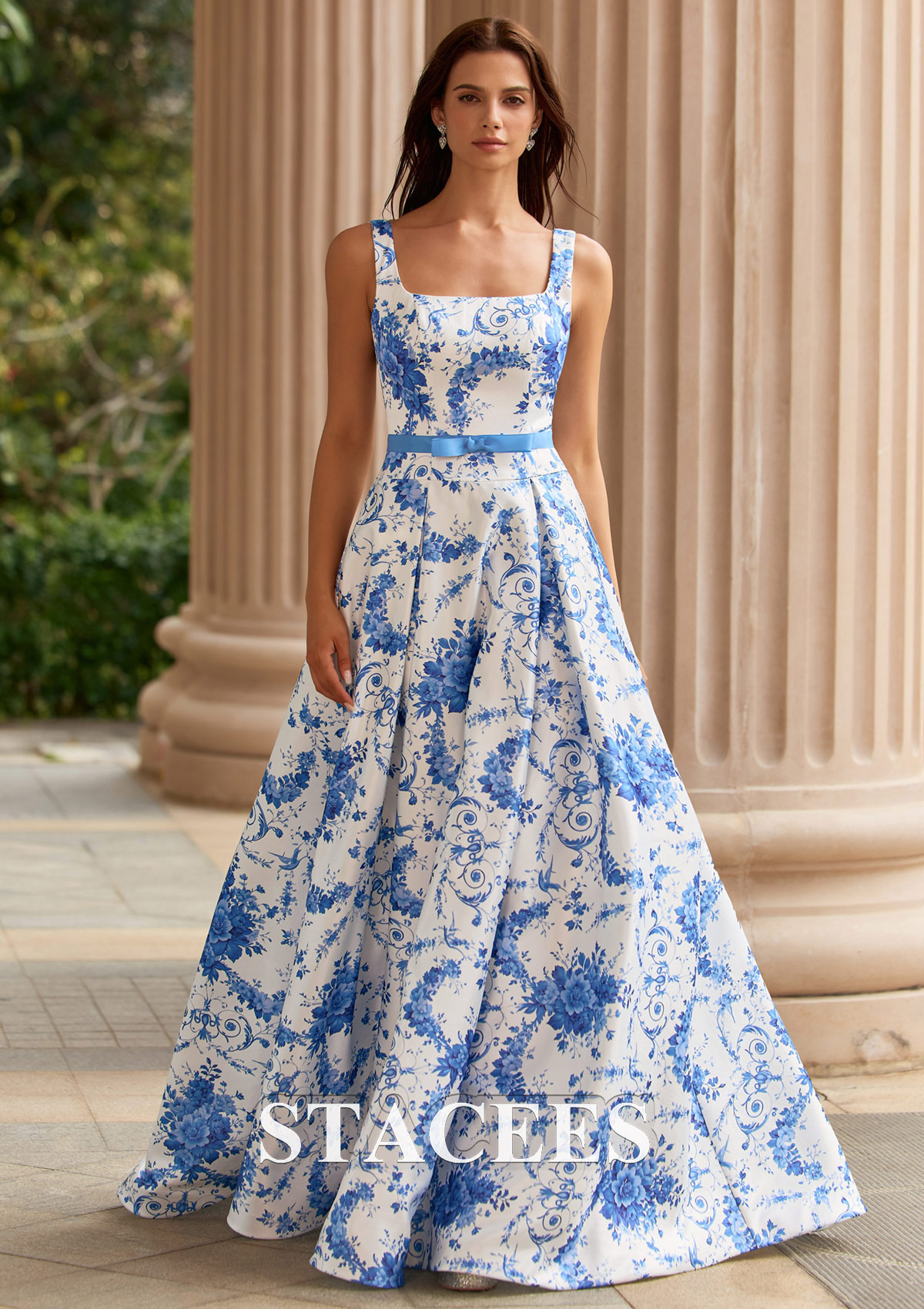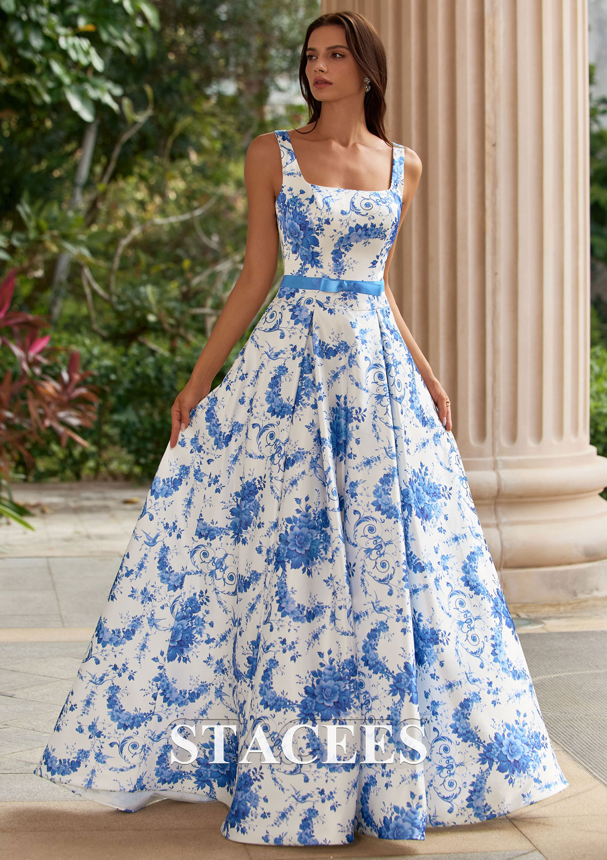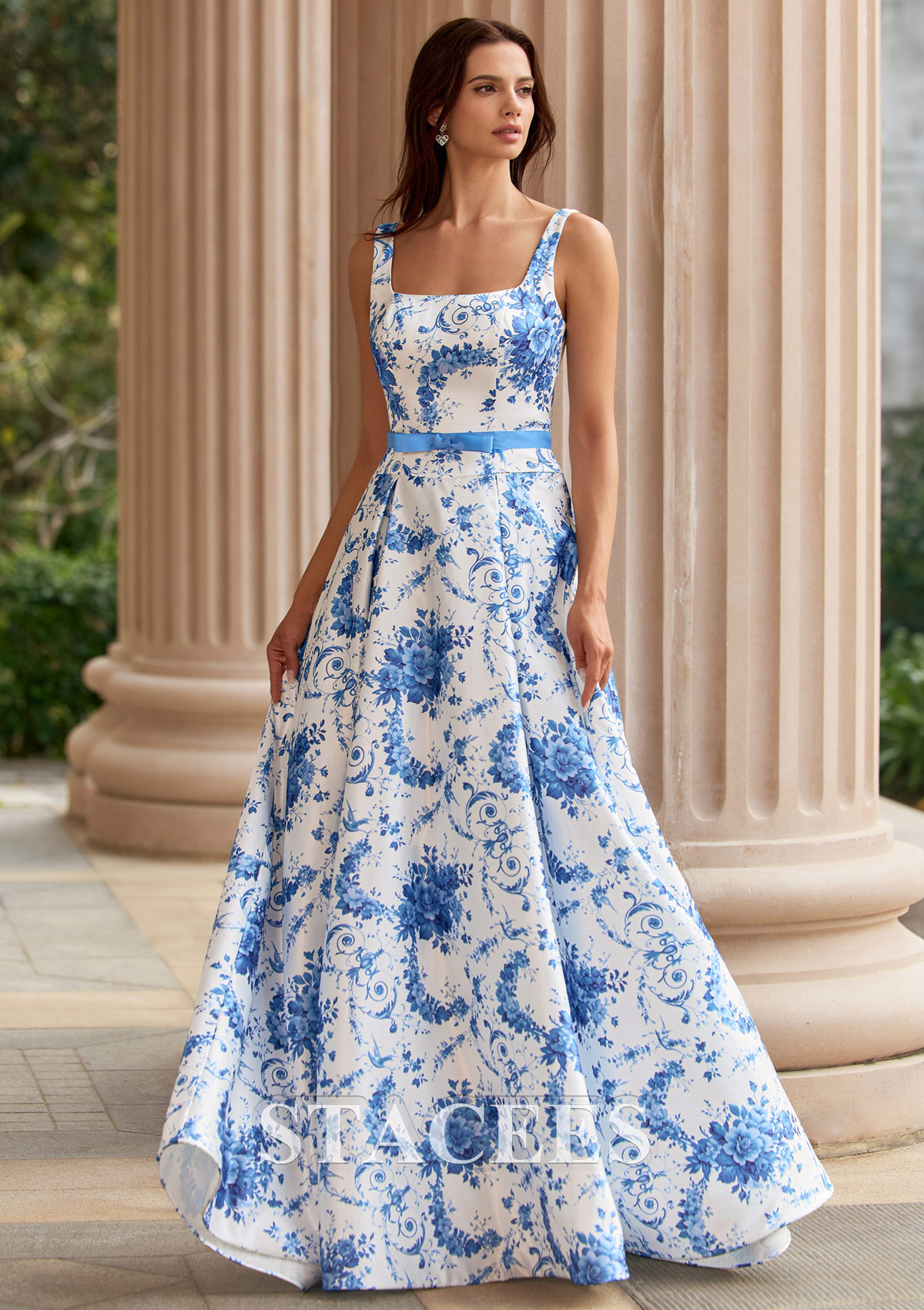 Step into classic charm with our elegant floral print A-line prom dress. This stunning gown features a sophisticated square neckline and comfortable regular straps, offering timeless style and support. The captivating pattern across the fabric presents a beautiful intricate design, lending a fresh and captivating look perfect for any formal event. A slender ribbon sash at the waist provides a subtle contrast, accentuating your figure and adding a touch of graceful detail. The fitted bodice gently flares into a voluminous A-line skirt, ensuring a flattering silhouette and elegant movement. The dress boasts an alluring open-back design, complemented by a discreet zipper closure, ensuring both elegance and a perfect fit. Ideal for prom, garden parties, weddings, and special occasions, this dress beautifully blends traditional motifs with contemporary design.