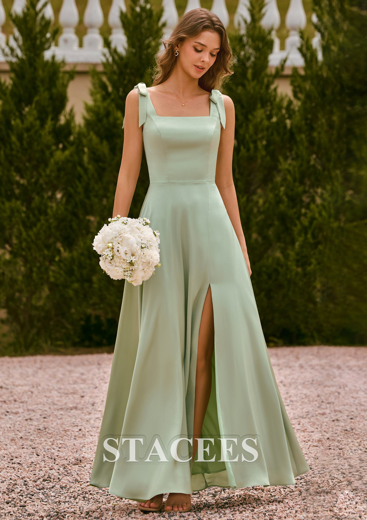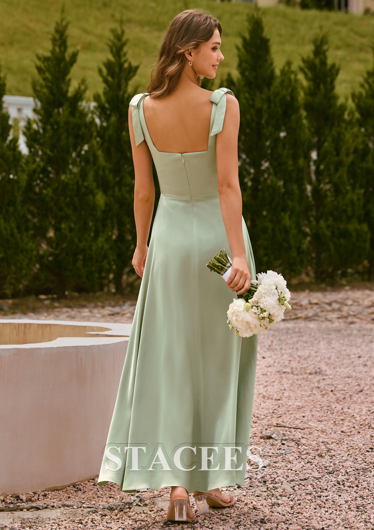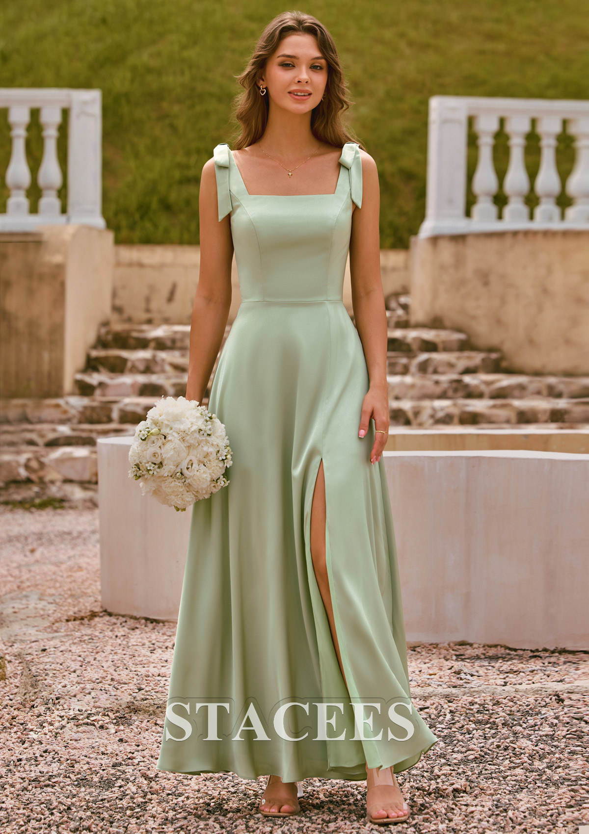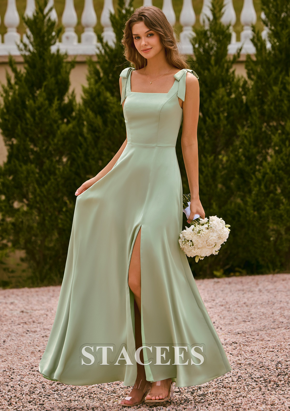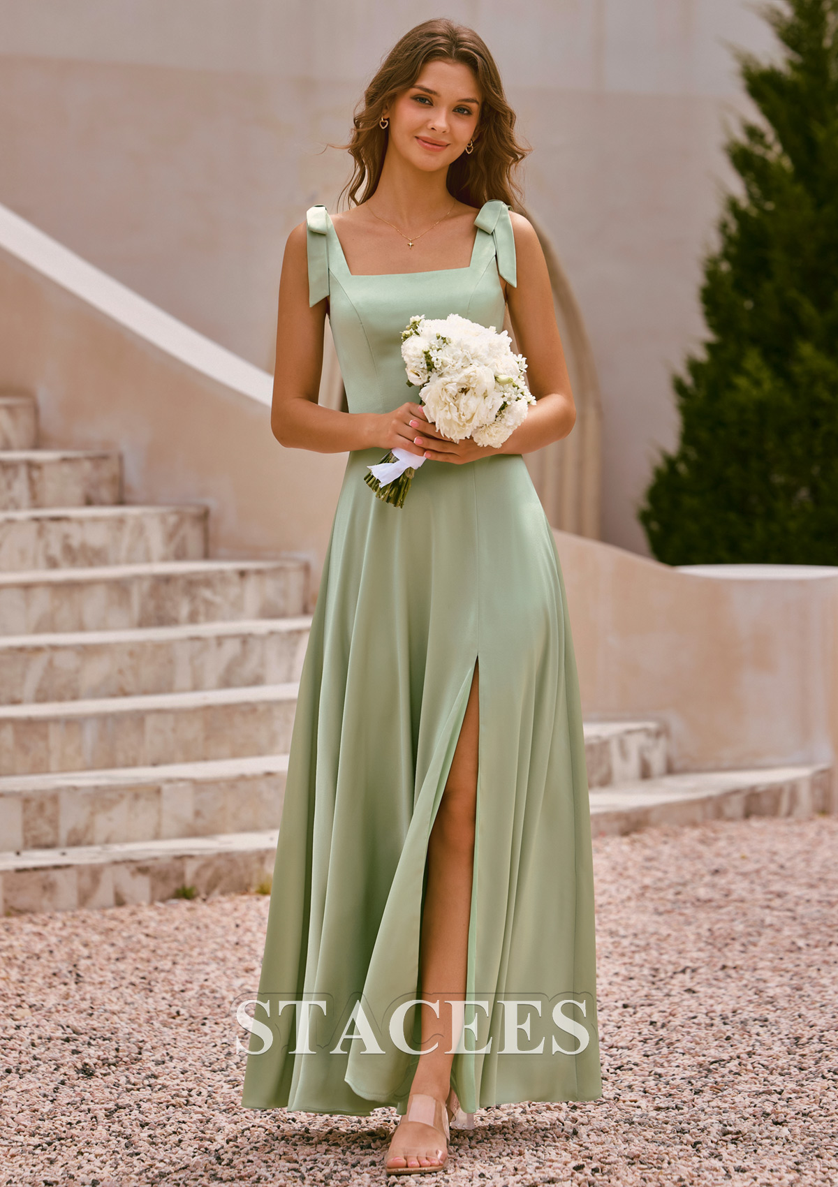 A-line Square Neckline Stretch Satin Slit Bridesmaid Dress with Bow Straps S6018B - Bridesmaid Dresses - Stacees