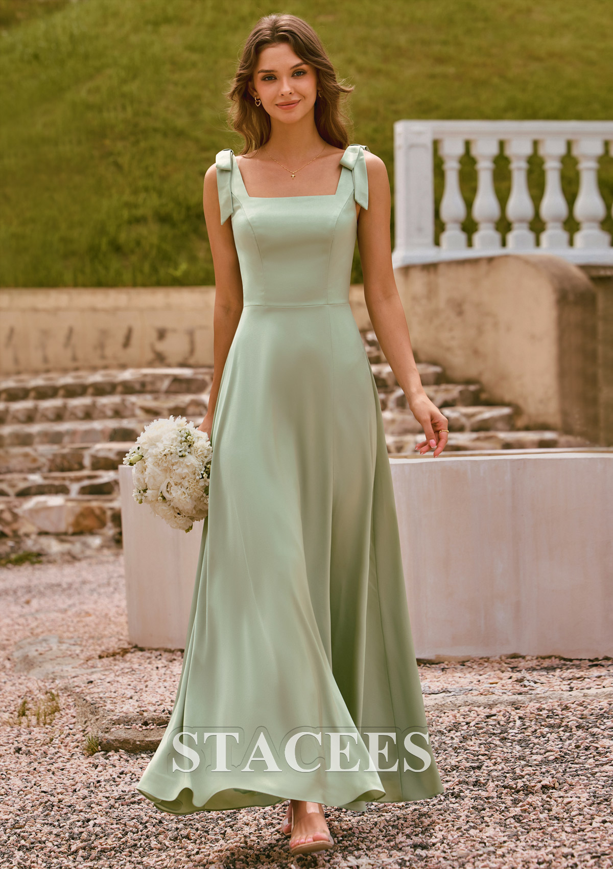 This beautiful satin bridesmaid dress is perfect for a sophisticated wedding or special occasion. Featuring a square neckline and delicate bow straps, it exudes both charm and elegance. The dress flows gracefully with a side slit that adds a touch of modern allure. The back is elegantly designed with a zipper closure for a seamless fit. A soft pastel green color enhances the light and airy feel, making it an ideal choice for bridesmaids. Complete the look with soft floral bouquets for a romantic finish.
