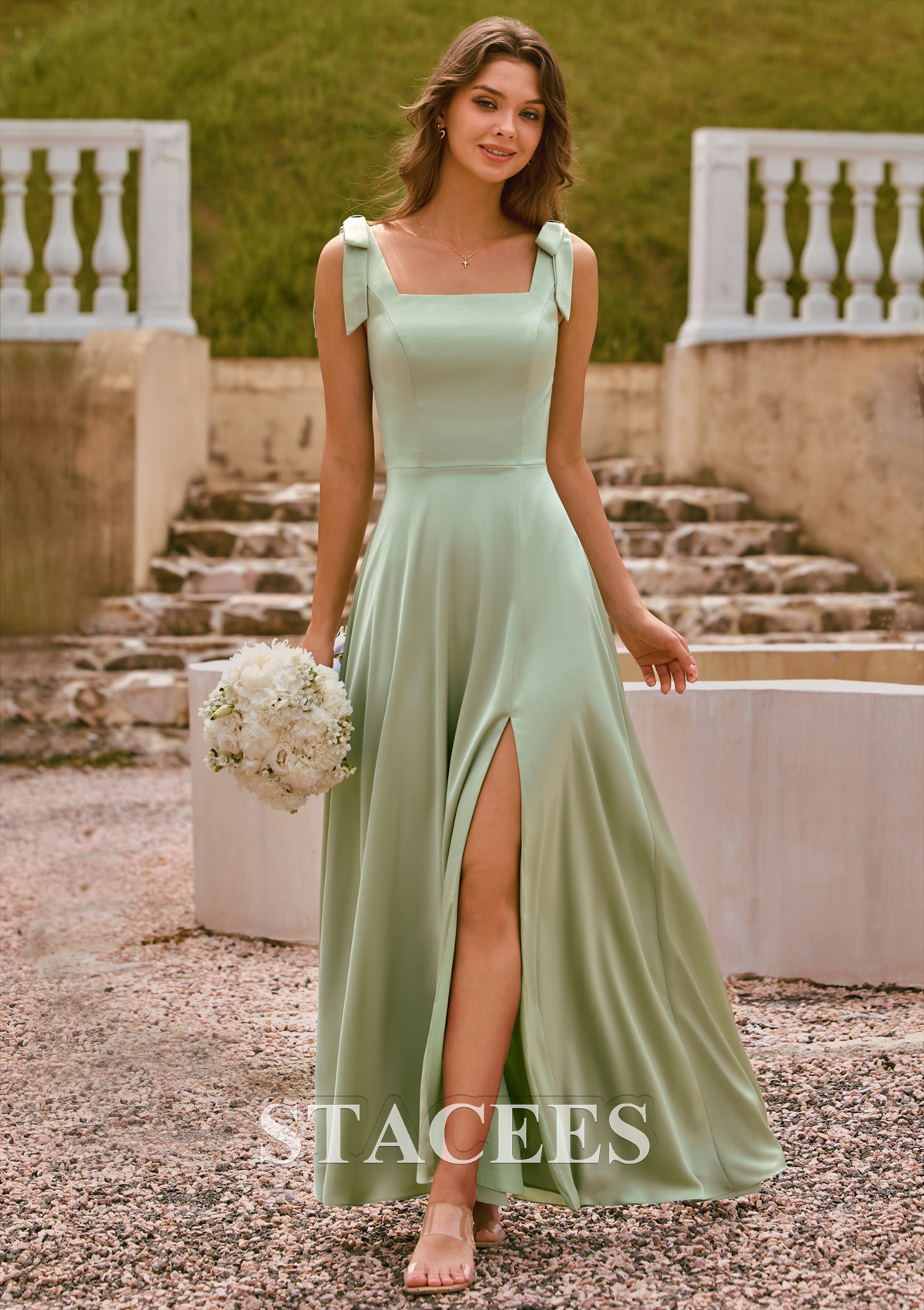 A-line Square Neckline Stretch Satin Slit Bridesmaid Dress with Bow Straps