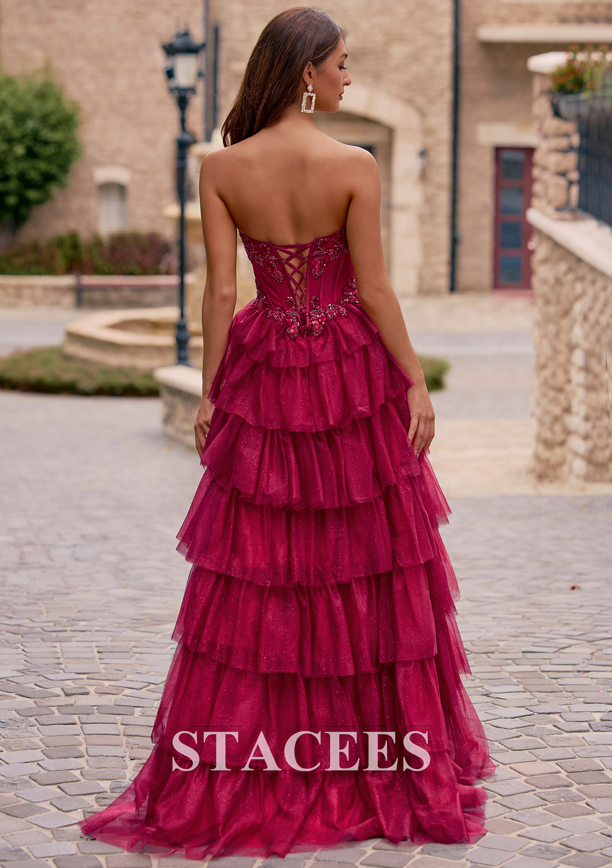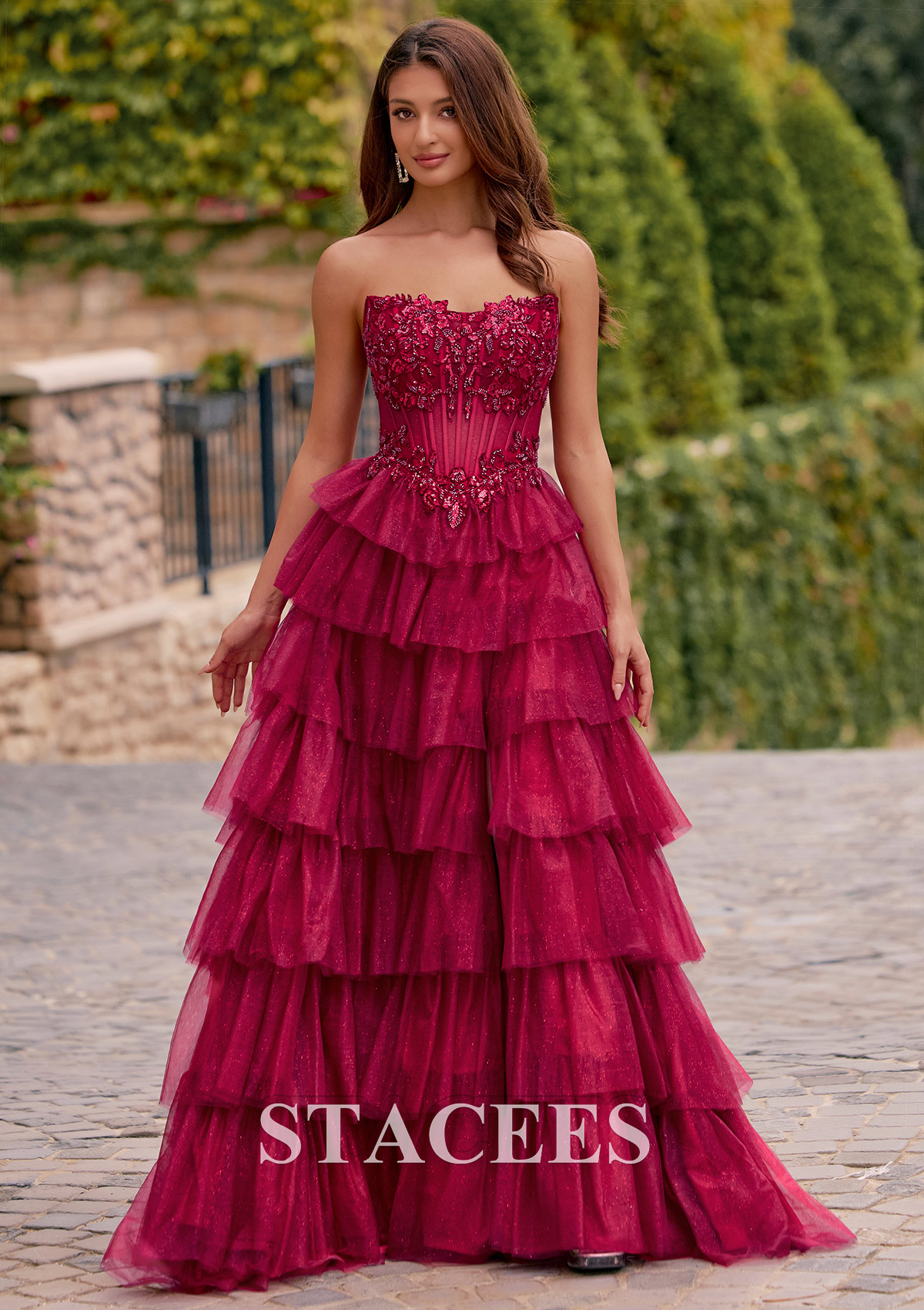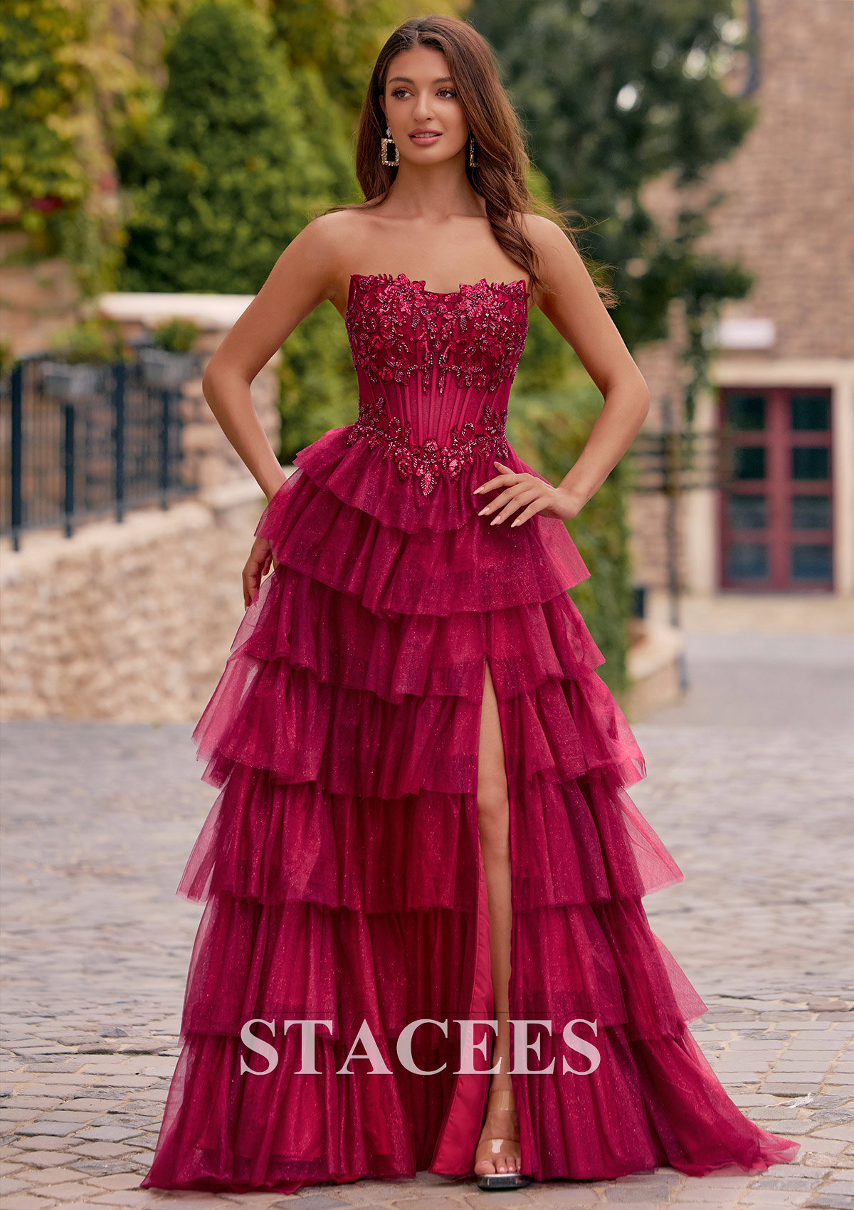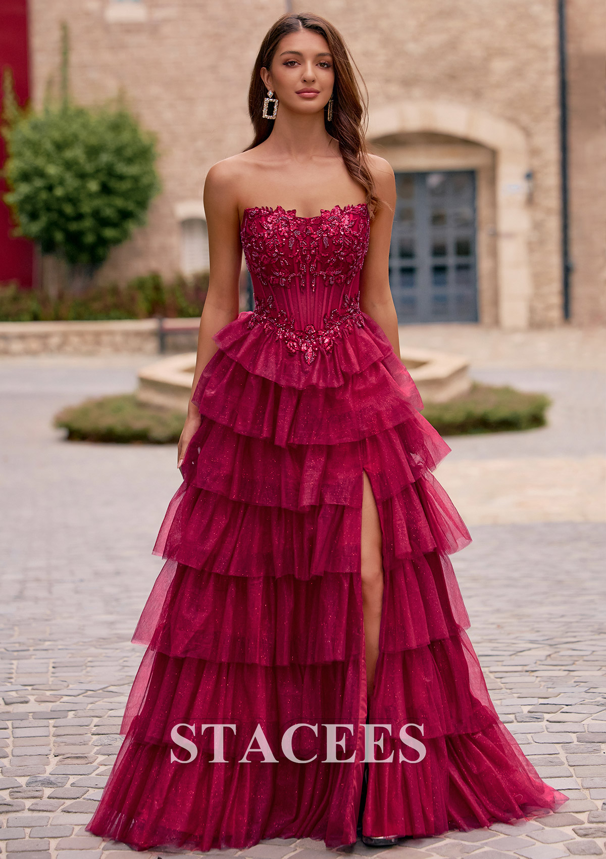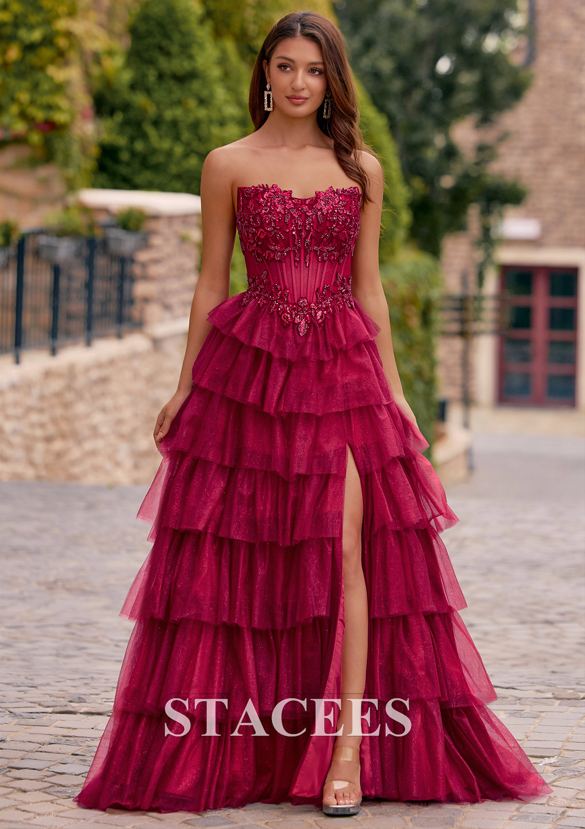A-line Strapless Embellished Corset Tiered Ruffle Glitter Tulle Prom Dress with Slit S8913P - Prom Dresses - Stacees