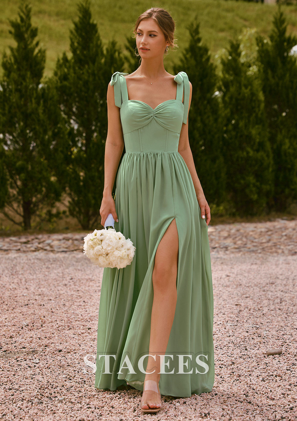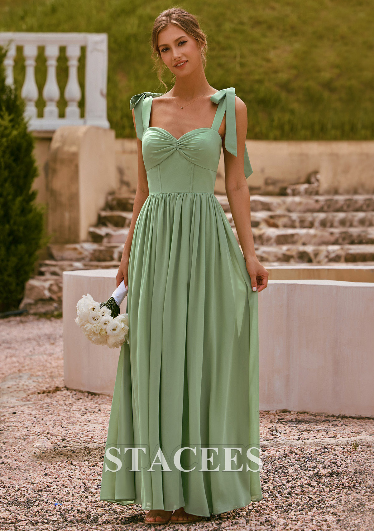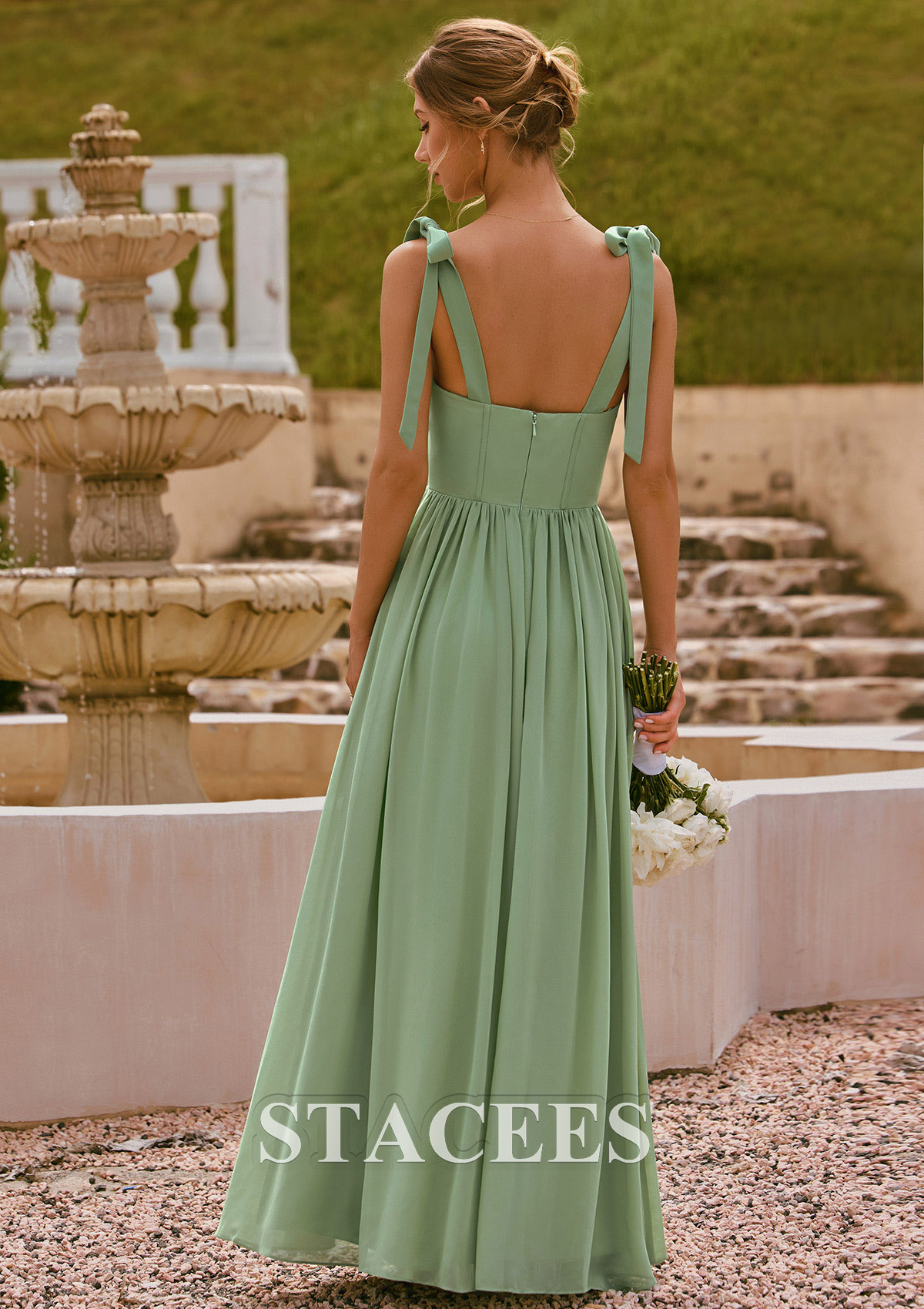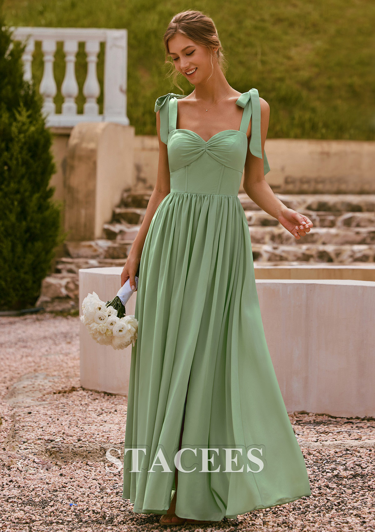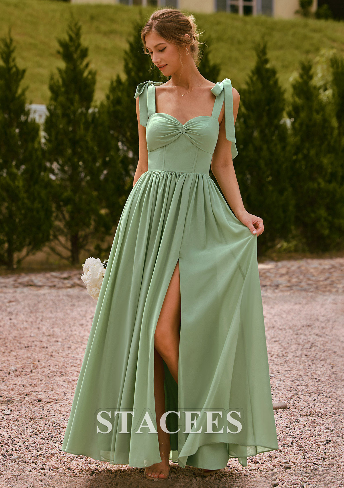Soft and romantic, this chiffon bridesmaid dress captures timeless elegance with a modern touch, the gown is a romantic, feminine choice for modern bridal parties. The fitted sweetheart bodice creates a flattering, structured shape, while the shoulder straps are finished with charming bow ties that add a soft, whimsical touch. A gathered high waist flows into a full, airy skirt that drapes beautifully and moves gracefully with every step. The elegant front slit adds just the right amount of allure and makes walking and dancing comfortable all day and night. With its timeless sage hue and flowy silhouette, this long bow-strap bridesmaid dress is perfect for garden weddings, outdoor ceremonies, boho themes, and mix-and-match bridal party looks.
