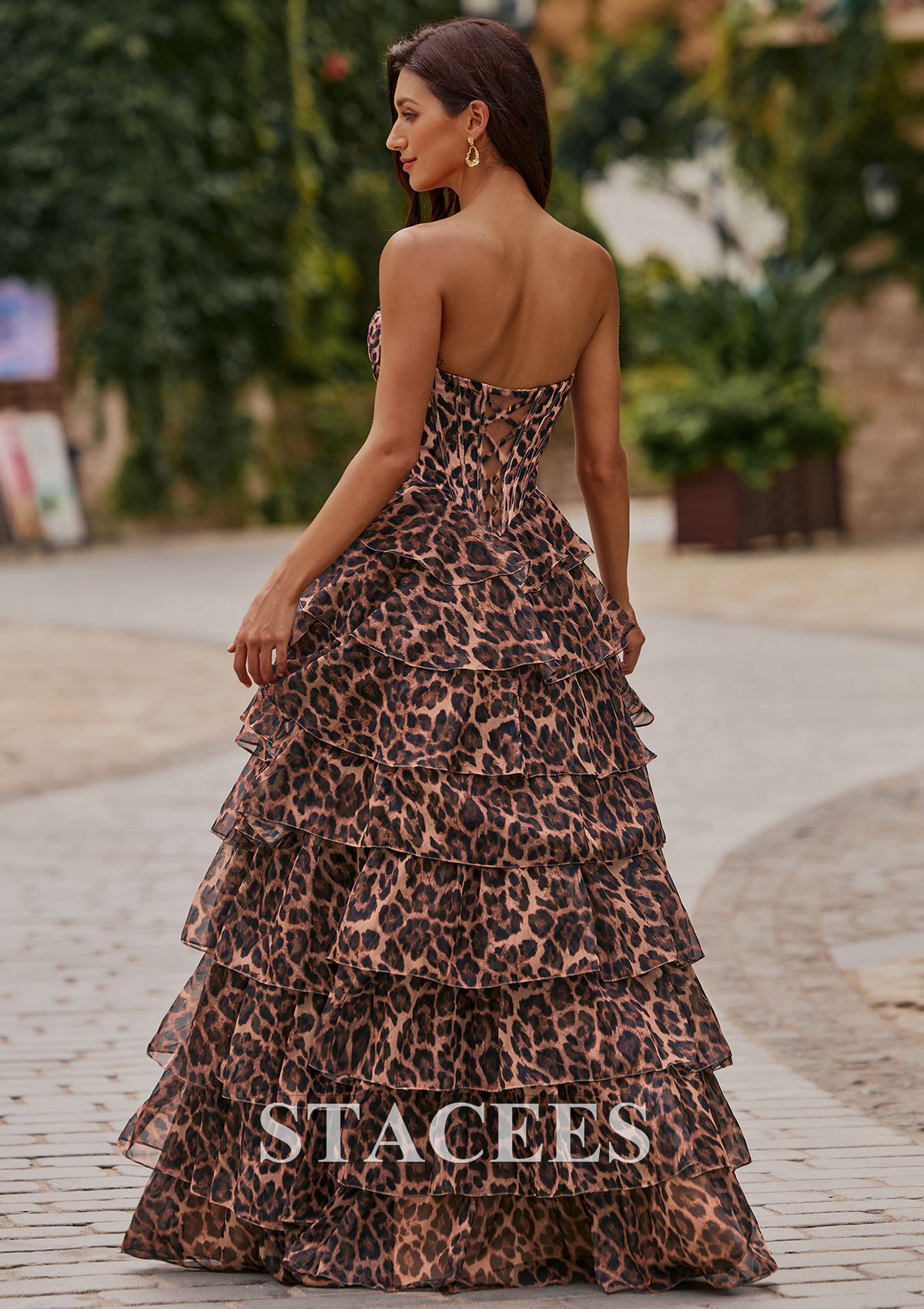 This bold and glamorous prom dress features a striking leopard print design, ideal for making a statement. The strapless sweetheart neckline enhances the fitted bodice, giving it a flattering and structured look. The dress flows into multiple layers of ruffled chiffon, creating a dramatic and voluminous effect. A high slit on one side adds an edgy touch to the sophisticated tiered design. Perfect for those looking to stand out, this dress combines fierce animal print with elegant, feminine styling for an unforgettable appearance.