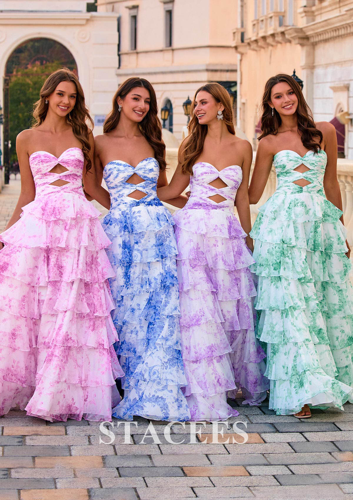 This breathtaking pink and white floral print ball gown from Stacees features a strapless sweetheart neckline with a delicate cutout detail on the bodice for a modern touch. Turn heads on prom night in this romantic pink floral ball gown prom dress, designed for girls who love a dreamy, princess-inspired look. The strapless sweetheart neckline features a ruched bodice with stylish front cutout details, adding a modern, flirty touch to the classic silhouette. A fitted bodice cinches the waist before flowing into a full A-line skirt with multiple cascading ruffle tiers, creating beautiful volume and movement with every step. Soft pink floral patterns over a light blush base give this tiered prom dress a feminine, whimsical feel that’s perfect for prom, quinceañeras, sweet 16 parties, and formal evening events. The back showcases a smooth, structured fit with a zipper closure for easy wear and a flattering, secure shape. Pair this pink tiered prom gown with delicate heels and sparkling jewelry for an unforgettable, fairytale-worthy prom look.