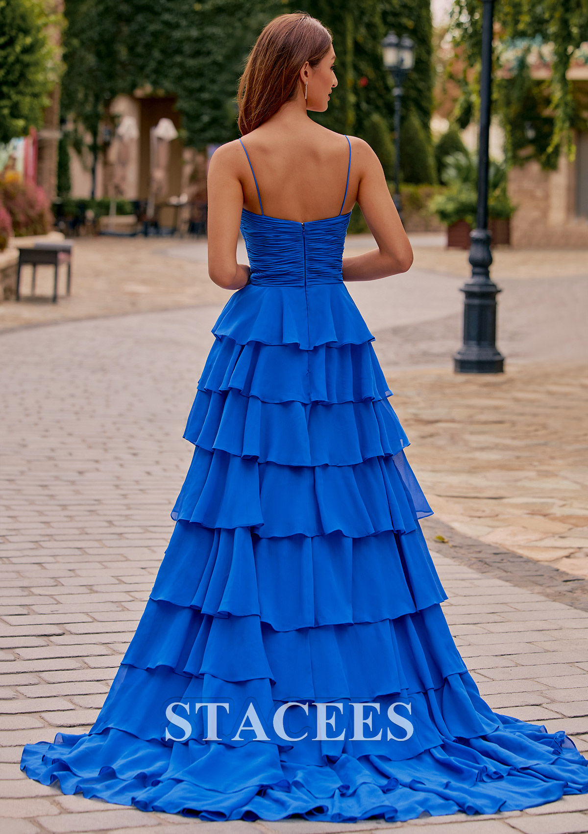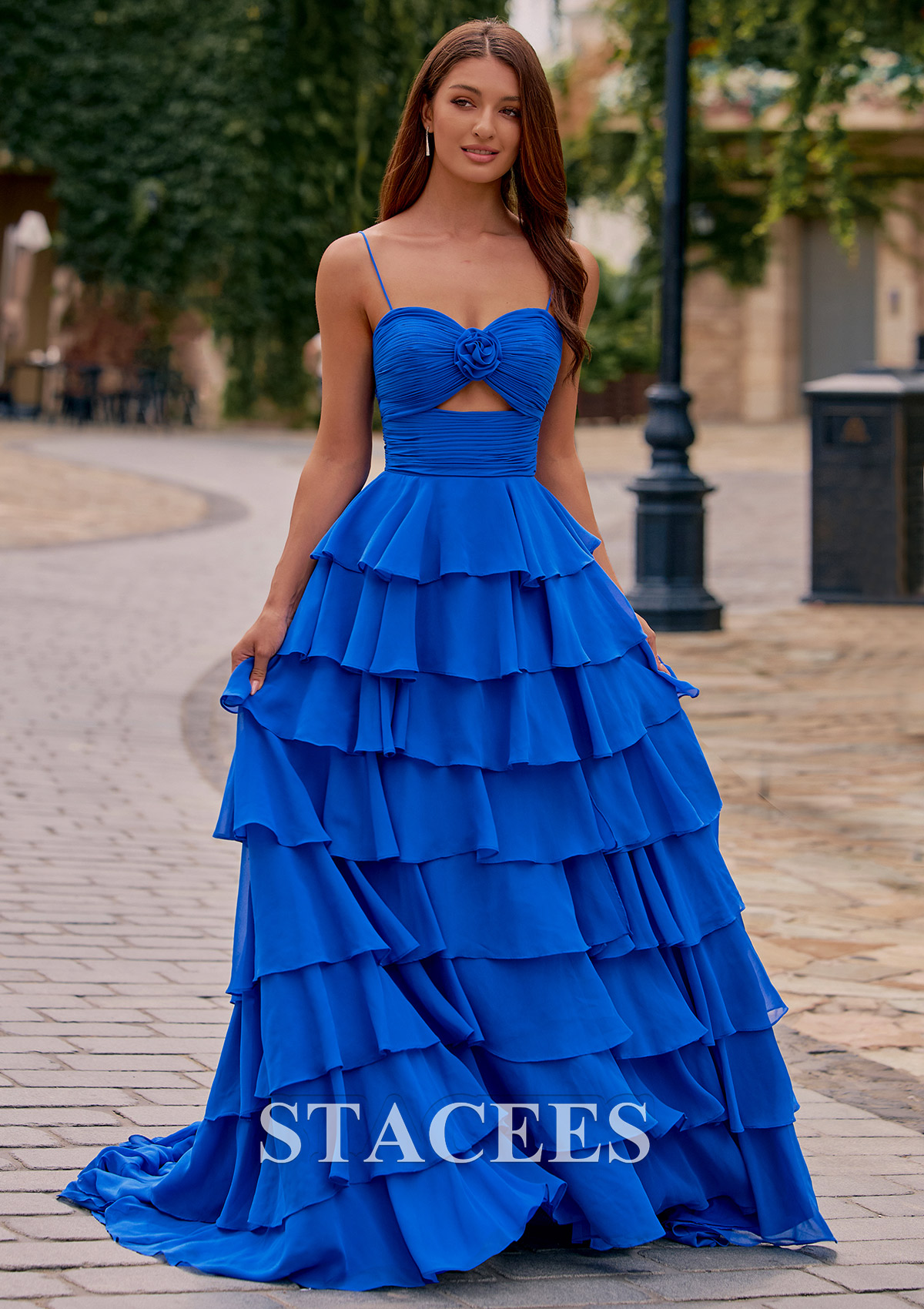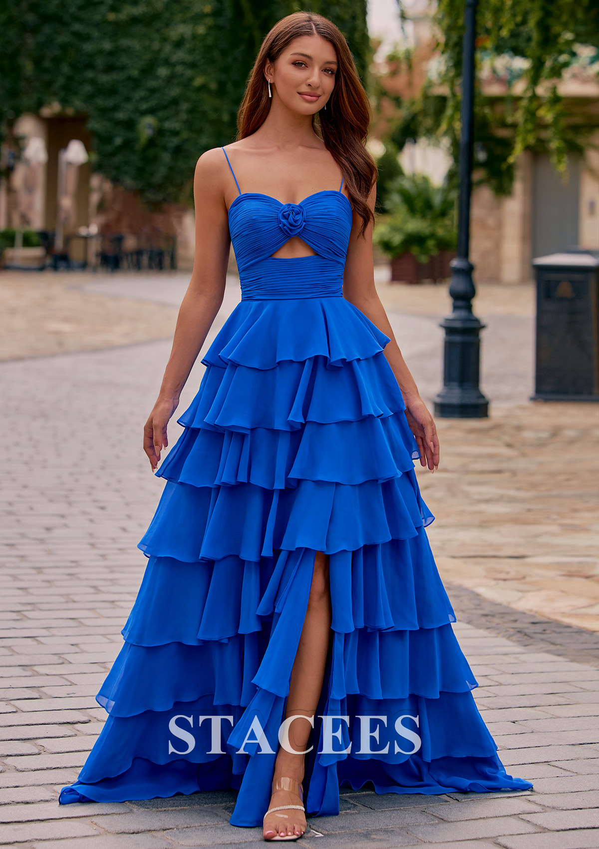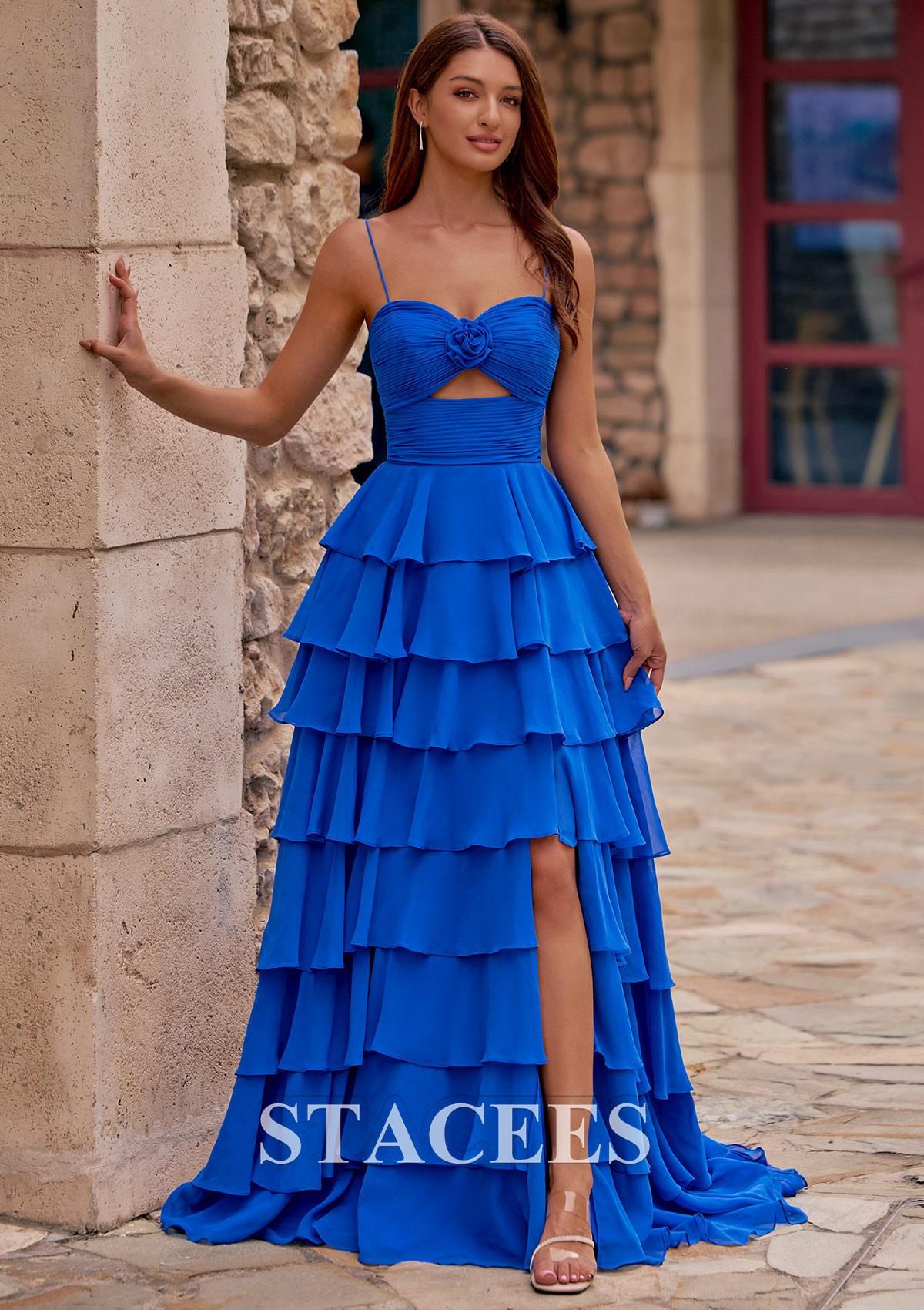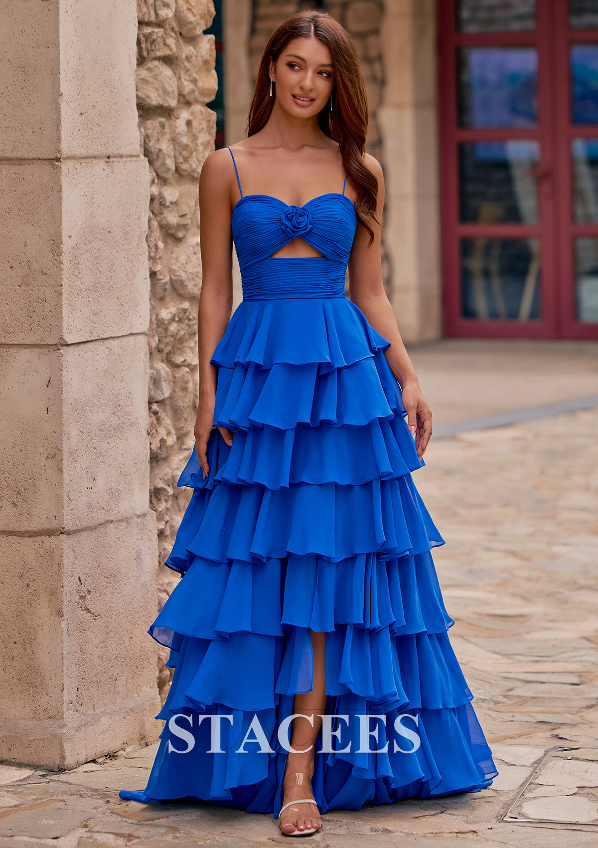 Turn heads at your next prom or formal event with this breathtaking tiered ruffle prom dress. Designed with a romantic rose-accented bodice and a subtle front cutout, this gown blends elegance with modern charm. The fitted ruched waist creates a flattering silhouette, while the dramatic multi-layered ruffle skirt adds volume and movement. A stylish front slit gives the dress a bold touch and makes walking effortless, and the sleek spaghetti straps complete its feminine look. The back features a smooth, ruched zipper closure for a seamless fit. Perfect for prom night, pageants, or any formal evening event, this long gown is designed to dazzle and collect compliments.