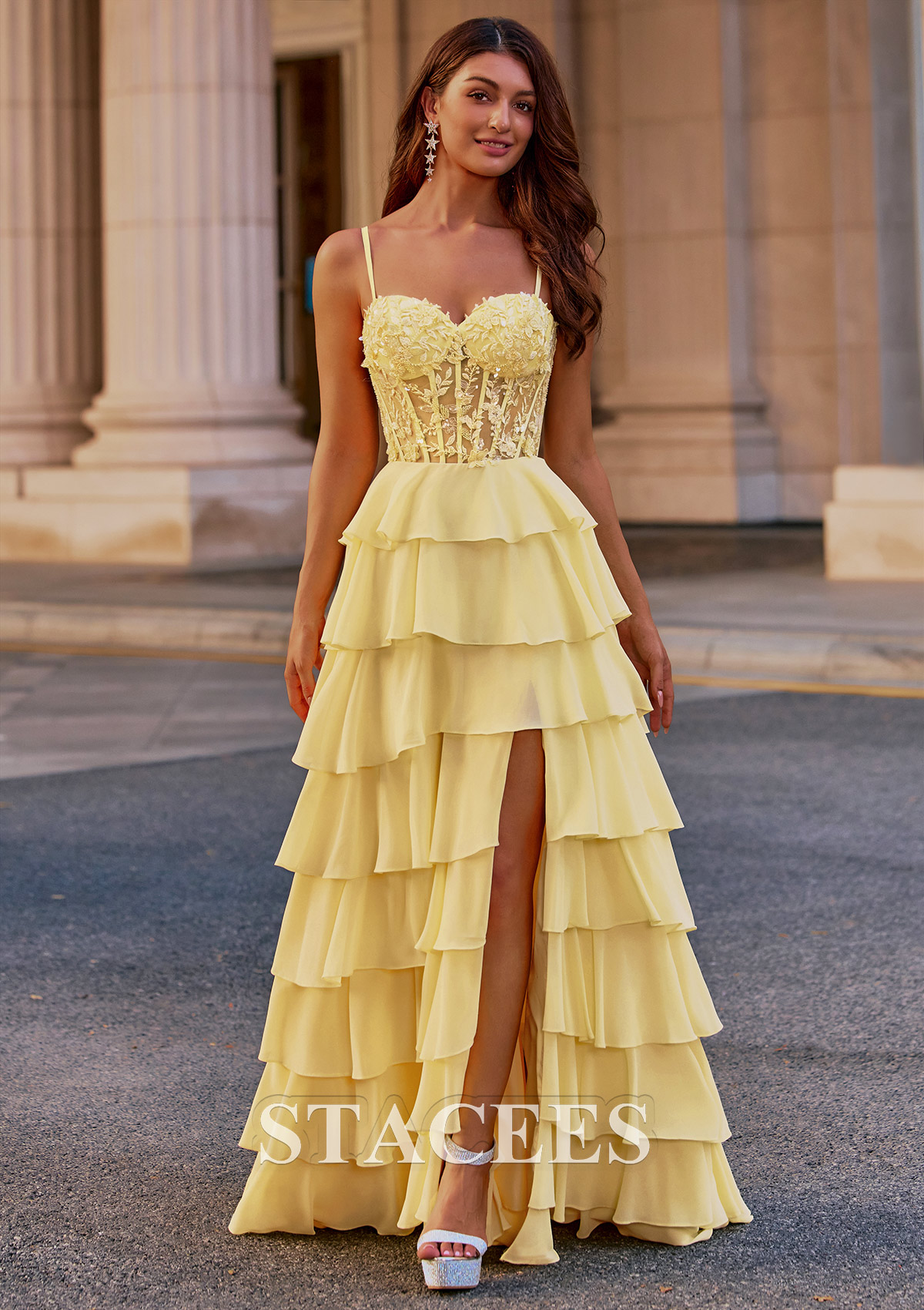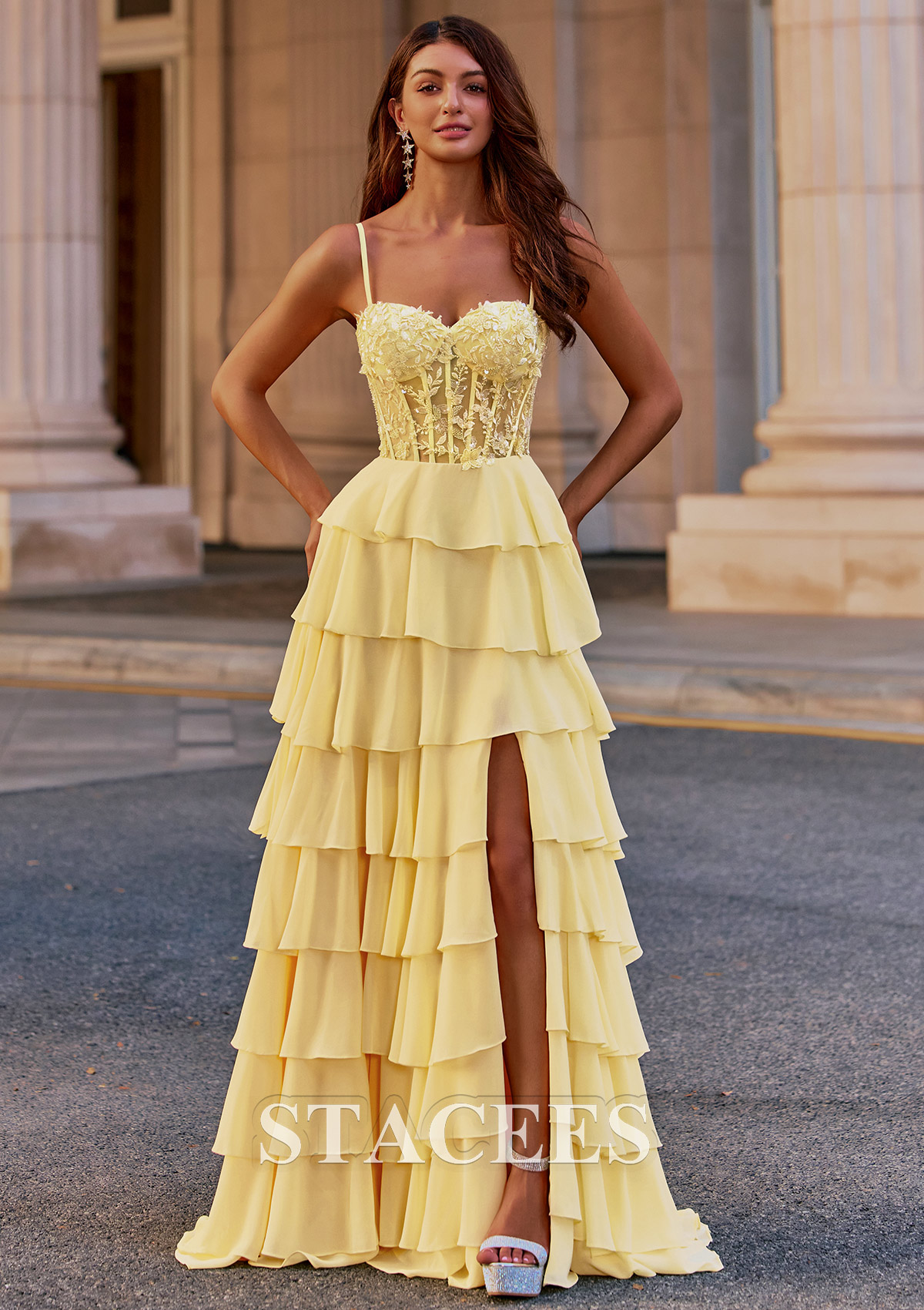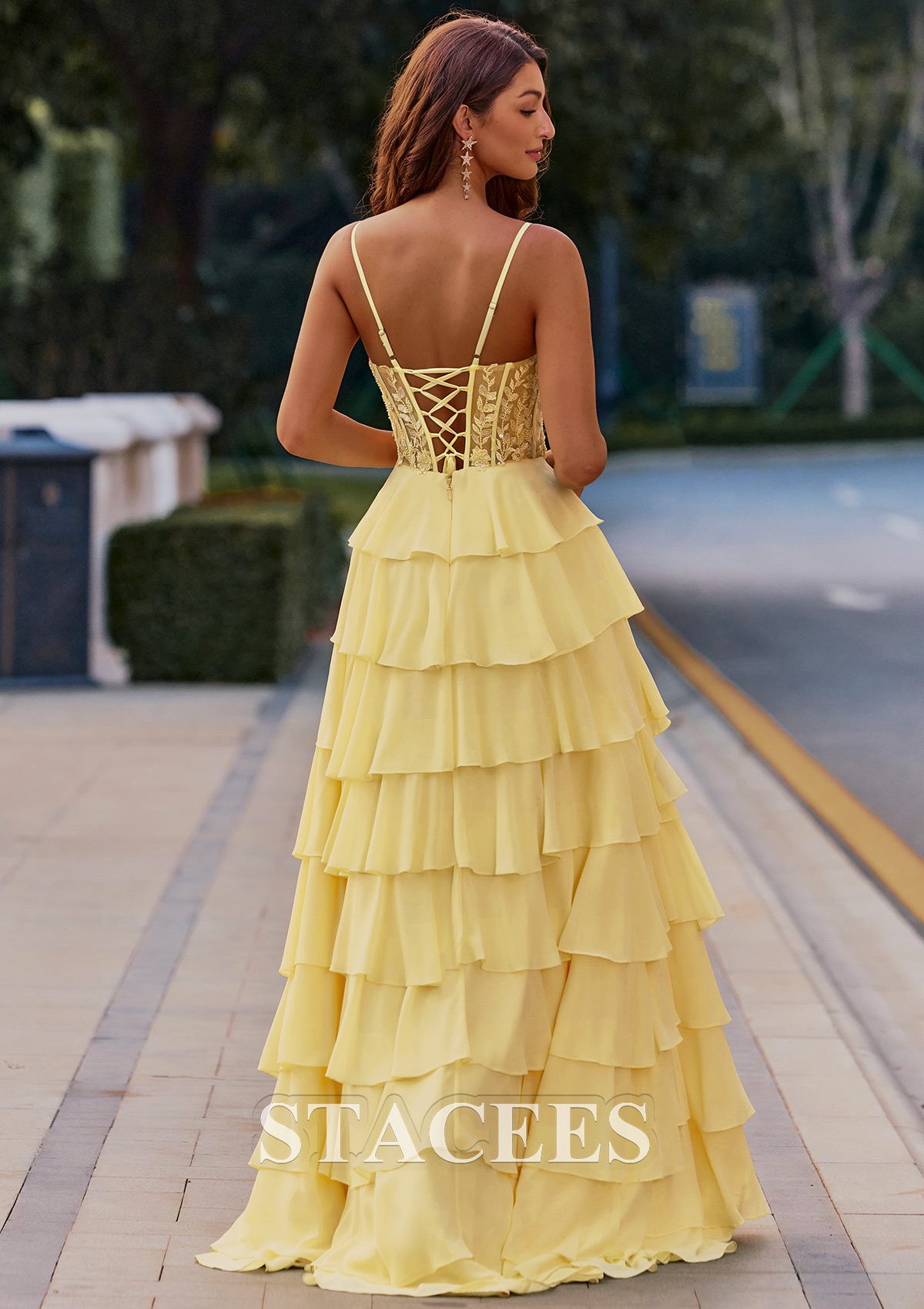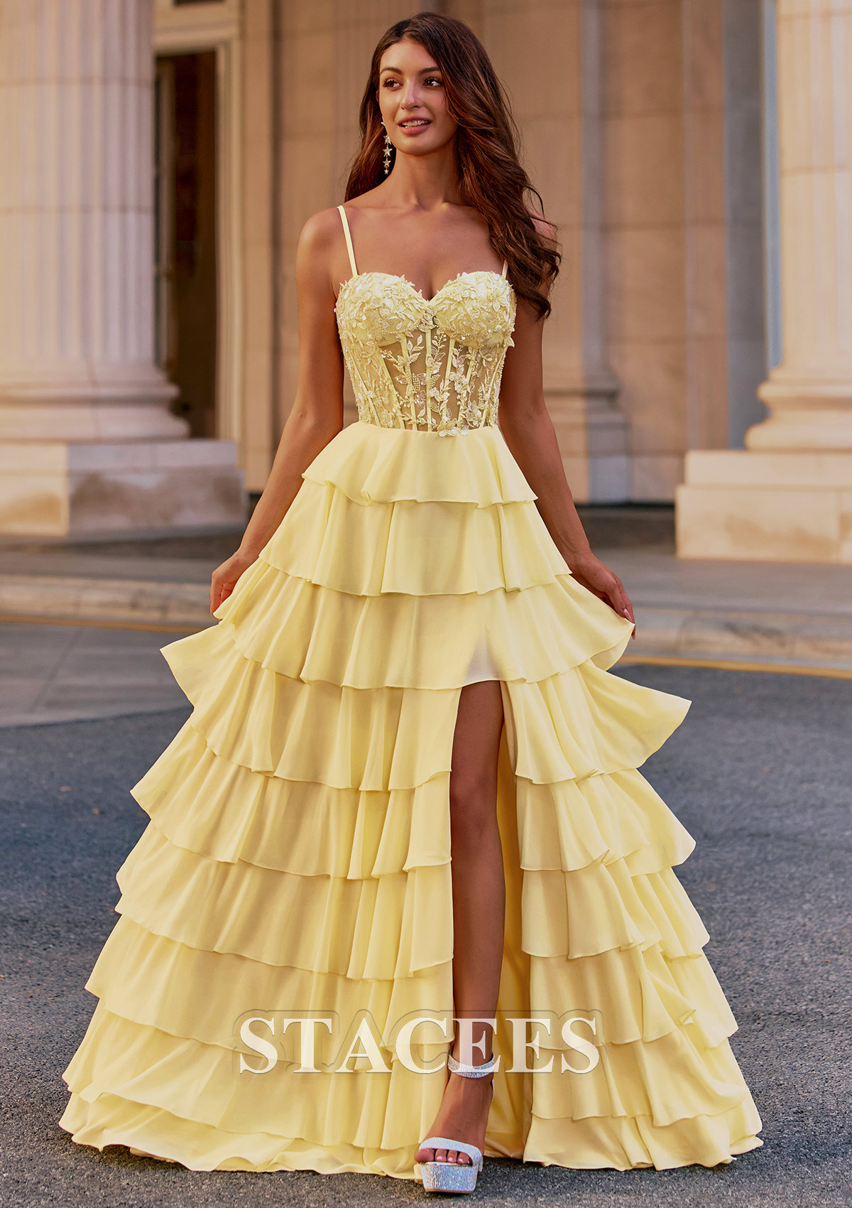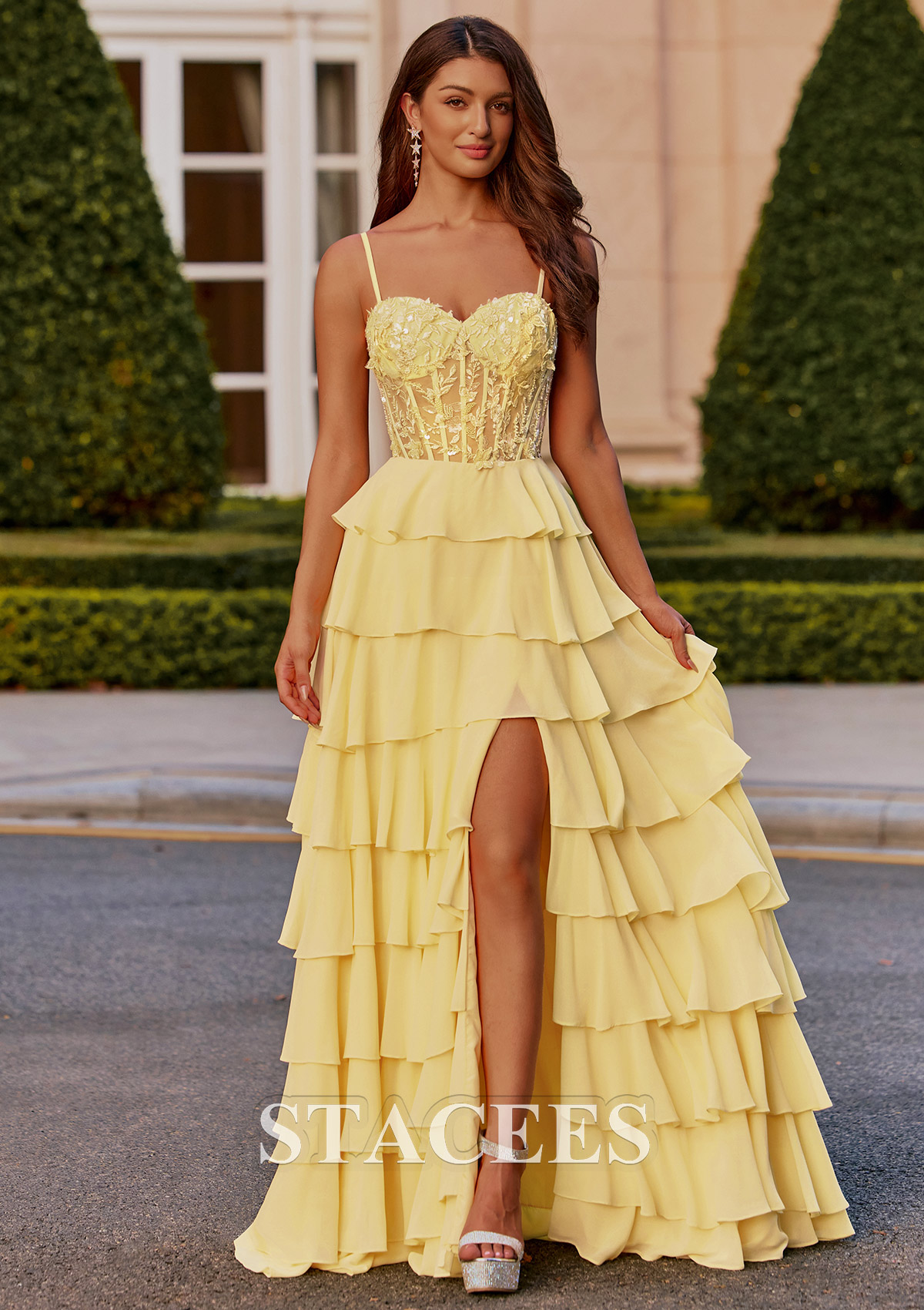 This elegant prom dress features a soft, pastel yellow hue and a beautifully detailed lace bodice. The structured corset-style top is adorned with delicate floral appliques and supported by thin spaghetti straps, offering a romantic and refined look. The back showcases a lace-up design for an adjustable, figure-flattering fit. The flowing skirt is made of layered chiffon tiers that create graceful movement with every step. A stylish thigh-high slit adds a touch of modern allure while maintaining the gown dreamy, feminine aesthetic. Perfect for prom, formal events, or any occasion where you want to shine with effortless charm.
