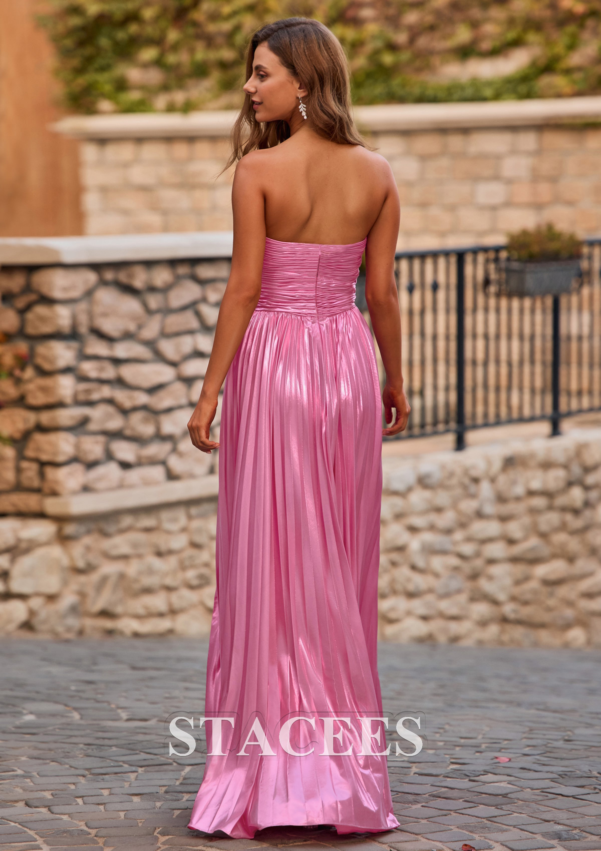 Nicely pleated, this long metallic prom dress with smooth lines is as figure-flattering as it is alluring. Creating a romantic yet fascinating atmosphere, the stunning prom dress features a strapless sweetheart neckline, keyhole detailing, and a full-length A-line silhouette with a left-slit skirt in flowy A-line silhouette, while the lace-up back accentuates female sexy figure perfectly. Crafted with high-quality metallic material, it adds a touch of glamour to the already stunning design. In standard and plus size, more colors are available, this long formal dress in metallic fabric sparkles for your big prom, like masquerade.