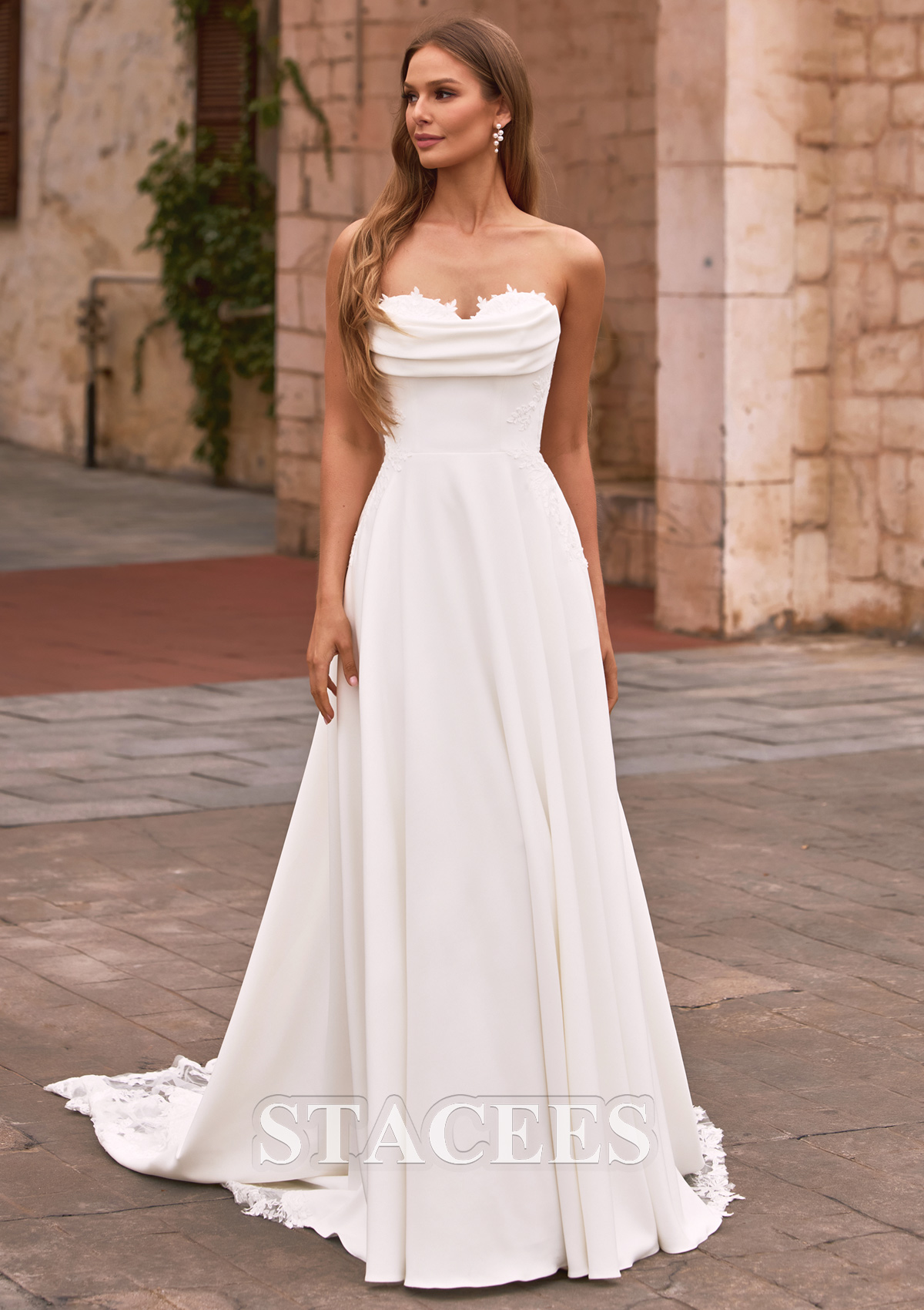 This strapless A-line wedding gown blends minimalist modern lines with romantic lace details. The softly sweetheart neckline frames the collarbone while the fitted bodice flows into a full crepe skirt for effortless movement. Subtle lace appliqué at the waist and a sheer, lace-trimmed chapel train add feminine texture and photo-ready drama. One of the most practical and stylish details of this gown is the hidden side pockets, perfect for keeping small essentials close during weddings. The back features a clean zipper closure for a seamless and secure fit. The dress finishes with a graceful sweep train adorned with lace accents, creating a soft and romantic statement as you walk. This dress combines modern functionality with classic formal elegance, making it ideal for a variety of special occasions.