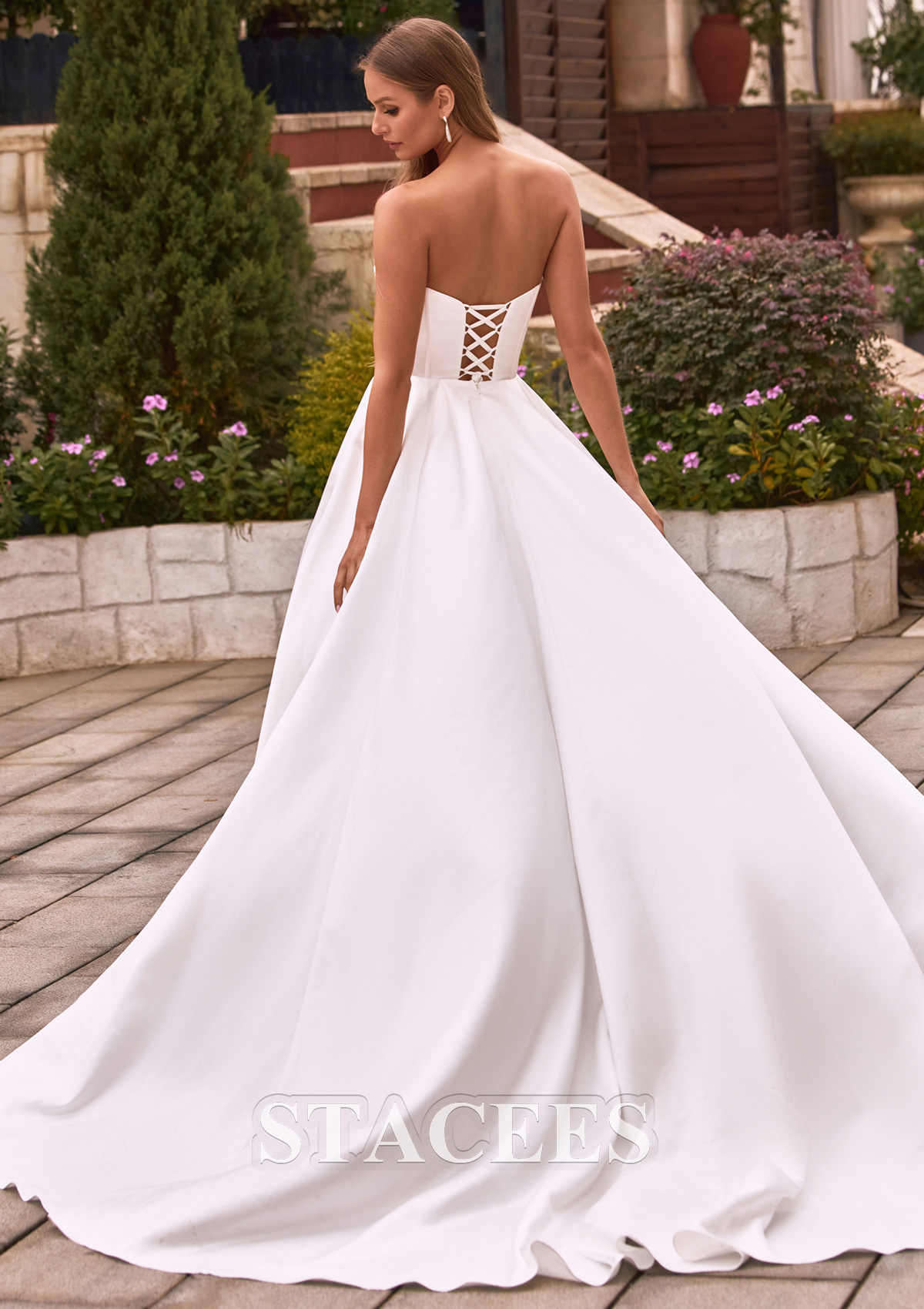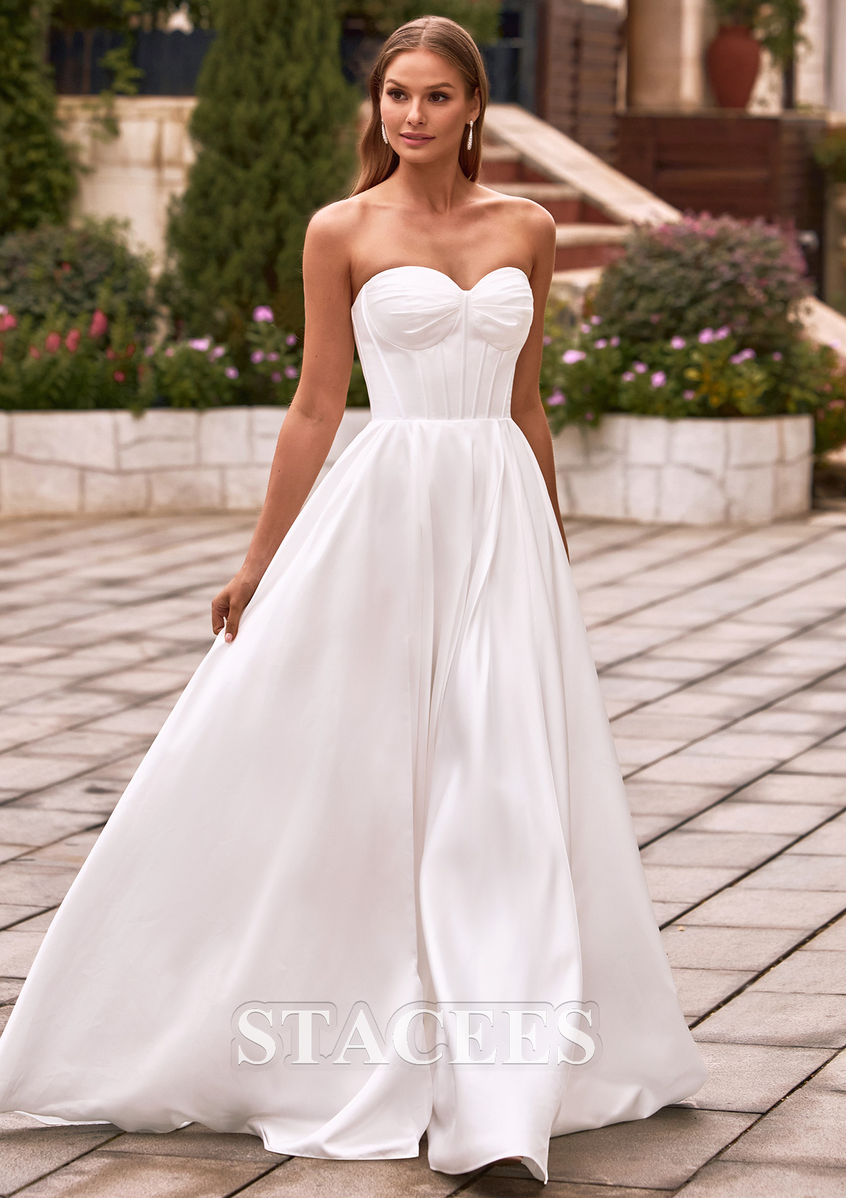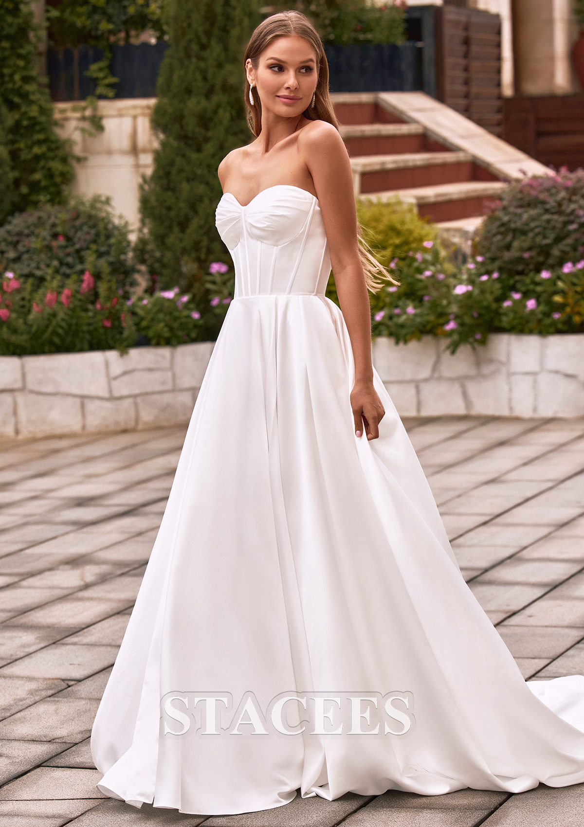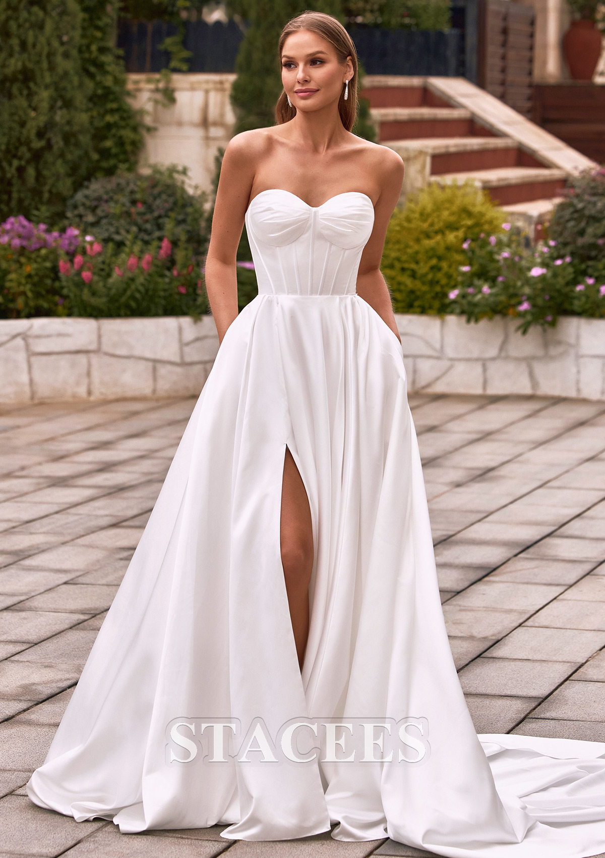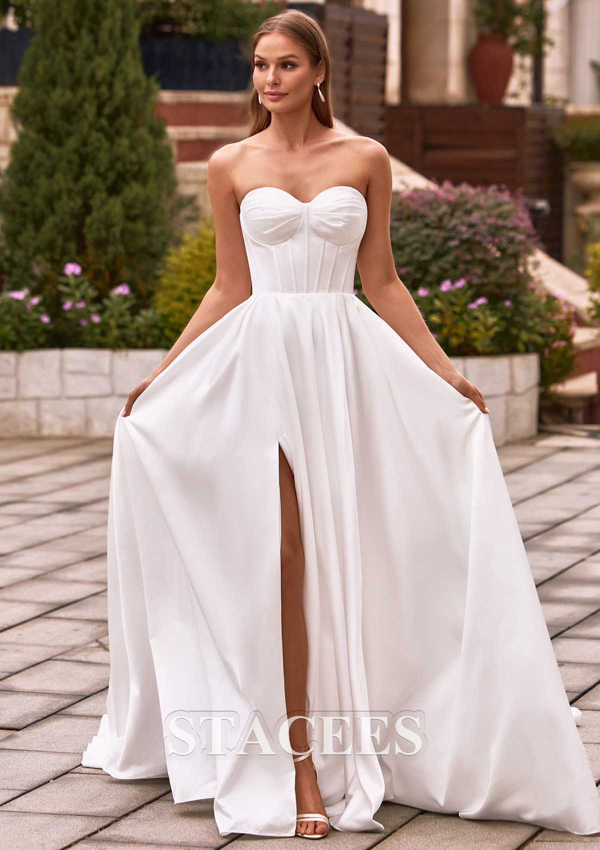 This stunning strapless A-line wedding dress is a perfect blend of minimalist elegance and modern sophistication. The gown features a stunning sweetheart neckline that beautifully frames the décolletage. This structured corset features a vertical fishbone design that accentuates a slender waistline, creating a beautiful and flowing silhouette that adds a touch of high fashion, comparable to haute couture on the runway. Flowing from the natural waist is a voluminous A-line skirt crafted from luxurious, high-luster satin. The skirt is designed with a daring thigh-high slit, allowing for effortless movement and a peek of skin. This dress features a classic lace-up back design that is both practical and beautiful, ensuring a perfect fit while adding a touch of retro romance.