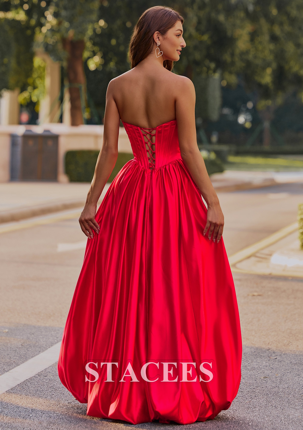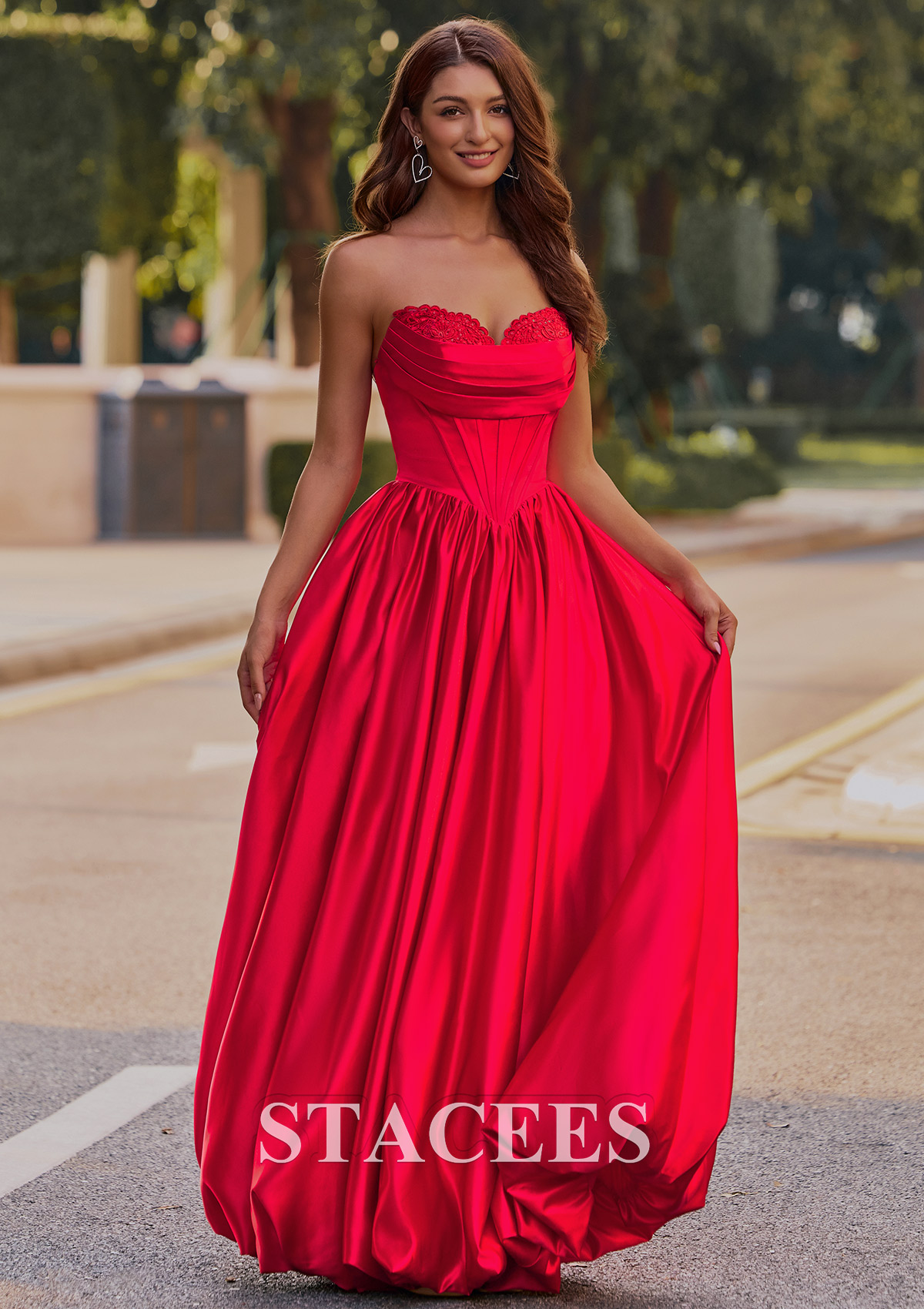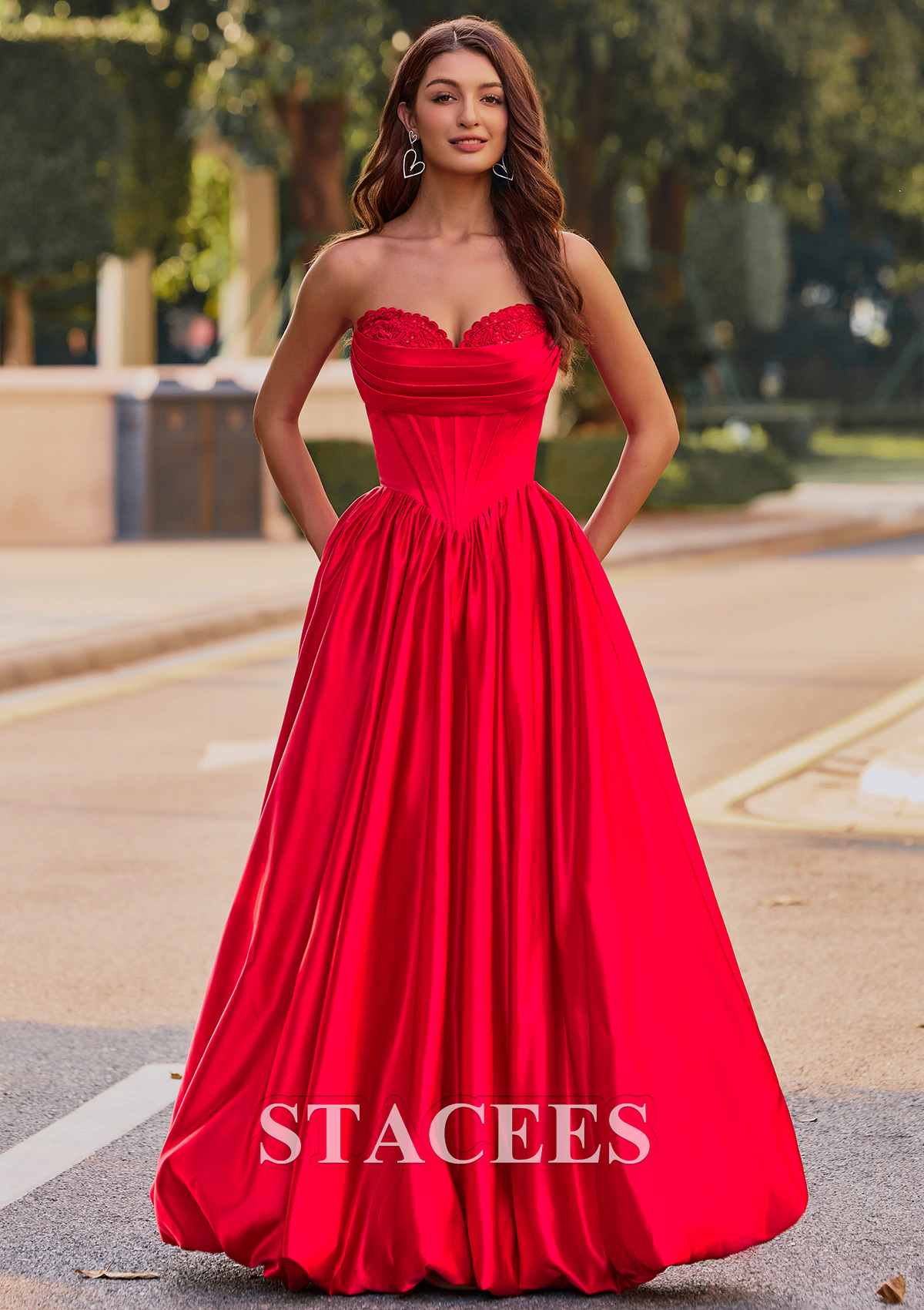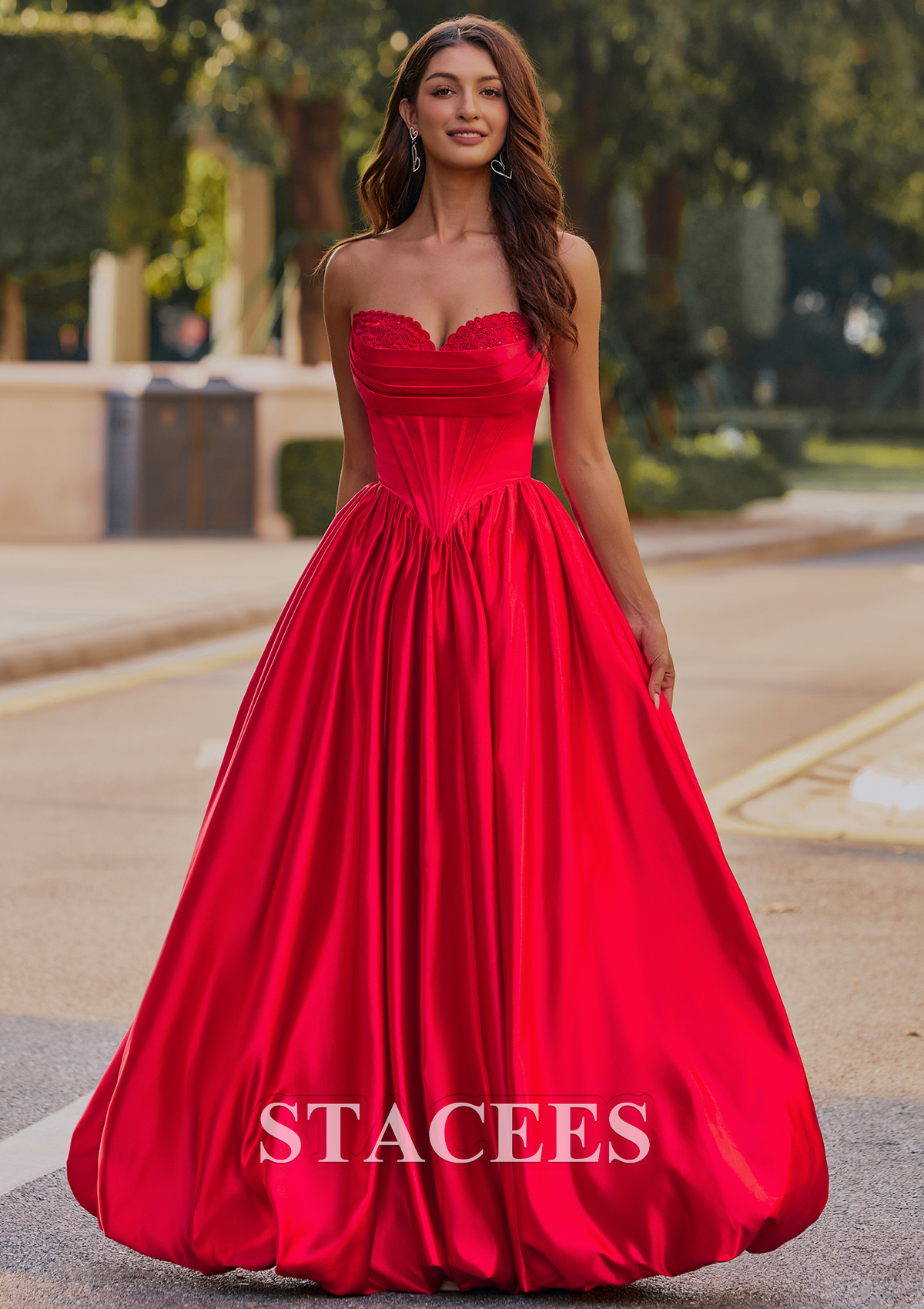 This captivating satin prom dress exudes elegance and glamour. Featuring a strapless sweetheart neckline adorned with delicate lace detailing, the fitted corset-style bodice seamlessly flows into a voluminous, floor-length skirt. The dress creates a flattering silhouette with its cinched waist and beautiful, flowing pleats. A lace-up back design ensures a customizable, snug fit, while adding a touch of sophistication. But the real showstopper is the skirt. It features a playful, voluminous bubble hem that's practically begging you to hit the dance floor. This is not just another prom or homecoming gown, it is your ultimate confidence booster, designed for an unforgettable night. So go ahead, embrace the spotlight and twirl to your hearts content. Crafted from rich, lustrous material that shimmers in natural light, this gown combines classic princess aesthetics with modern sophistication. Perfect for making a memorable entrance at any prom or formal occasion.