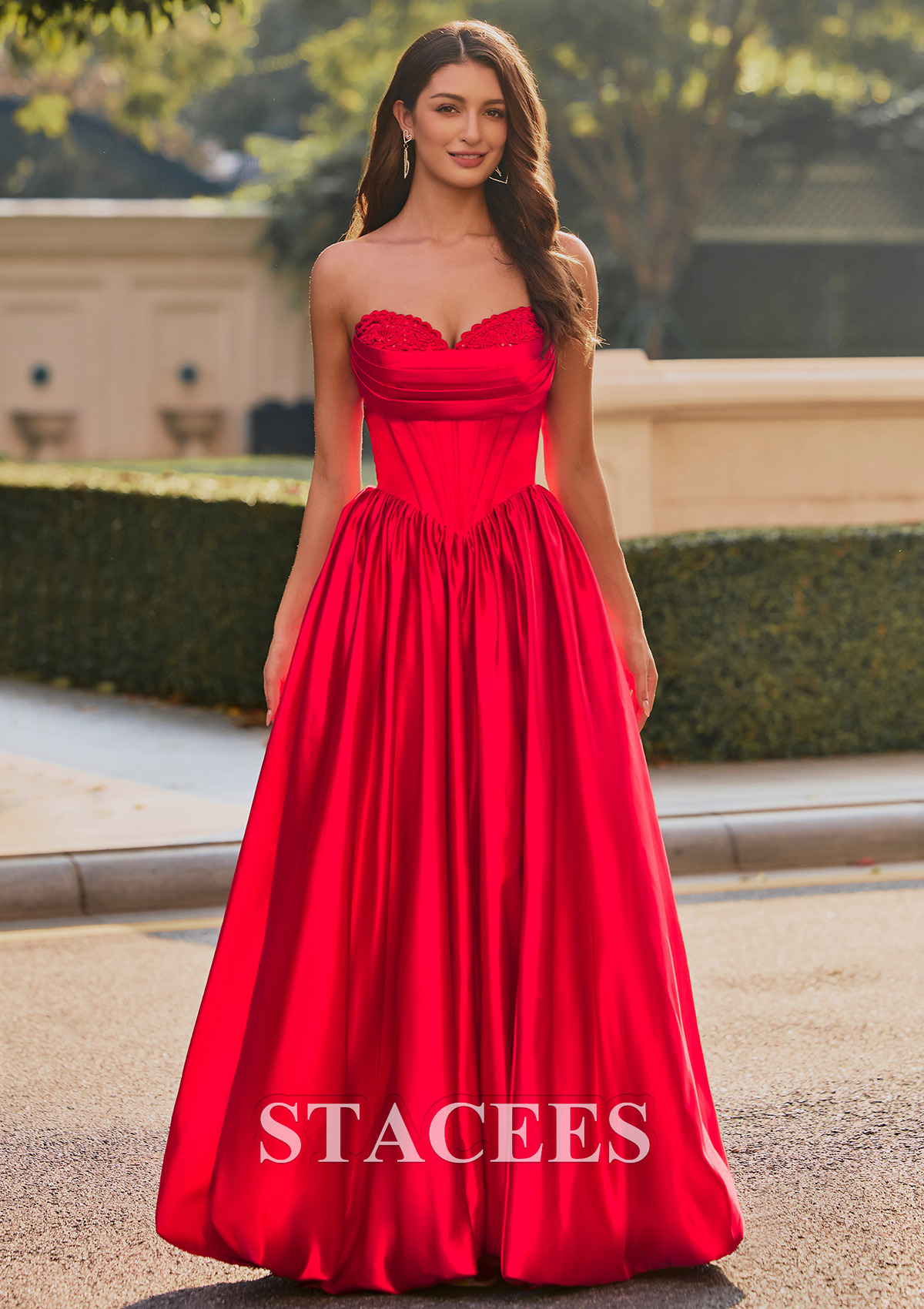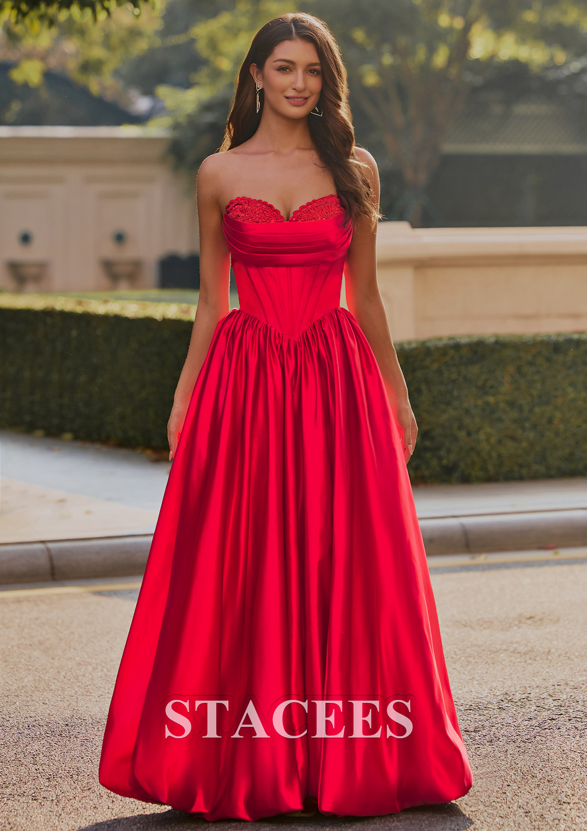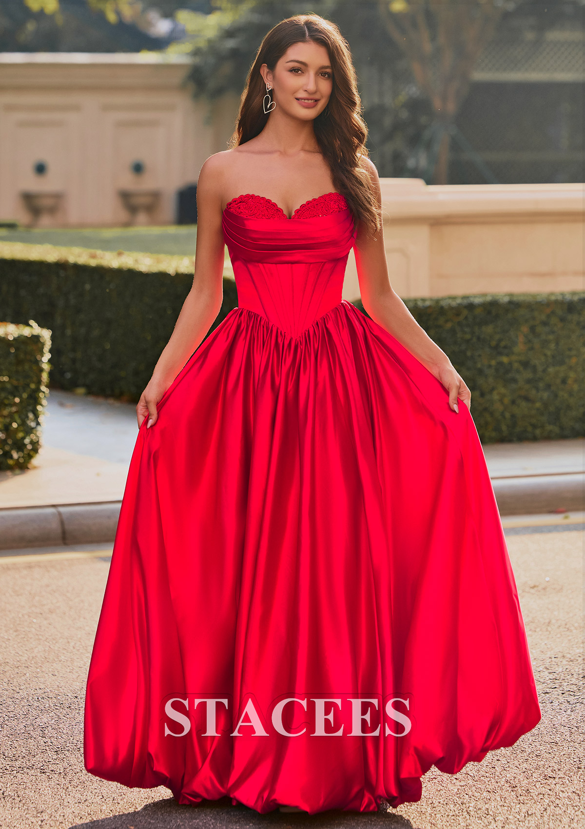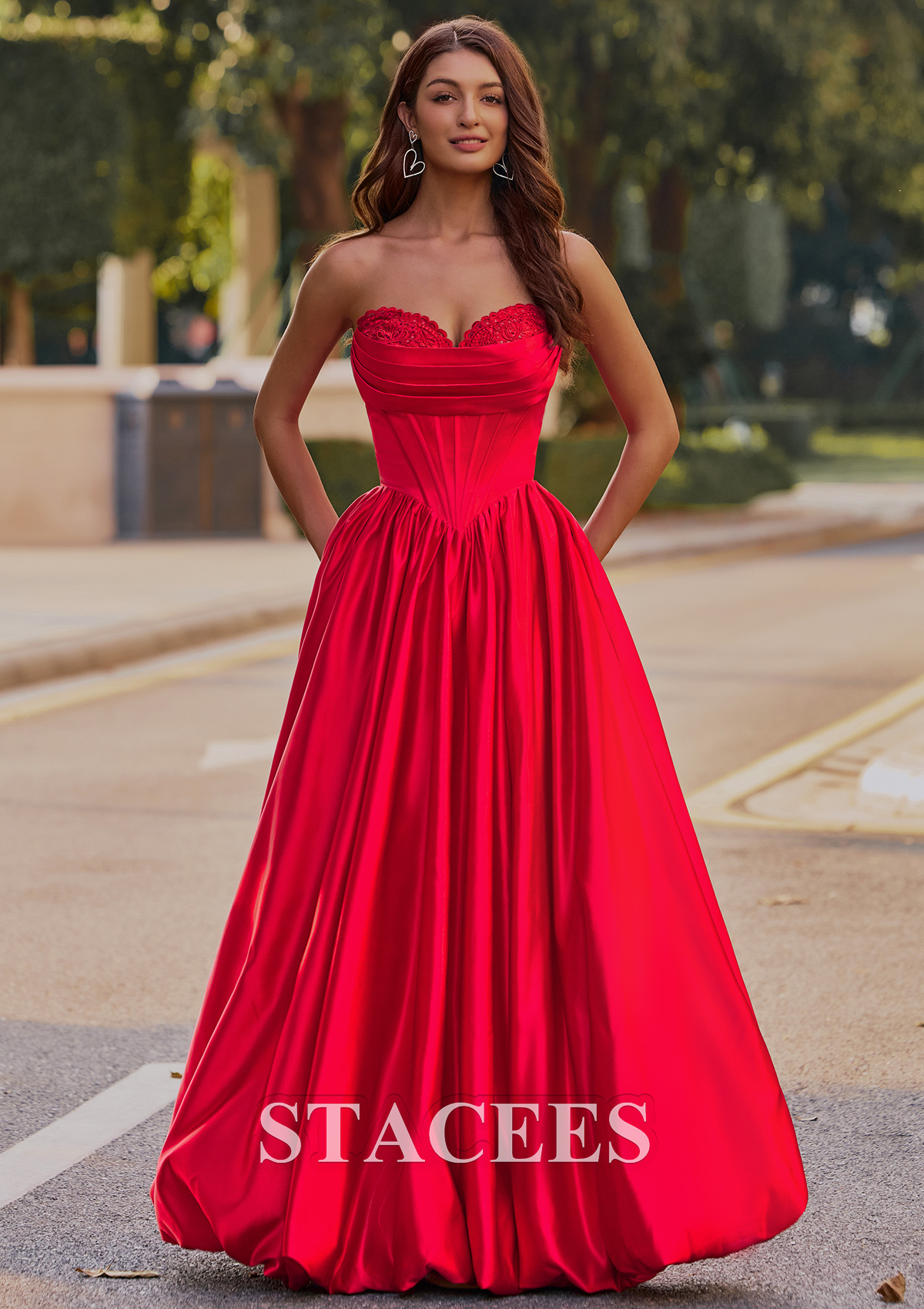 This captivating satin prom dress exudes elegance and glamour. Featuring a strapless sweetheart neckline adorned with delicate lace detailing, the fitted corset-style bodice seamlessly flows into a voluminous, floor-length skirt. The dress creates a flattering silhouette with its cinched waist and beautiful, flowing pleats. A lace-up back design ensures a customizable, snug fit, while adding a touch of sophistication. But the real showstopper is the skirt. It features a playful, voluminous bubble hem that's practically begging you to hit the dance floor. This is not just another prom or homecoming gown, it is your ultimate confidence booster, designed for an unforgettable night. So go ahead, embrace the spotlight and twirl to your hearts content. Crafted from rich, lustrous material that shimmers in natural light, this gown combines classic princess aesthetics with modern sophistication. Perfect for making a memorable entrance at any prom or formal occasion.