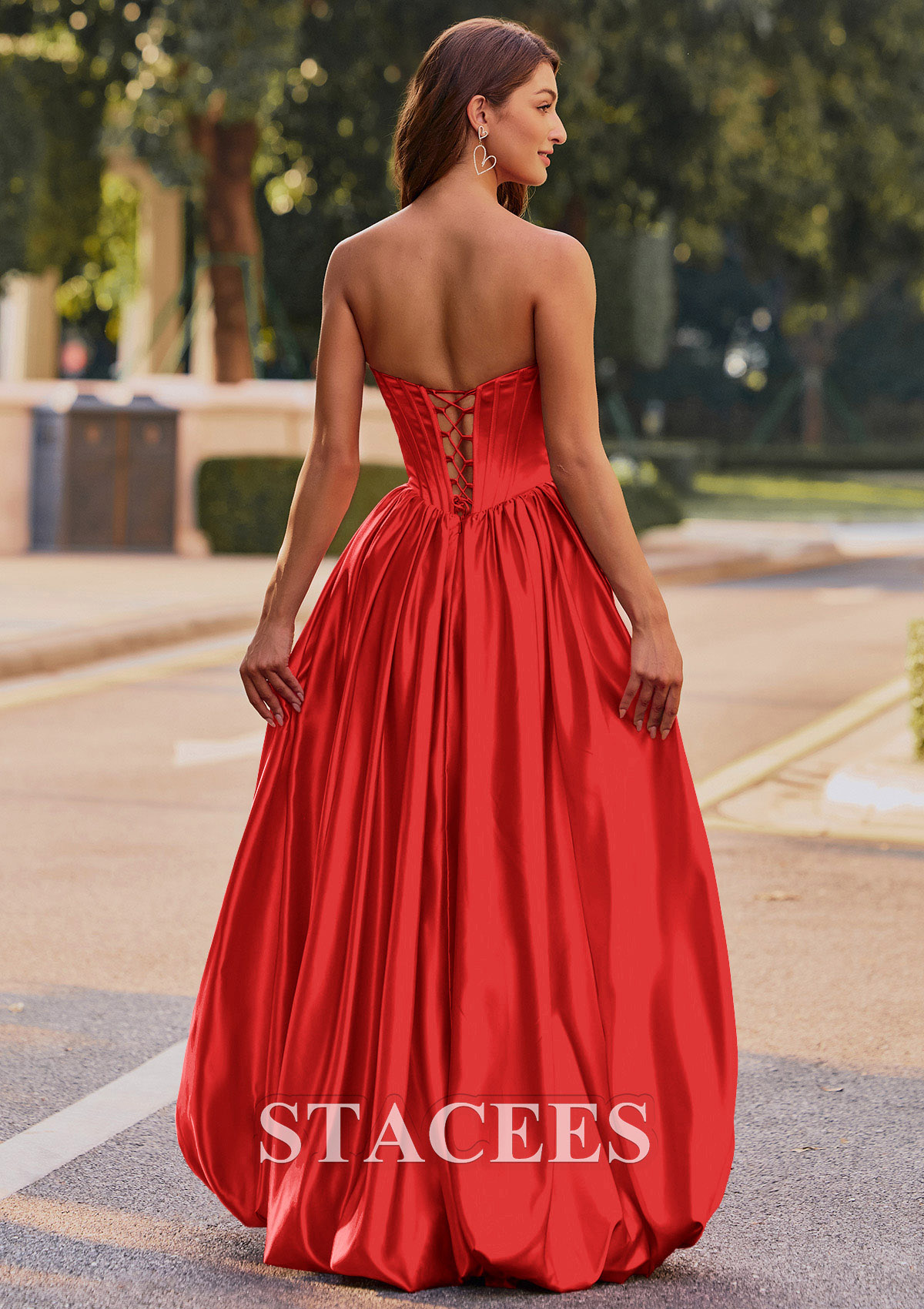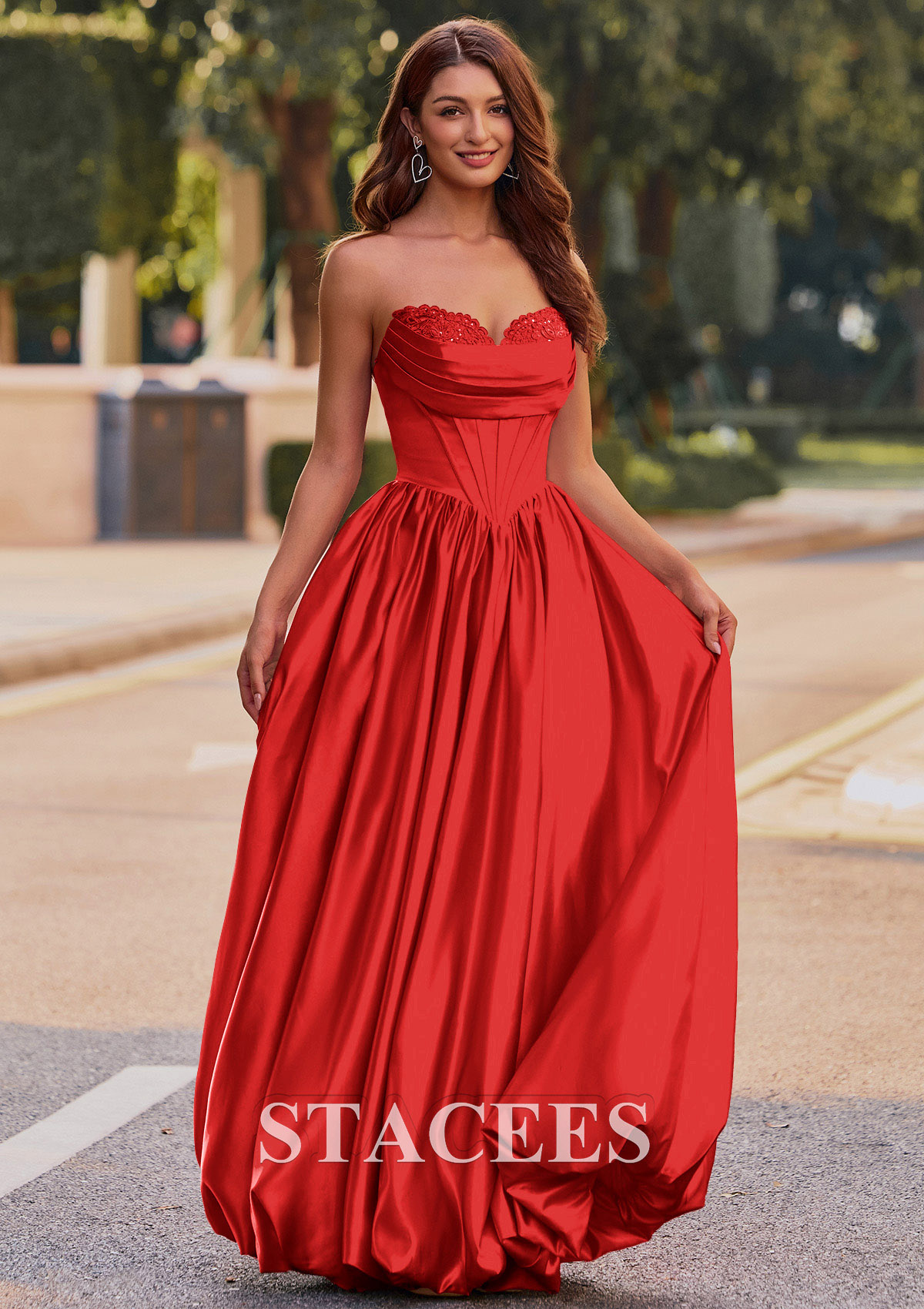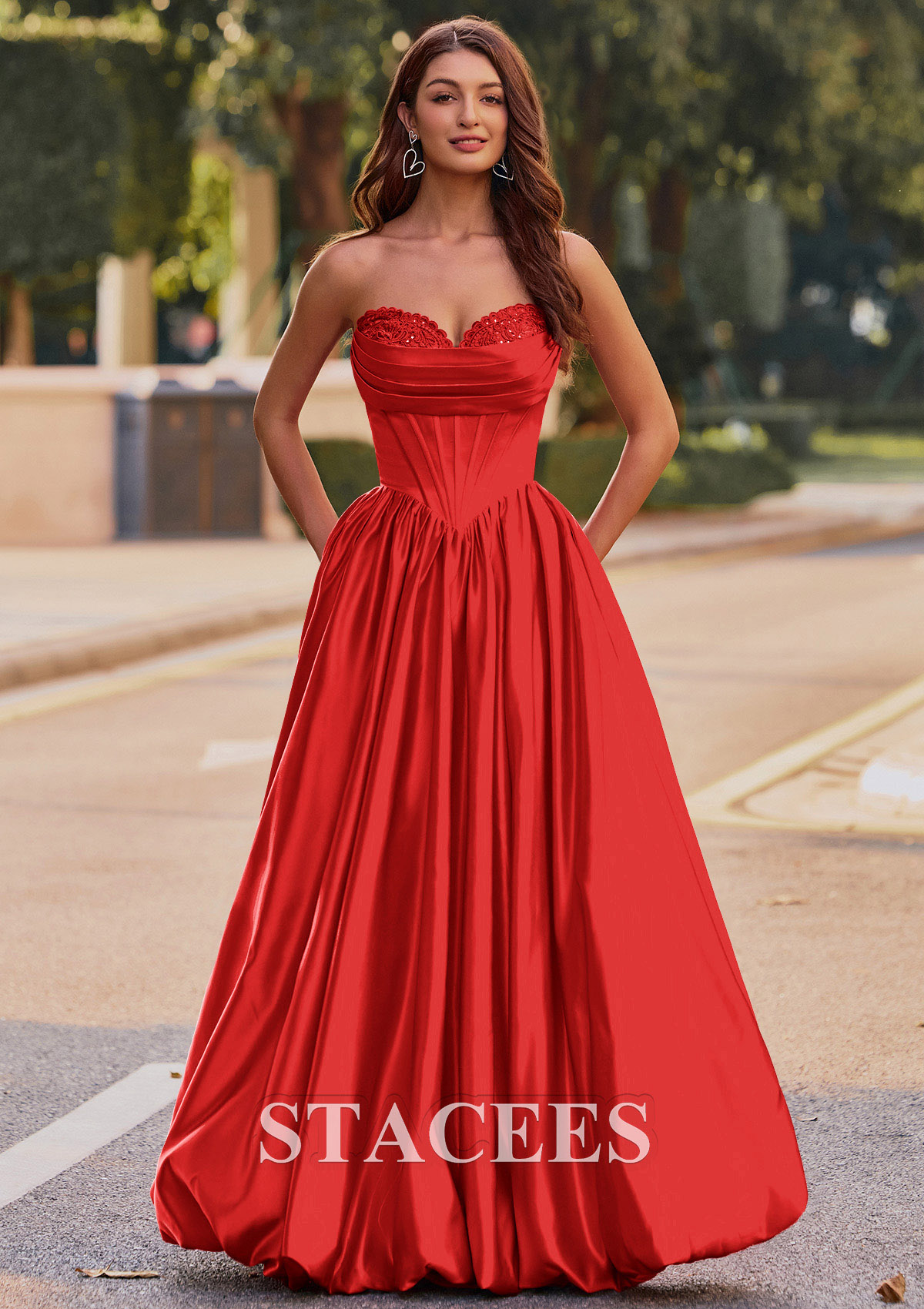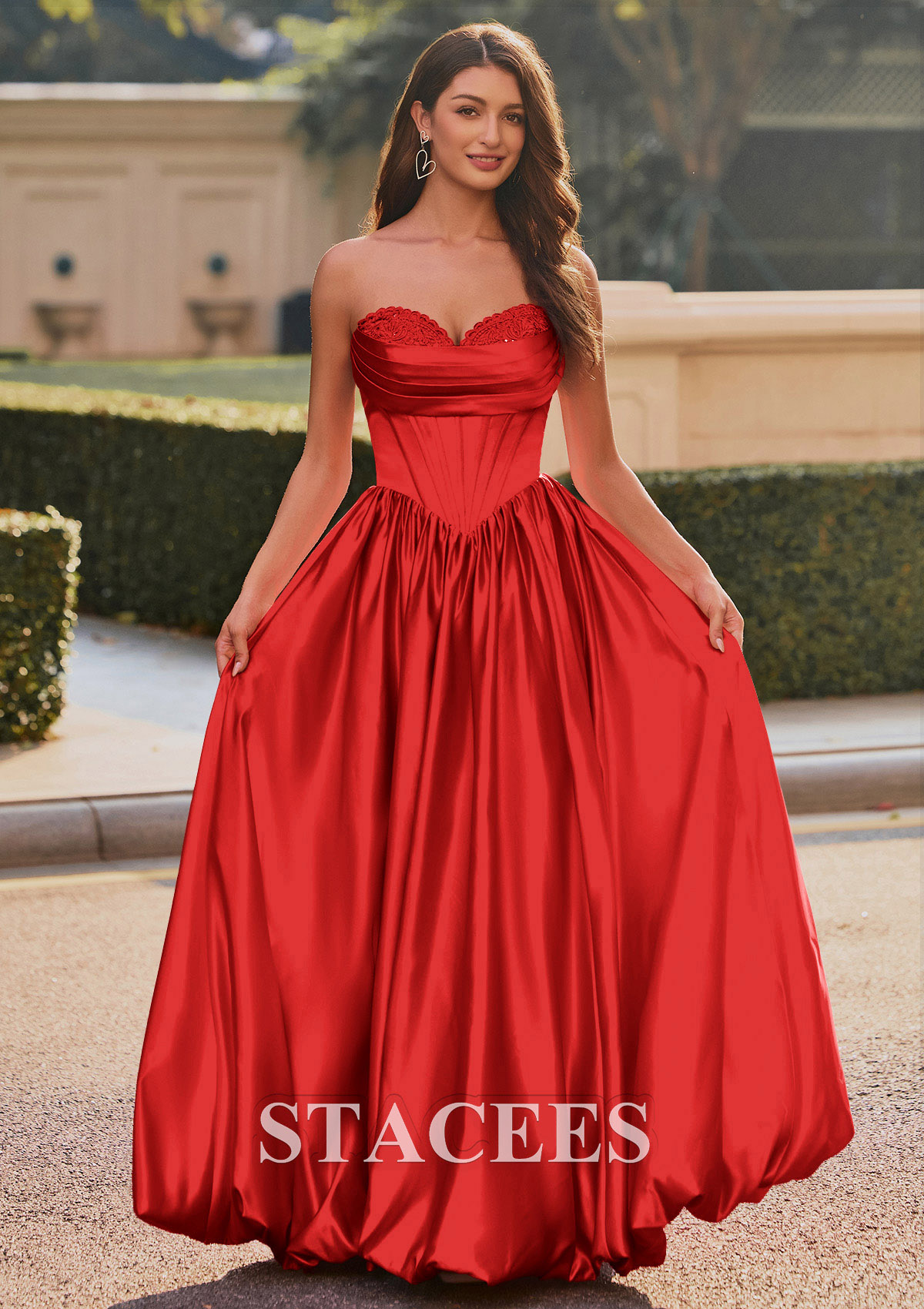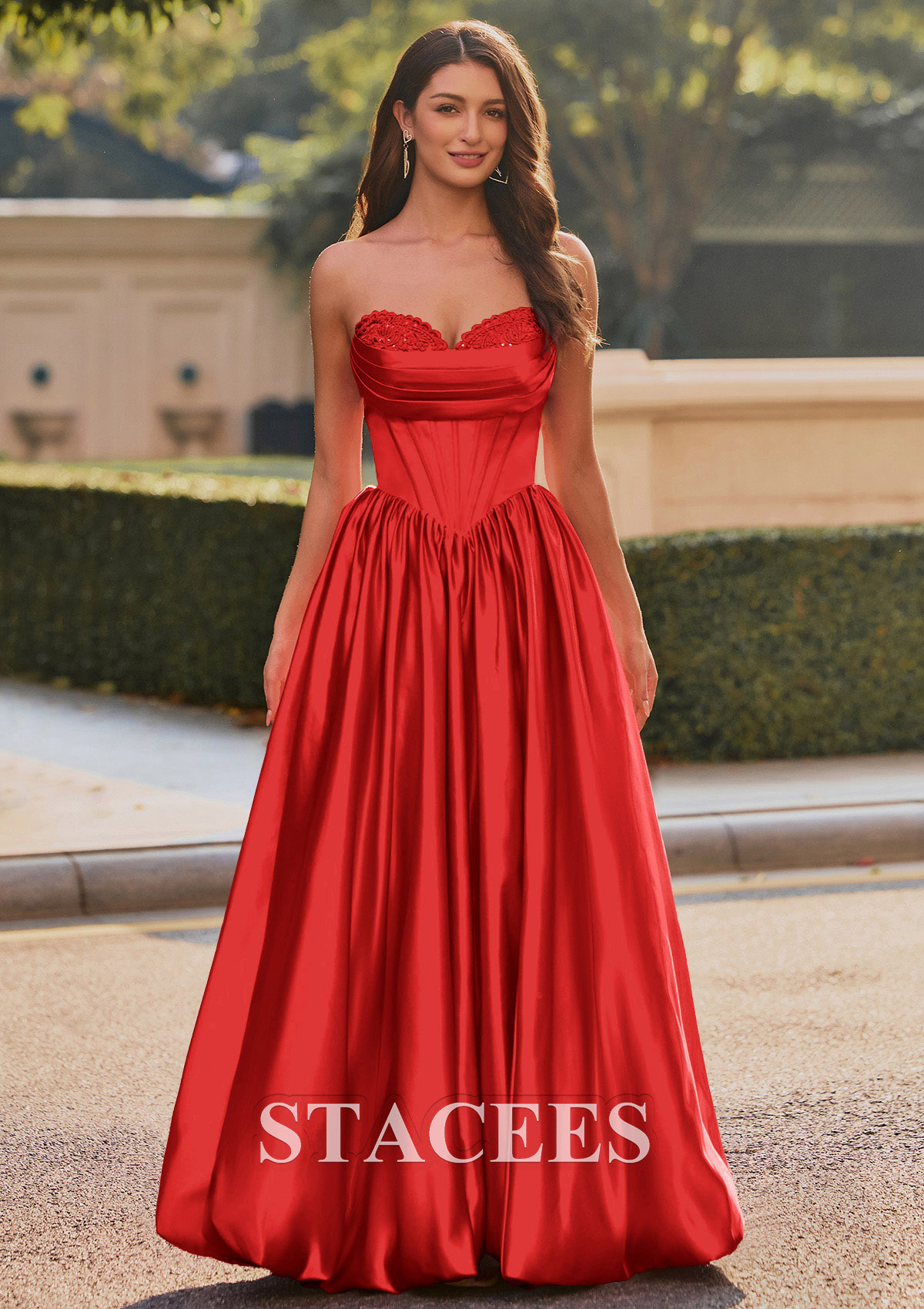 This captivating satin prom dress exudes elThis captivating satin prom dress exudes elegance and glamour. Featuring a strapless sweetheart neckline adorned with delicate lace detailing, the fitted corset-style bodice seamlessly flows into a voluminous, floor-length skirt. The dress creates a flattering silhouette with its cinched waist and beautiful, flowing pleats. Channel red carpet glamour in this strapless A-line gown with a pleated bodice and lace peek-a-boo detail. A lace-up back design ensures a customizable, snug fit, while adding a touch of sophistication. But the real showstopper is the skirt. It features a playful, voluminous bubble hem that is practically begging you to hit the dance floor. This is not just another prom or homecoming gown, it is your ultimate confidence booster, designed for an unforgettable night. So go ahead, embrace the spotlight and twirl to your hearts content.Crafted from rich, lustrous material that shimmers in natural light, this gown combines classic princess aesthetics with modern sophistication. Perfect for making a memorable entrance at any prom or formal occasion.