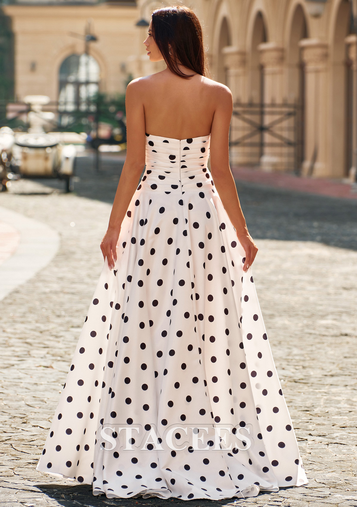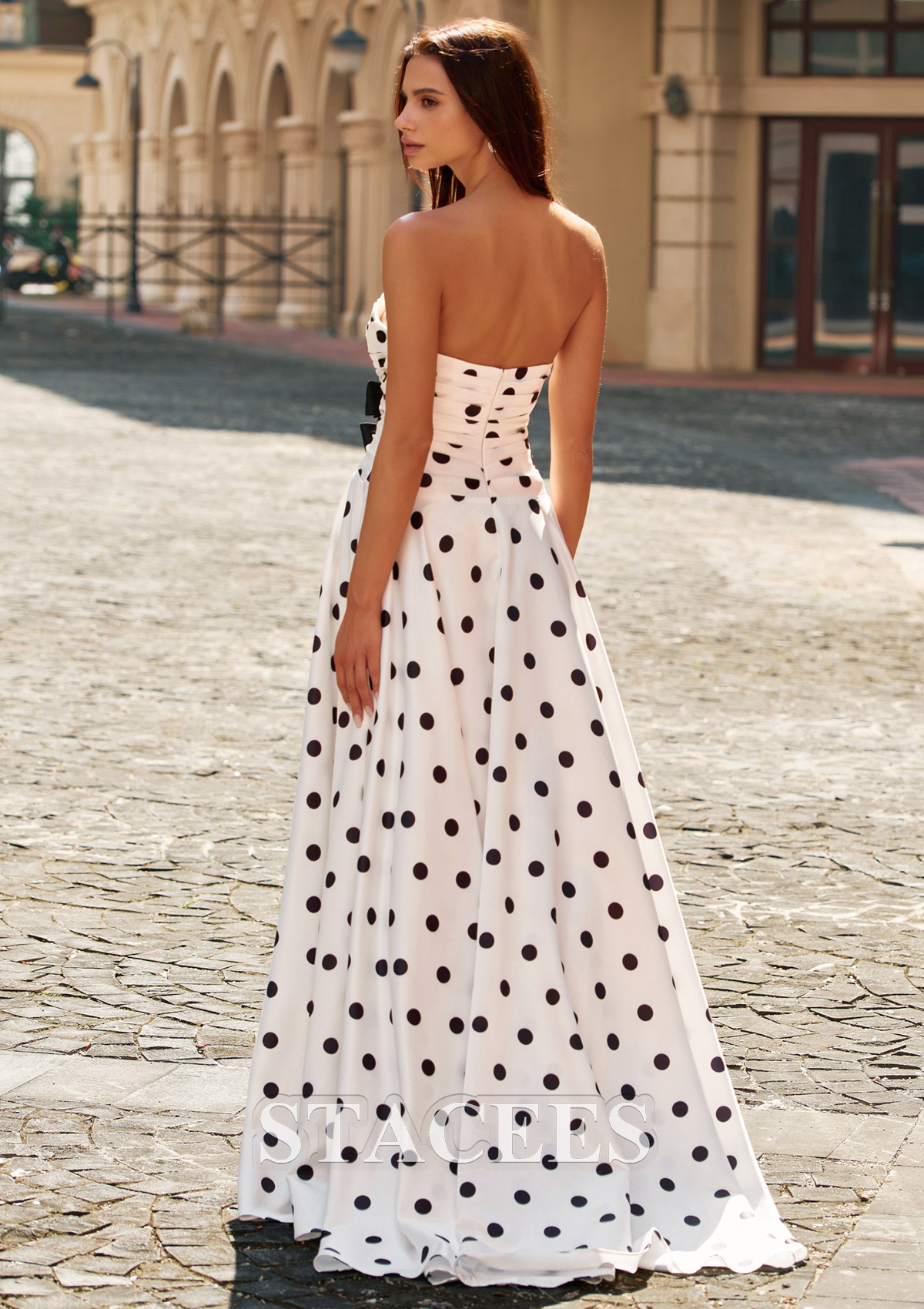 Stand out at prom in this retro‑chic white fabric black polka dot print prom dress featuring a strapless sweetheart neckline and three bold black bow cutouts on the bodice, a perfect blend of vintage charm and modern elegance. The flattering A-line silhouette flows into a full, floor-length skirt with a dramatic high thigh slit that shows off your heels and elongates your legs. The fitted bodice and secure back closure provide excellent support and a customized fit, making it ideal for prom, formal dances, evening parties, and special occasions. With its playful all-over black polka dots pattern and statement bow design, this strapless prom dress is an unforgettable choice for anyone seeking a standout look. Other color is black fabric white polka dot print with black bows.