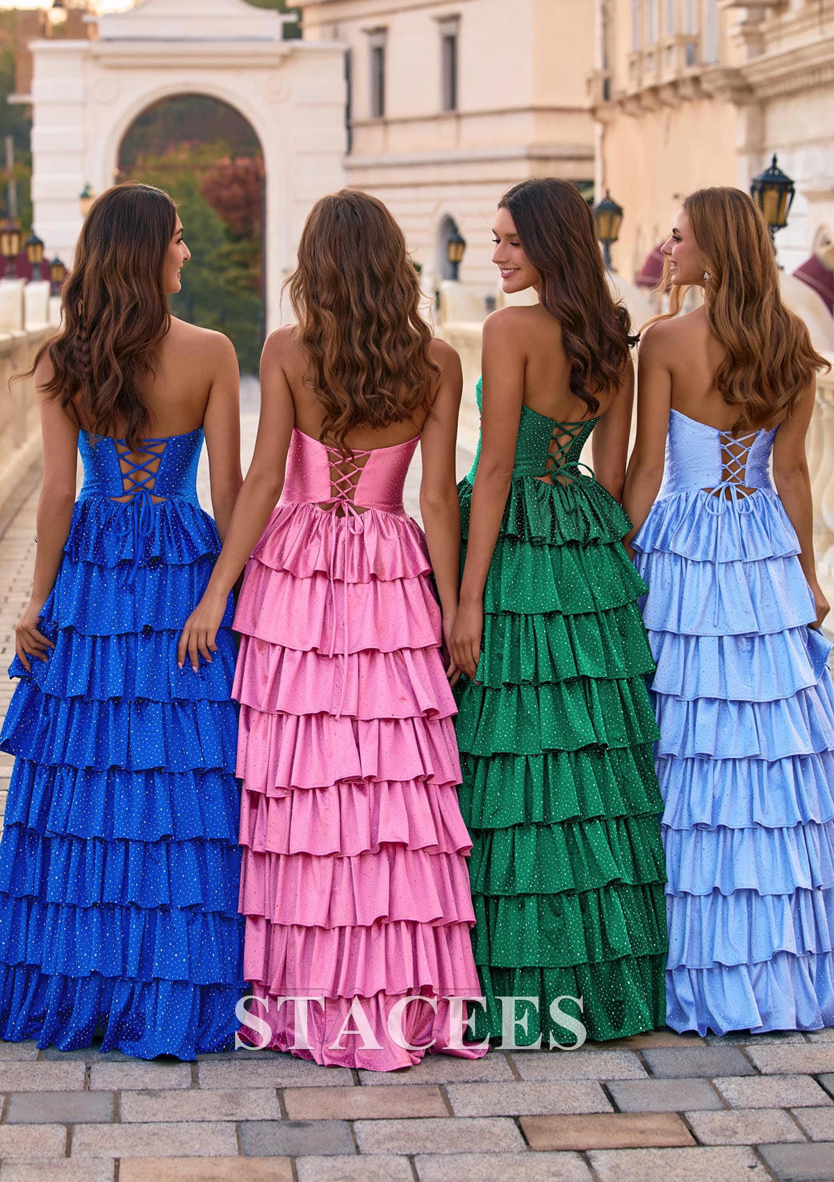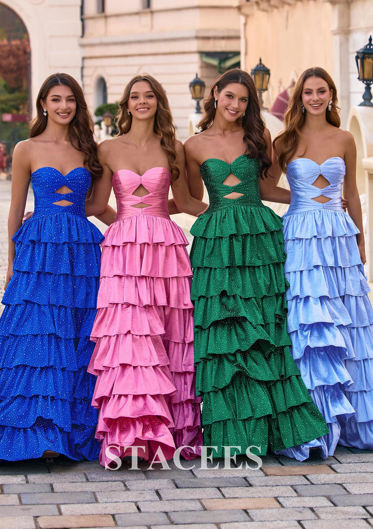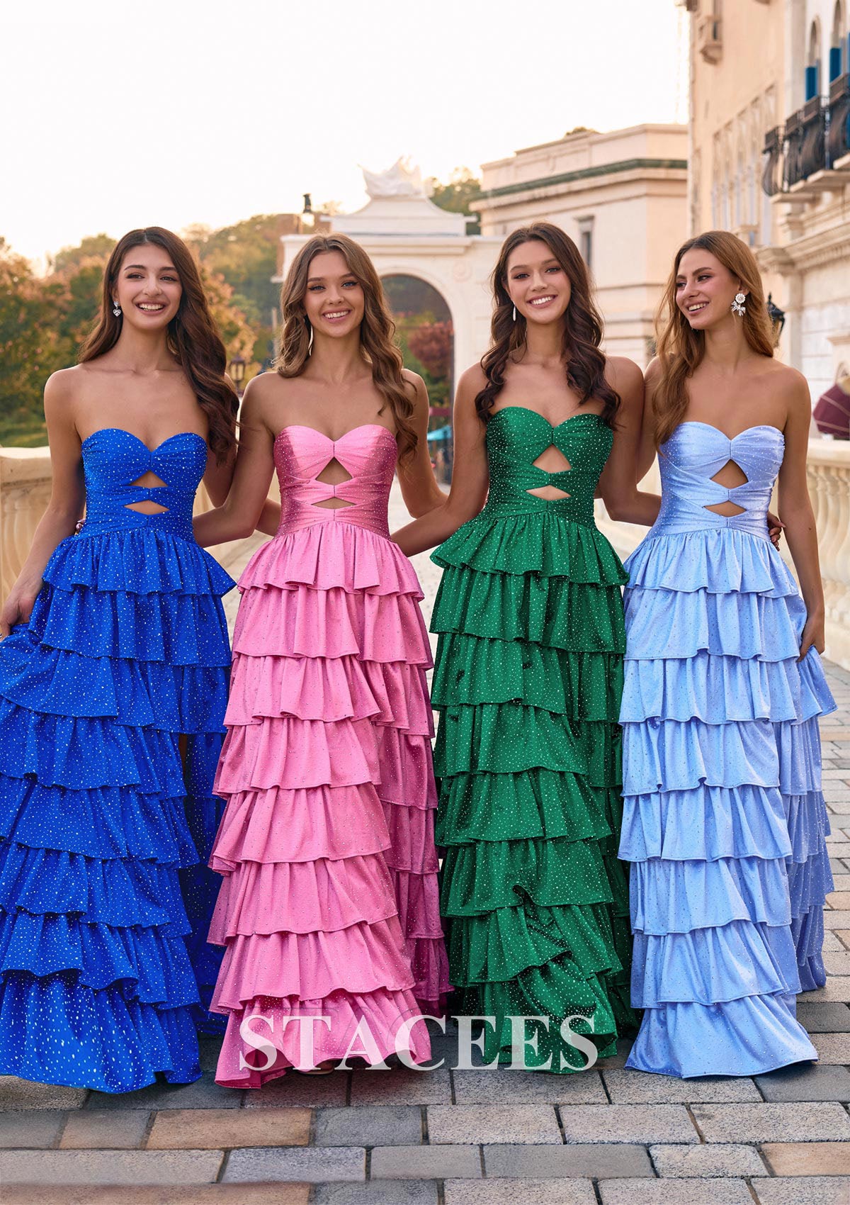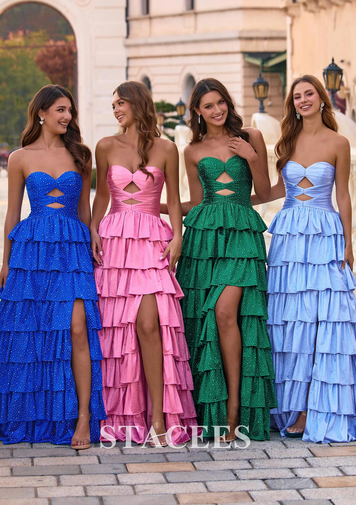 Featuring a structured corset bodice with delicate detailing and a fitting flattering neckline, this elegant gown combines charm and allure. Turn heads at prom night in this stunning strapless tiered ruffle prom dress, designed for anyone who loves a blend of glamour and playful elegance. This gown features a sweetheart neckline with chic front cut-out details, adding a modern twist to a classic silhouette. Its shimmering fabric catches the light beautifully, making you stand out from every angle. The flowing multi-layered ruffle skirt creates captivating movement, while the thigh-high slit adds the perfect touch of sophistication and confidence. The lace-up corset back offers an adjustable, flattering fit that enhances your natural shape. Crafted in a silk-like satin fabric with sparkly hot fix and available in multiple colors such as royal blue, pink, emerald green, and light blue, this floor-length dress is ideal for making a lasting impression at prom, pageants, formal events, or any occasion where you want to make a bold, unforgettable entrance.