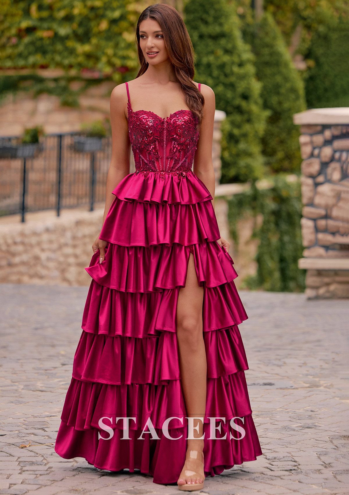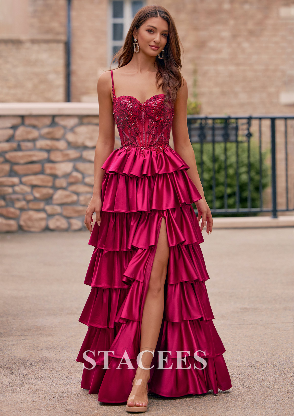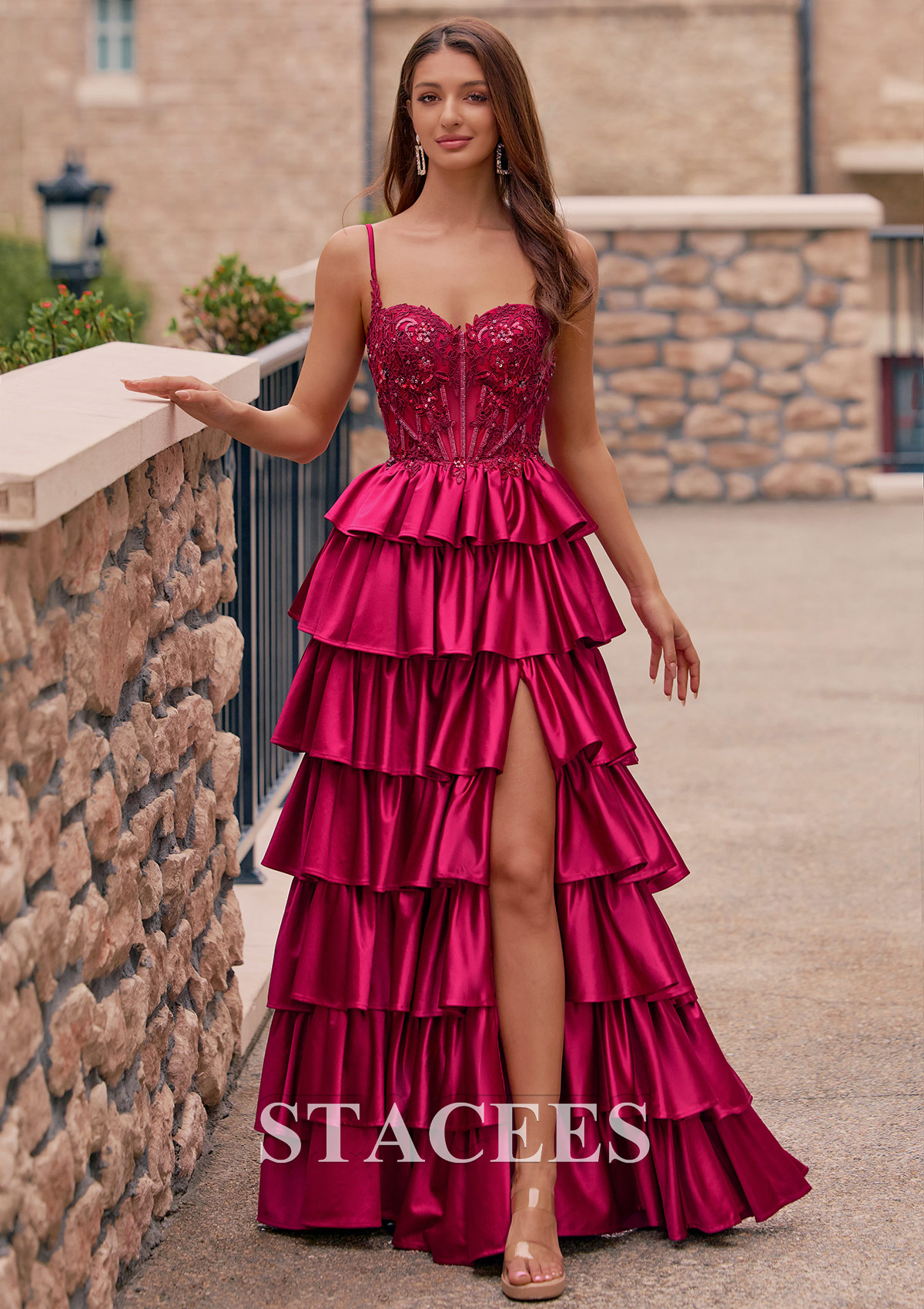 Make a dramatic entrance in this stunning prom dress, an unforgettable A-line gown crafted from lustrous silk like satin fabric.This eye-catching prom dress features a vibrant color and a corseted bodice beautifully adorned with sparkling embroidery and beading. Delicate spaghetti straps frame the shoulders, while the fitted top leads into a dramatic multi-tiered ruffled skirt that adds plenty of volume and movement. A striking front slit gives a bold modern twist, showing off the legs and making it easy to dance the night away. The back is designed with a lace-up detail for an adjustable, secure fit. Elegant and attention-grabbing, this gown is perfect for anyone seeking a glamorous and unique look for prom or a special evening event.