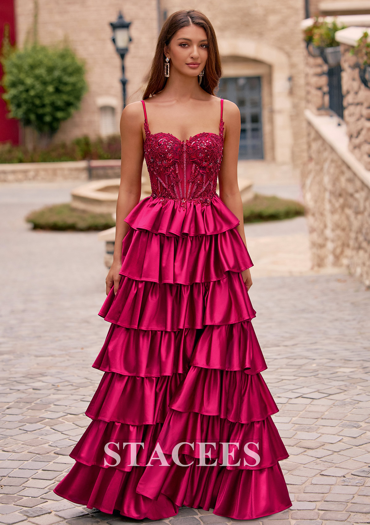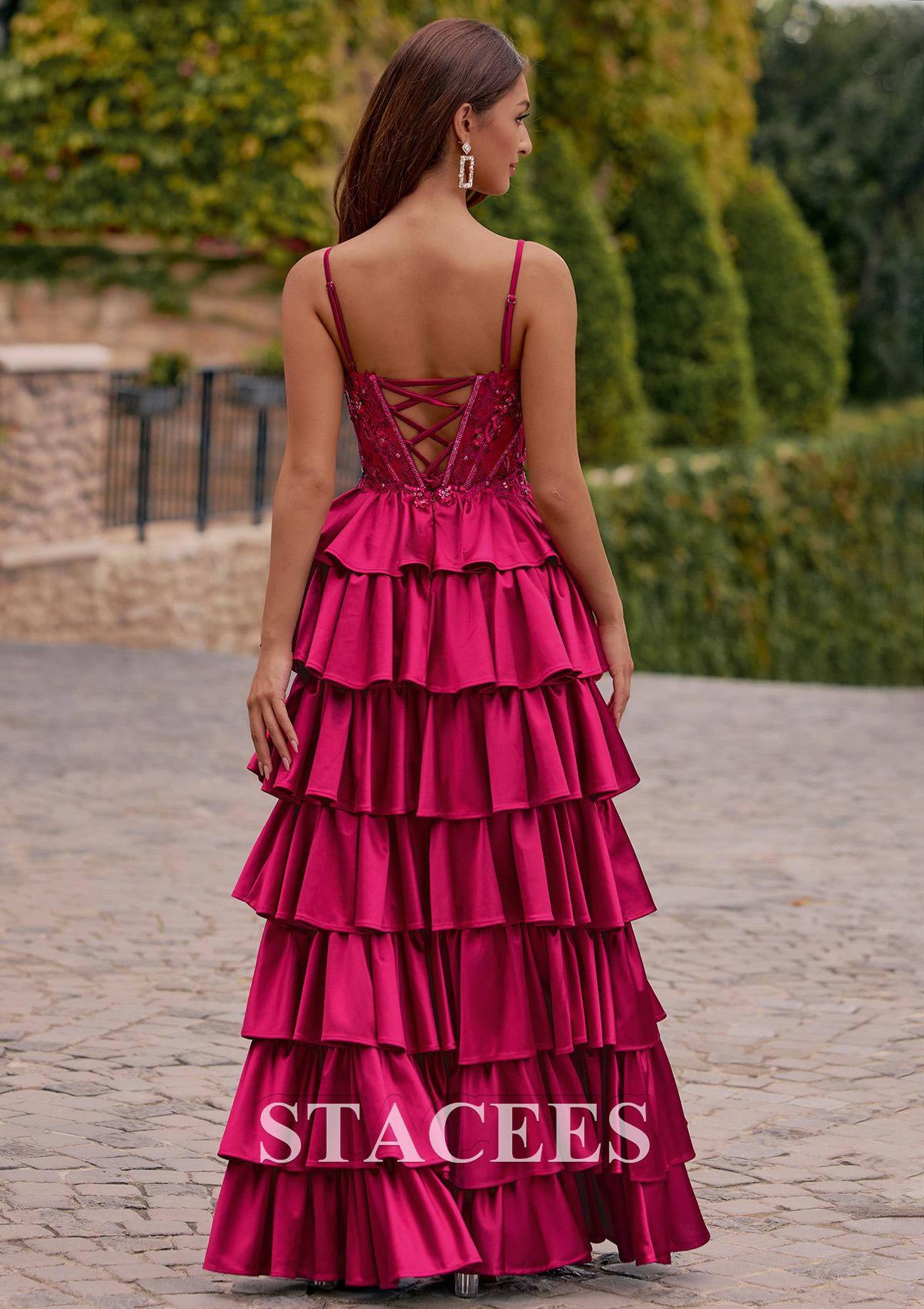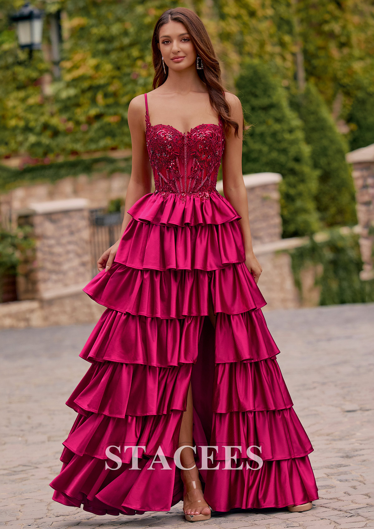 Make a dramatic entrance in this stunning prom dress, an unforgettable A-line gown crafted from lustrous silk like satin fabric.This eye-catching prom dress features a vibrant color and a corseted bodice beautifully adorned with sparkling embroidery and beading. Delicate spaghetti straps frame the shoulders, while the fitted top leads into a dramatic multi-tiered ruffled skirt that adds plenty of volume and movement. A striking front slit gives a bold modern twist, showing off the legs and making it easy to dance the night away. The back is designed with a lace-up detail for an adjustable, secure fit. Elegant and attention-grabbing, this gown is perfect for anyone seeking a glamorous and unique look for prom or a special evening event.