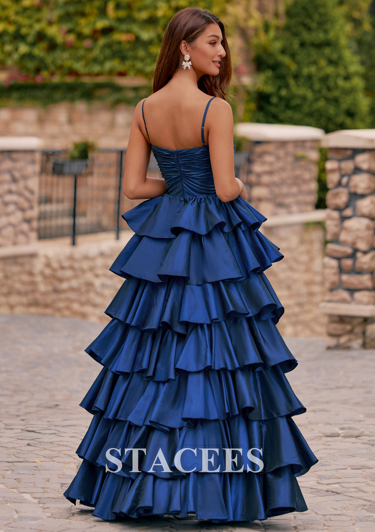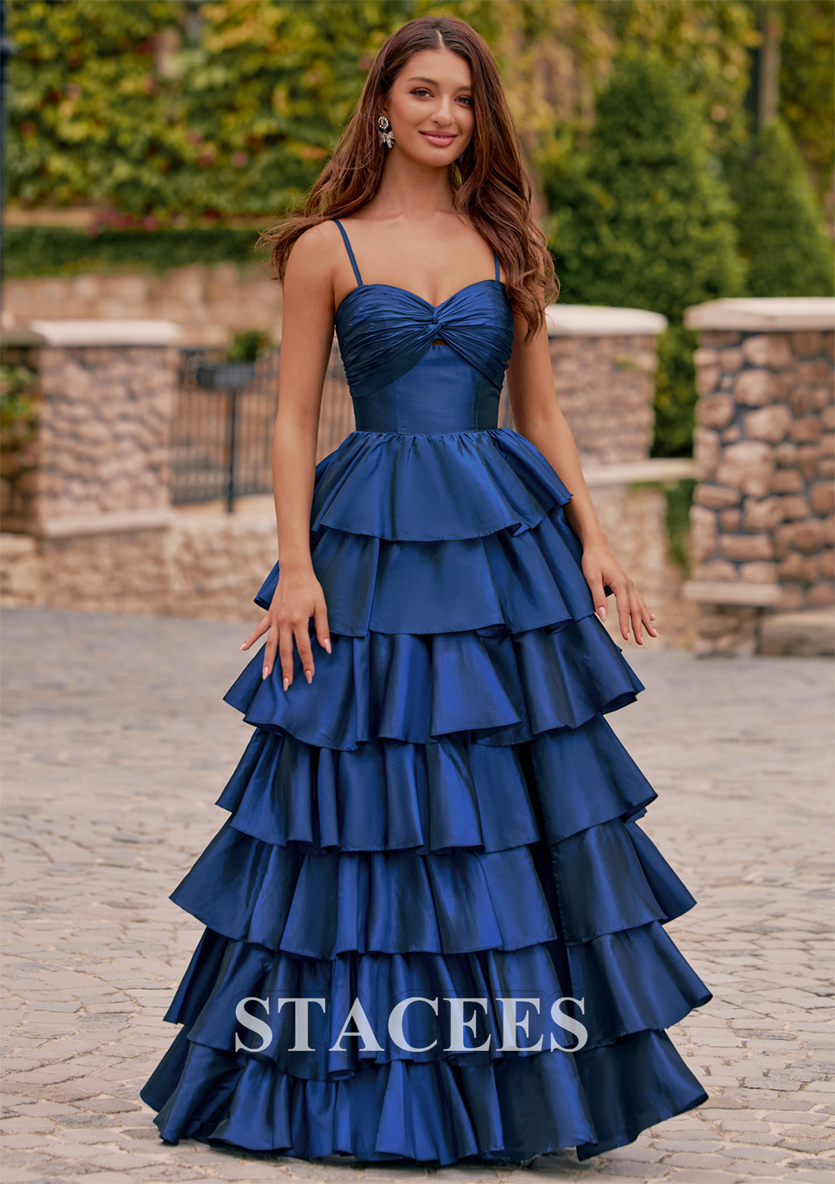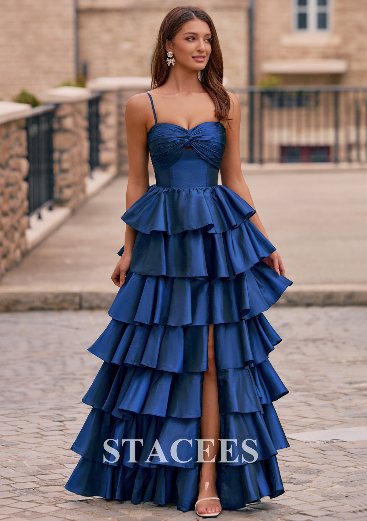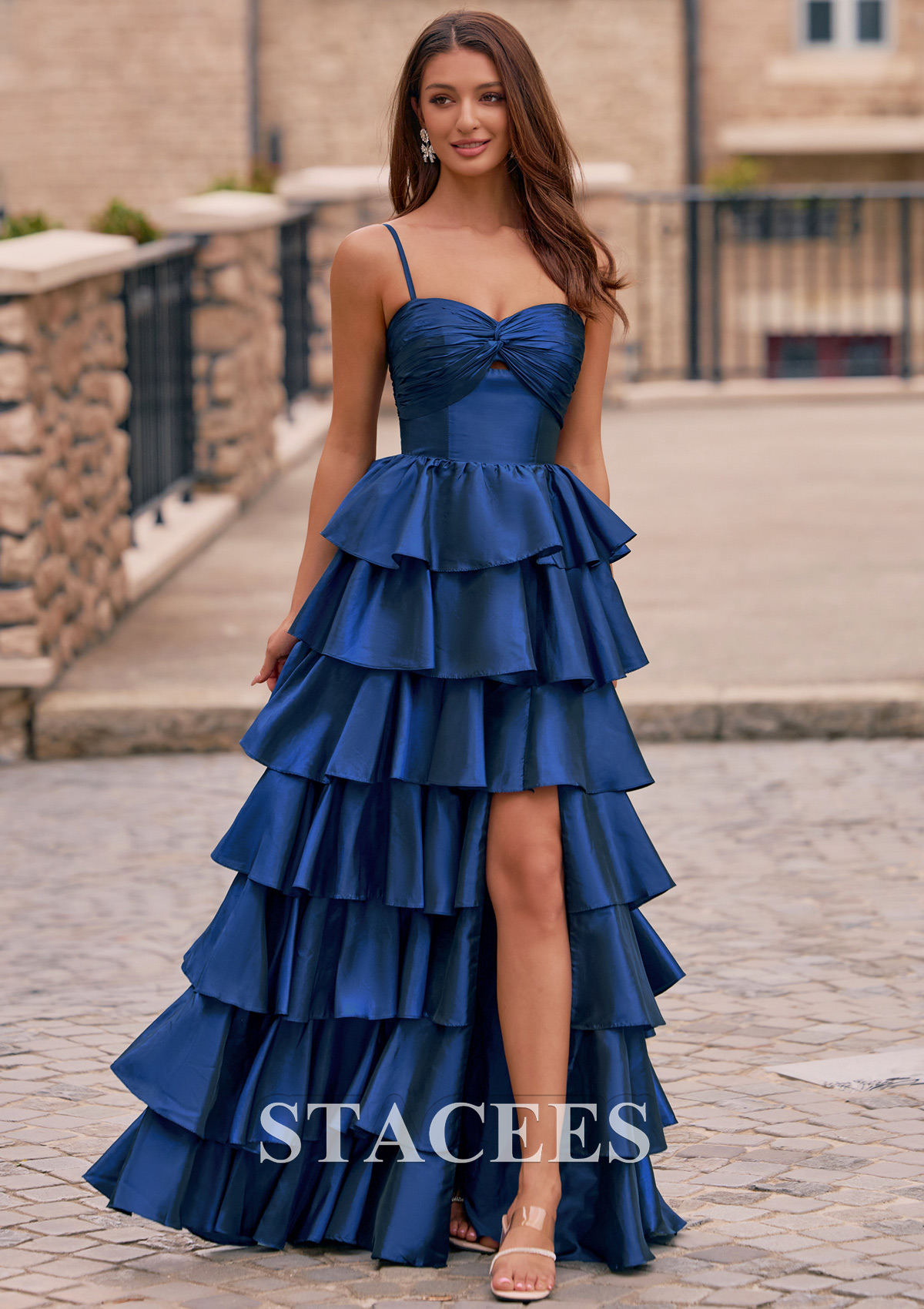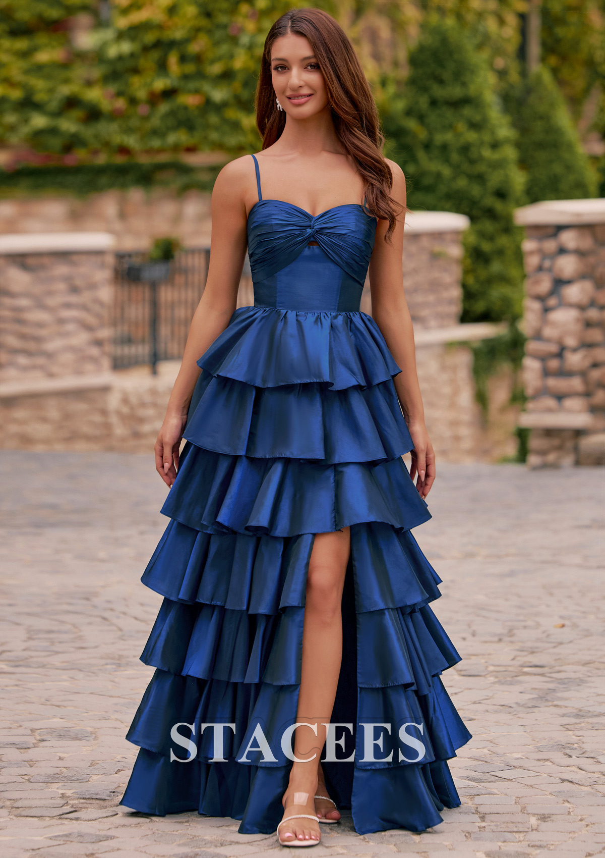 Make a grand entrance at your prom in this eye-catching A-line prom dress featuring dramatic floor-length tiered ruffles and elegant spaghetti straps. The fitted bodice is styled with a subtle twist knot design and an elegant keyhole cutout at the bust, creating a flattering silhouette and drawing attention to the neckline. Layers of cascading ruffles give the gown volume and movement, ensuring a stunning impression from every angle, while a front slit adds a modern touch and allows for ease of movement. The back boasts a smooth, ruched finish, keeping the look sleek and sophisticated. Perfect for proms, balls, pageants, or any formal occasion, an unforgettable choice, this tiered evening dress is designed for those who want to shine all night long.