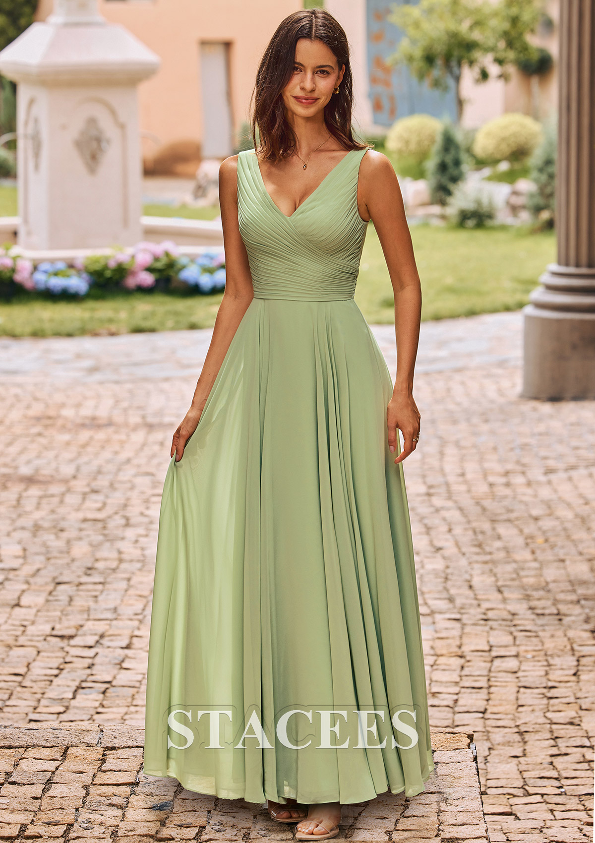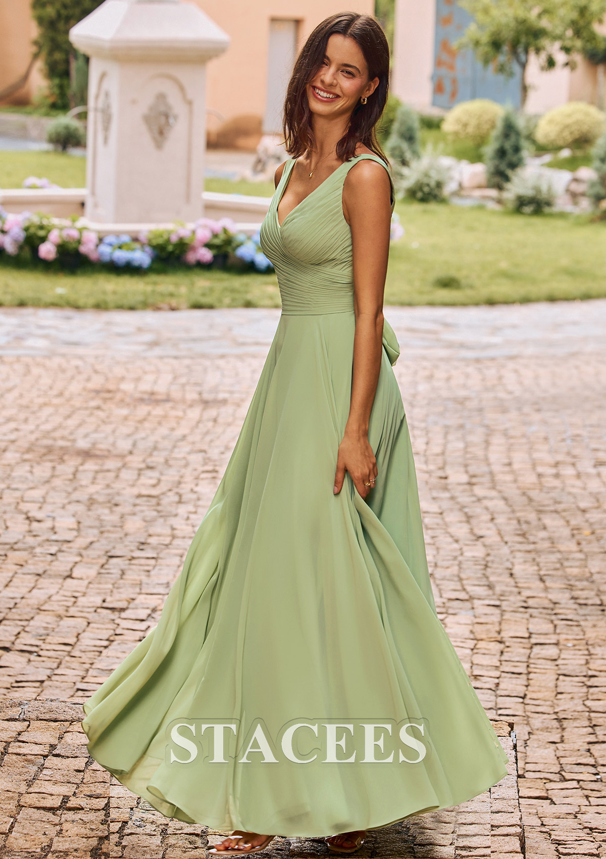 This elegant bridesmaid dress features a soft dusty sage green hue and a floor-length, flowy silhouette. The front showcases a flattering V-neckline with finely pleated bodice detailing that continues to the waist, creating a graceful and feminine shape. The dress has wide shoulder straps and a fitted waistband, enhancing the natural figure while providing comfortable support. The back of the dress offers a matching V-neck with pleating, and is finished with a gathered sash that ties into a decorative bow, adding a charming touch. Flowing pleats extend through the length of the skirt, giving the dress beautiful movement and a romantic feel. Perfect for weddings, garden parties, or formal occasions, this style balances classic elegance with contemporary design. The dress is shown in an outdoor setting, highlighting its soft color and lightweight, airy fabric.