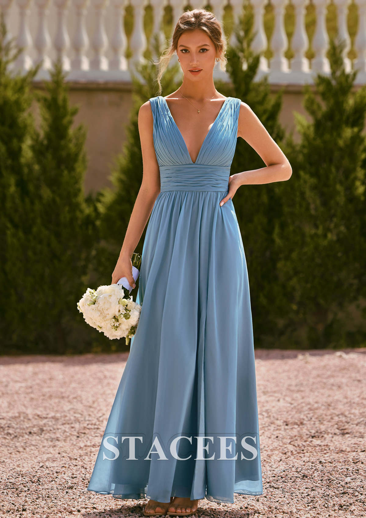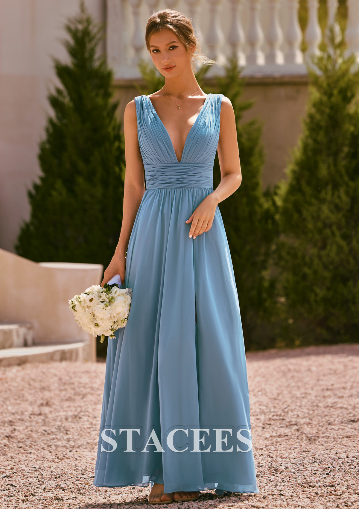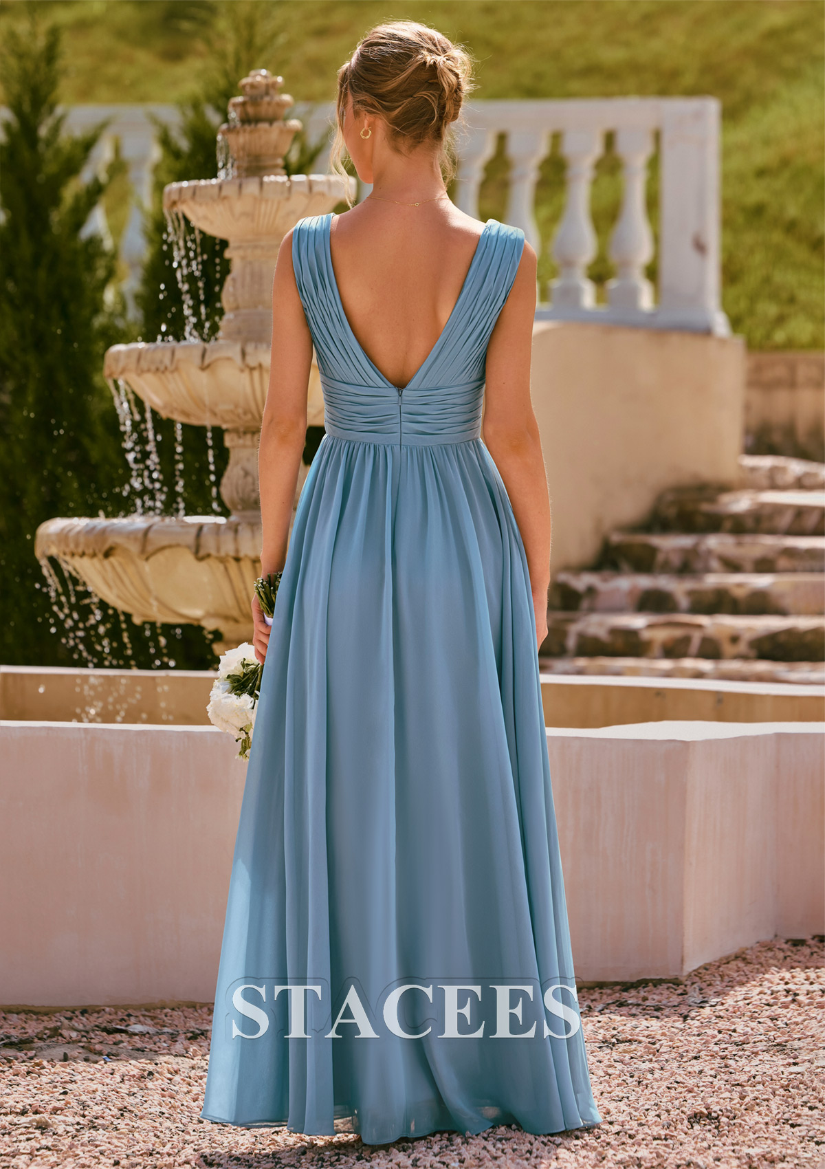 Create a romantic, modern bridal‑party look with this ruched chiffon bridesmaid dress from Stacees. The gown features a deep V‑neckline in the front and back with soft, vertical pleating that elongates the torso and beautifully shapes the bust. A wide, ruched waistband cinches the waist to highlight your figure while still feeling secure and comfortable for a full day of celebrating. The long chiffon skirt falls into a flowy A‑line silhouette that flatters every body type and moves gracefully with each step. A chic front slit adds a touch of drama and ease of movement, perfect for walking down the aisle and dancing at the reception. The back mirrors the pleated V‑neck design for a stunning look that photographs beautifully in outdoor, garden, beach, or classic ballroom wedding settings. This bridesmaid dress is ideal for spring and summer weddings, coastal ceremonies, and elegant evening events. Style it with nude or silver heels, delicate jewelry, and soft waves or an updo for a timeless, feminine bridal‑party outfit.
