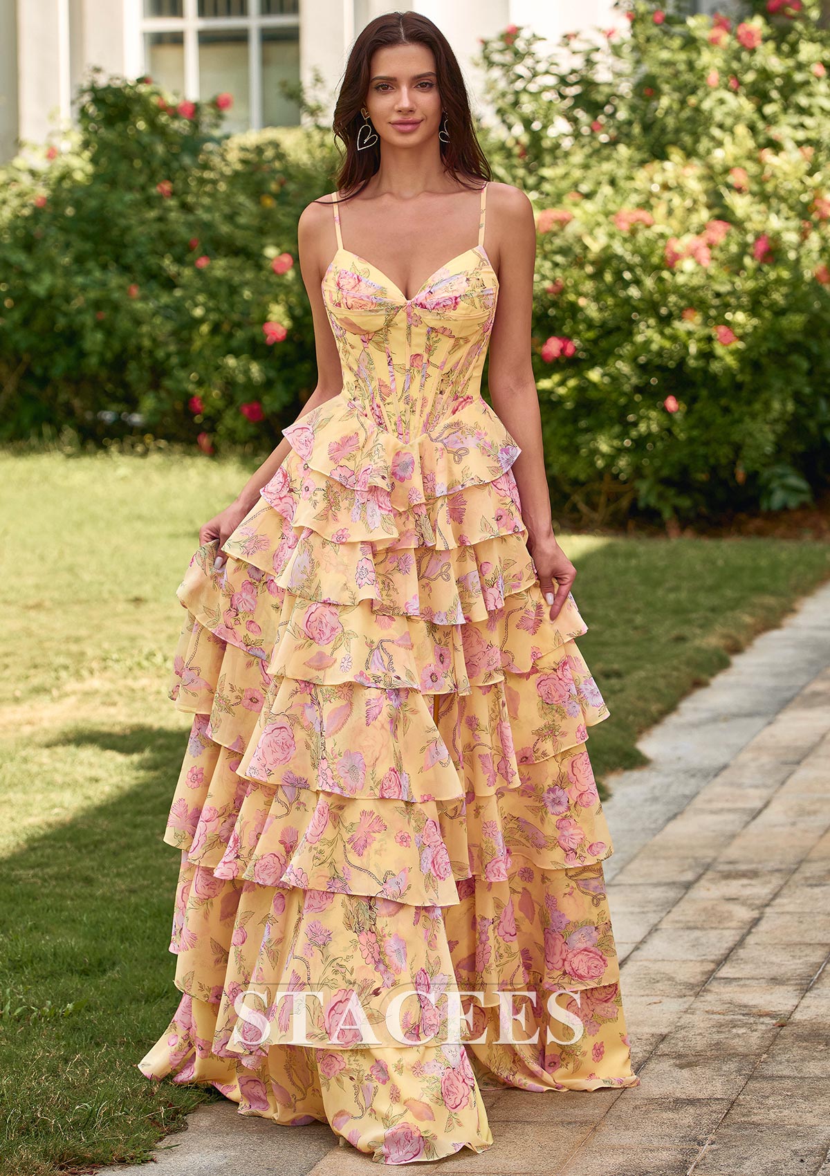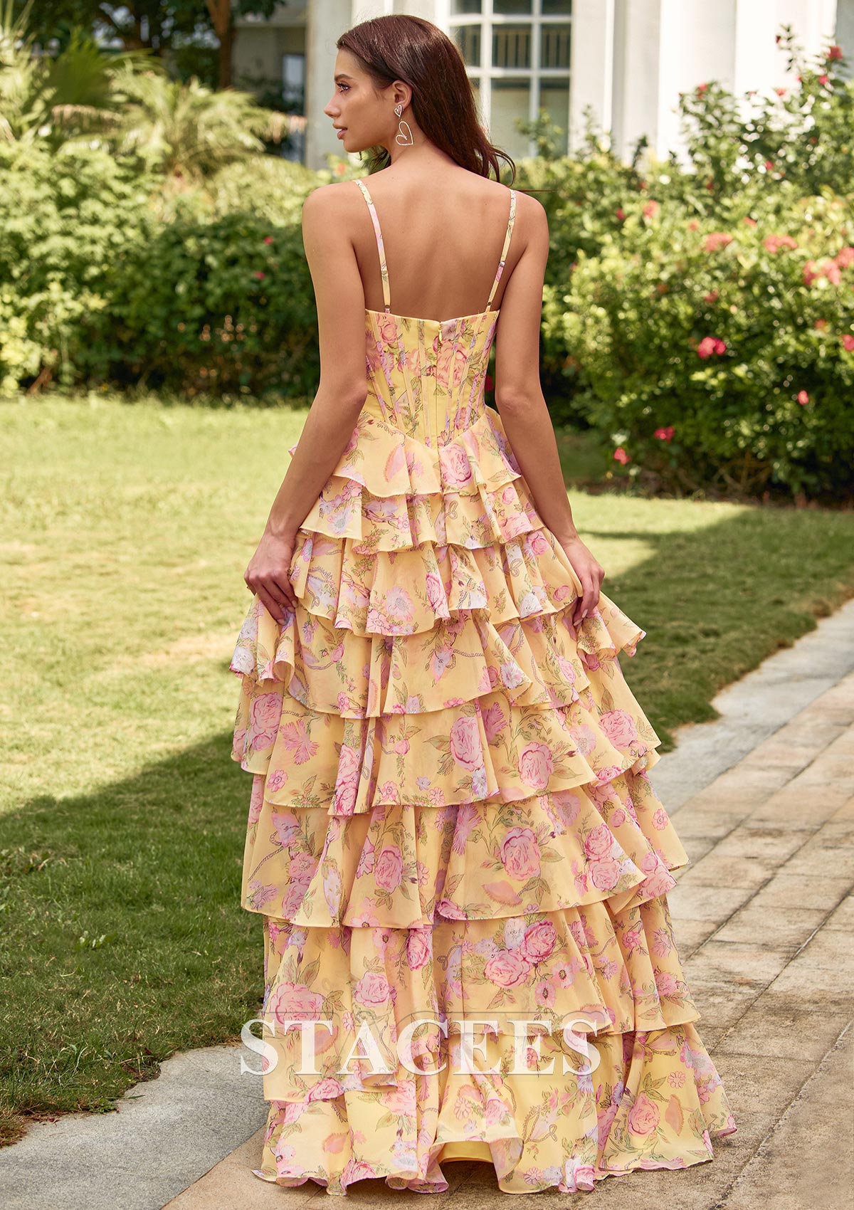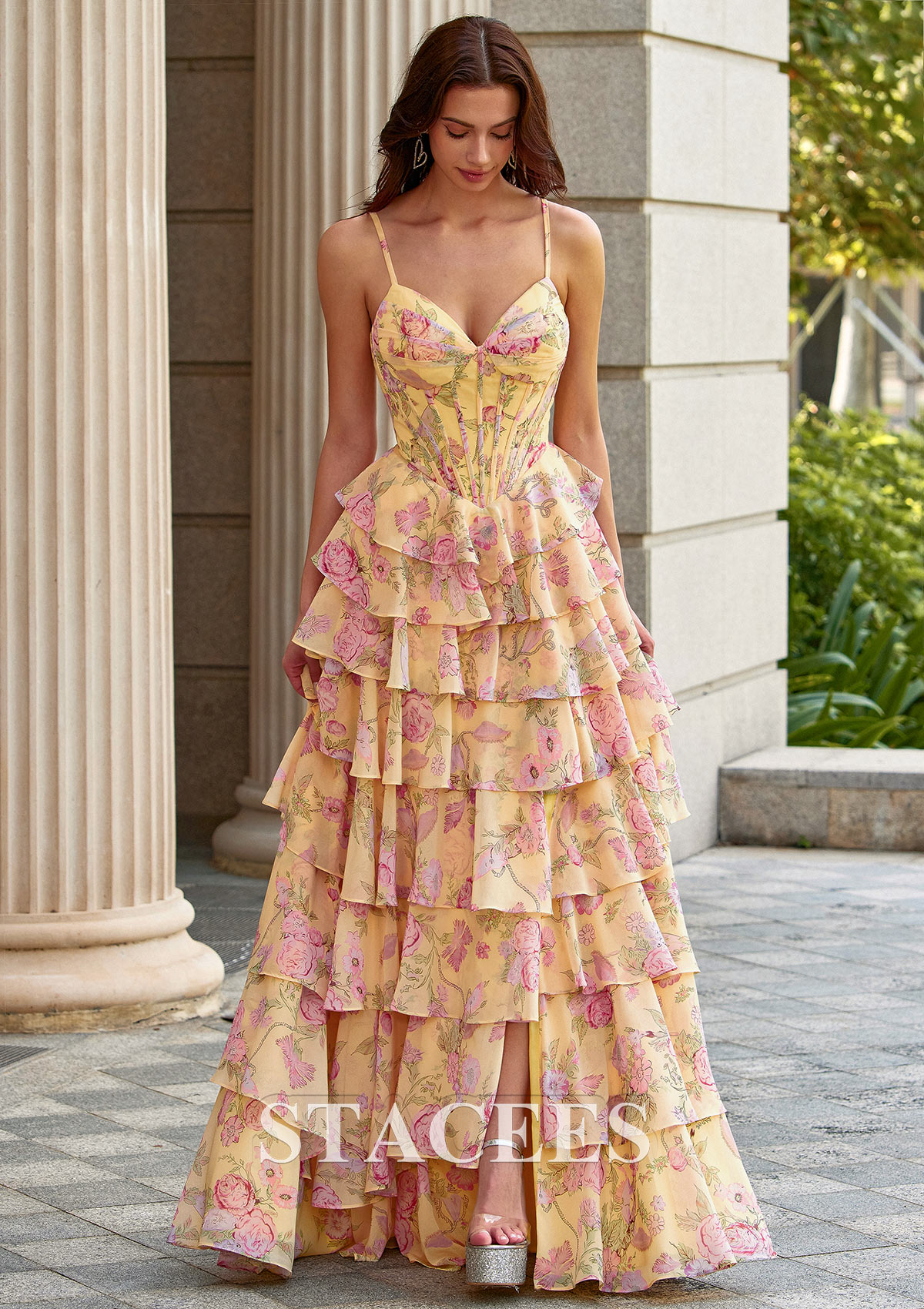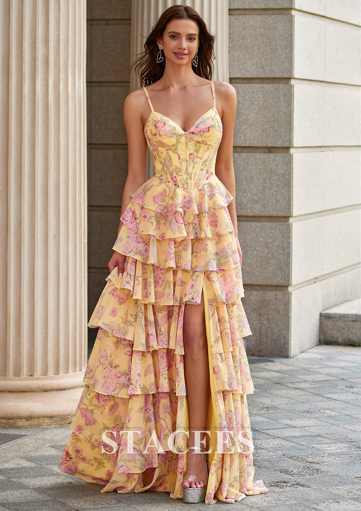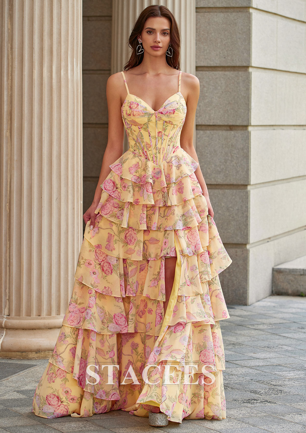 Channel romantic garden‑party vibes in this floral print prom dress, perfect for spring and summer formals. The fitted bodice features a sweetheart neckline with delicate adjustable spaghetti straps and subtle corset‑style seaming that shapes and defines the waist for a flattering, hourglass silhouette. Soft floral prints bloom all over the dress, creating a dreamy, feminine look beautifully in natural light. From the waist down, cascading tiers of ruffled fabric form a full A‑line skirt with a stylish front slit, giving you easy movement and a playful, leg‑revealing moment when you walk or dance. The back showcases slim straps and a smooth zipper closure for a clean, secure fit that is comfortable all night long. Ideal for prom, garden‑themed parties, weddings, or any special occasion, this tiered ruffle floral gown is a must‑have if you are searching for a romantic, whimsical, and statement‑making prom dress.