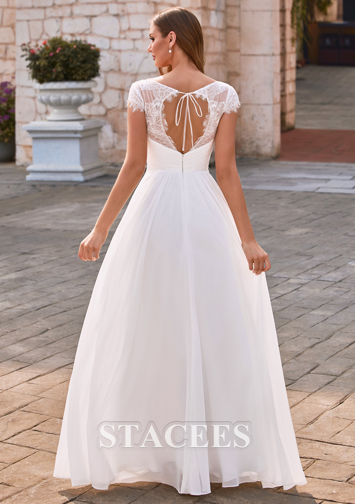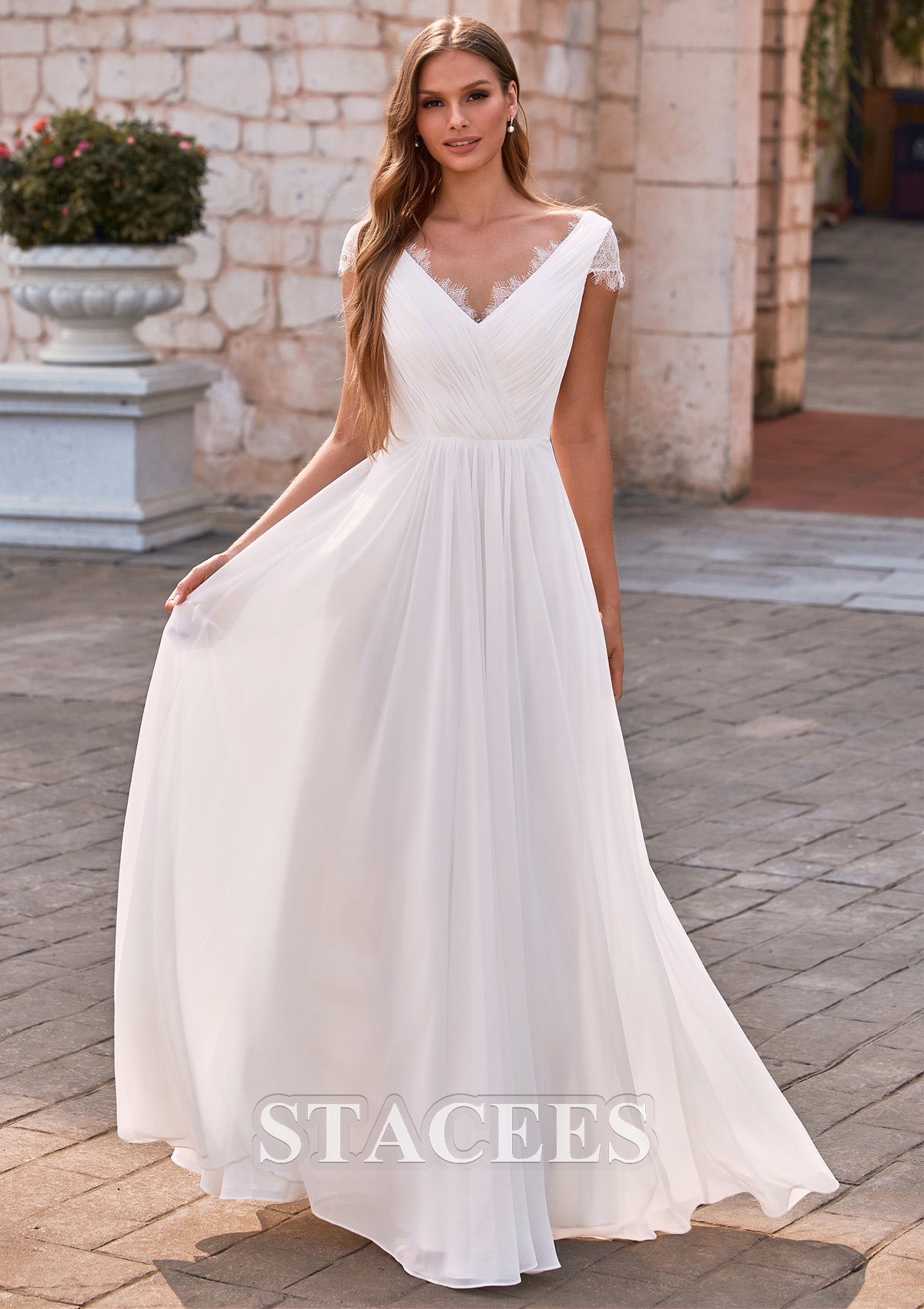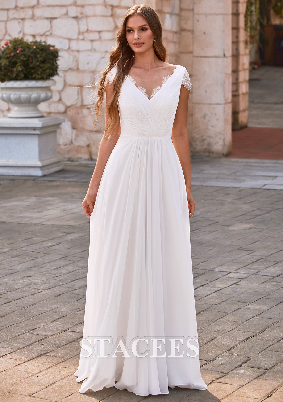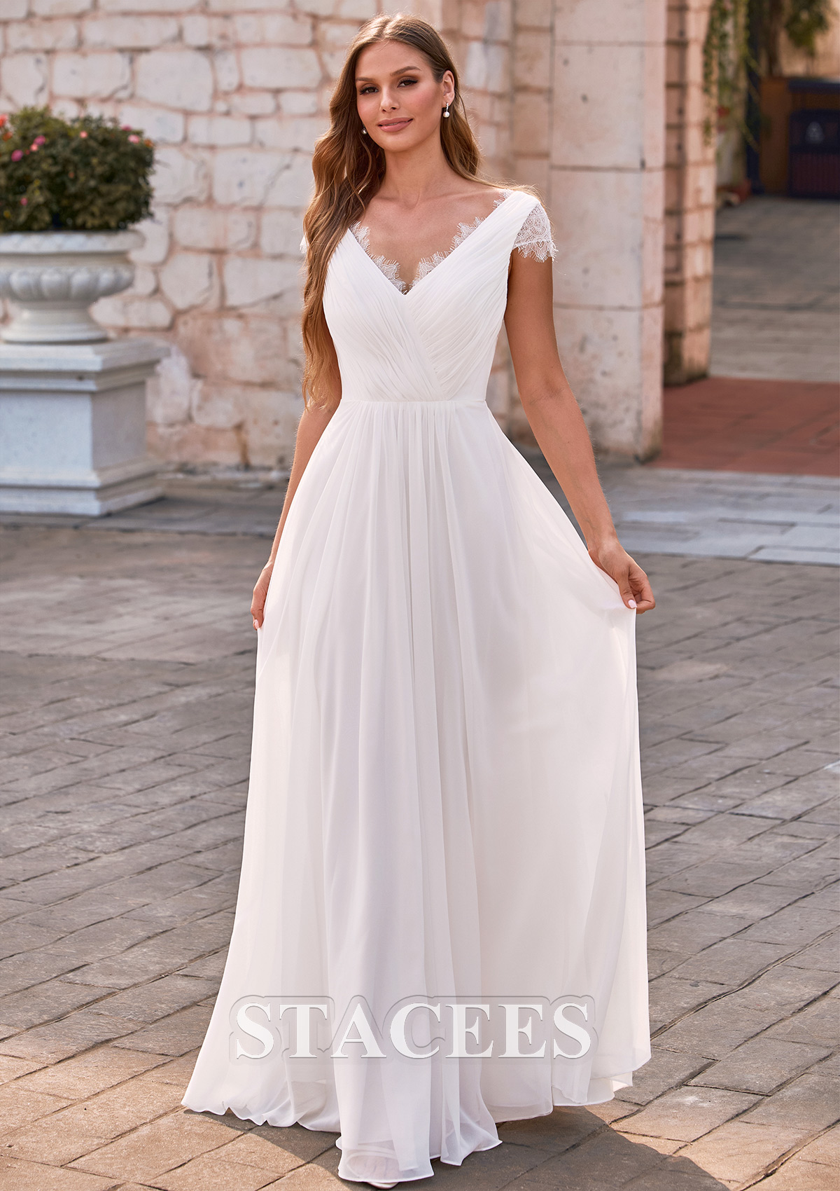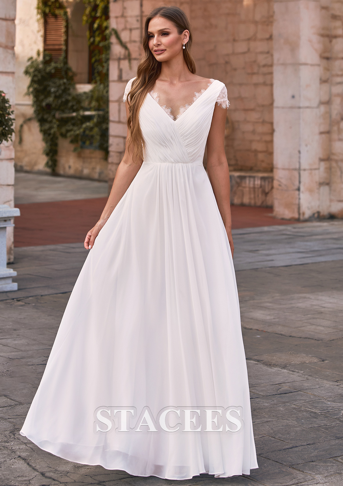 This simple A-line wedding dress blends timeless romance with effortless modern style. The soft, pleated V-neck bodice flatters the décolletage while delicate lace cap sleeves add a refined, feminine touch. Lightweight chiffon flows from a softly gathered waist into a floor-length skirt that moves beautifully with every step, creating a graceful silhouette. At the back, a sheer lace inset with a dainty tie detail and Keyhole Back adds romantic interest. This gown is designed for formal weddings, summer formals, and romantic evening events. Pair with pearl drop earrings and strappy heels for a classic look.