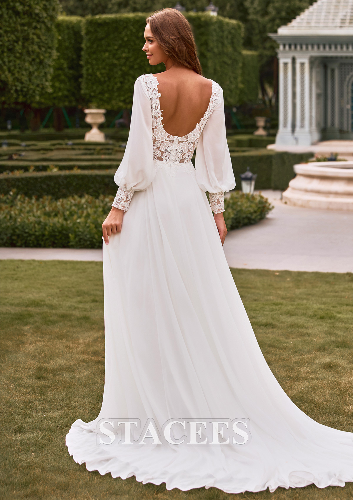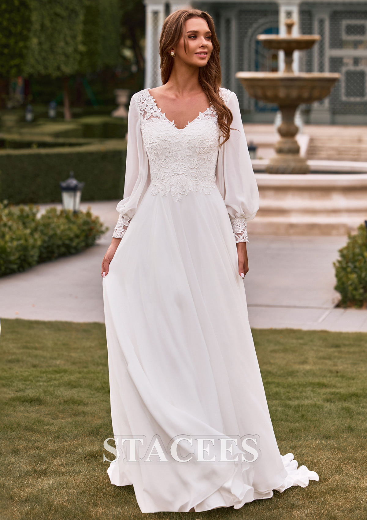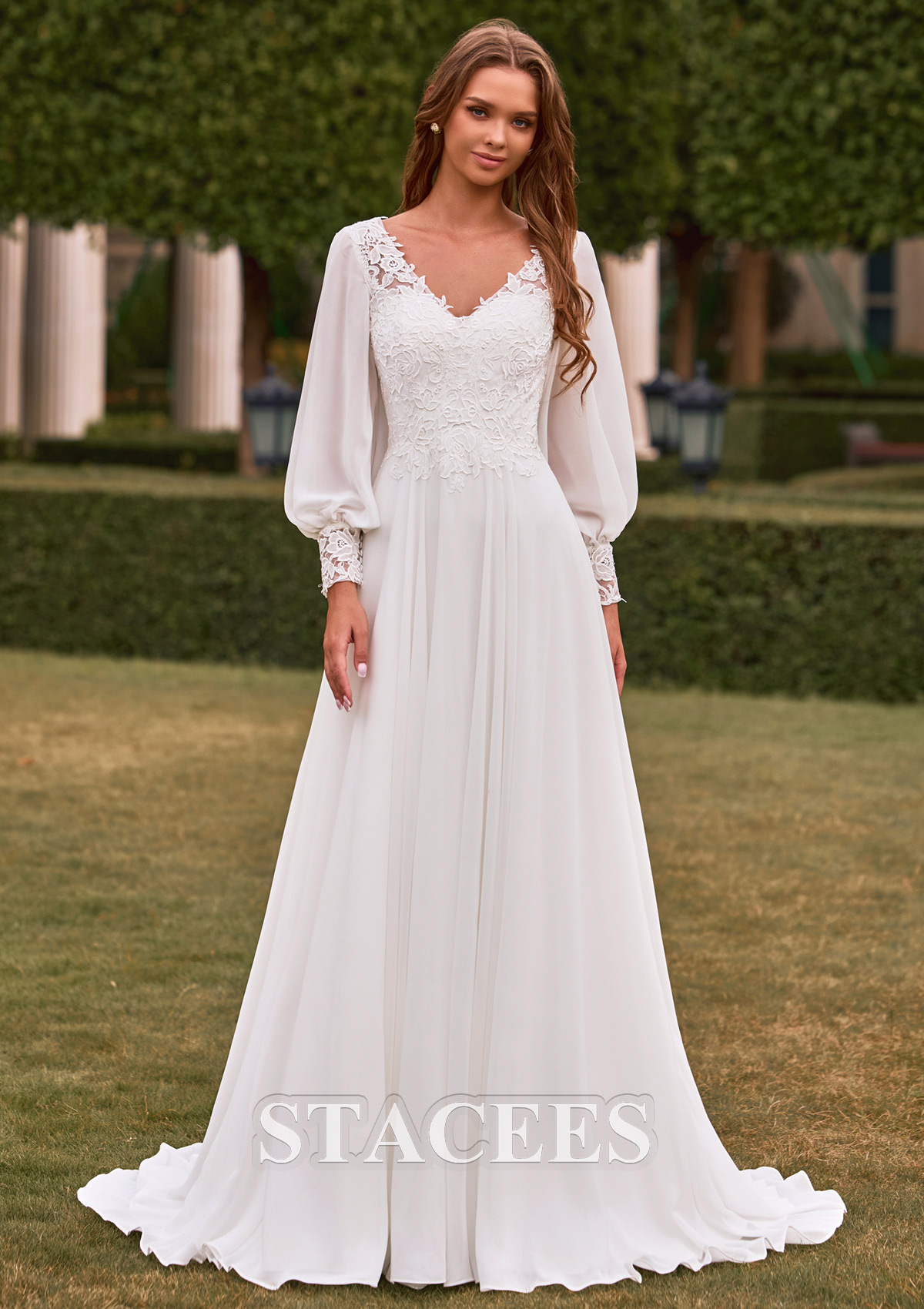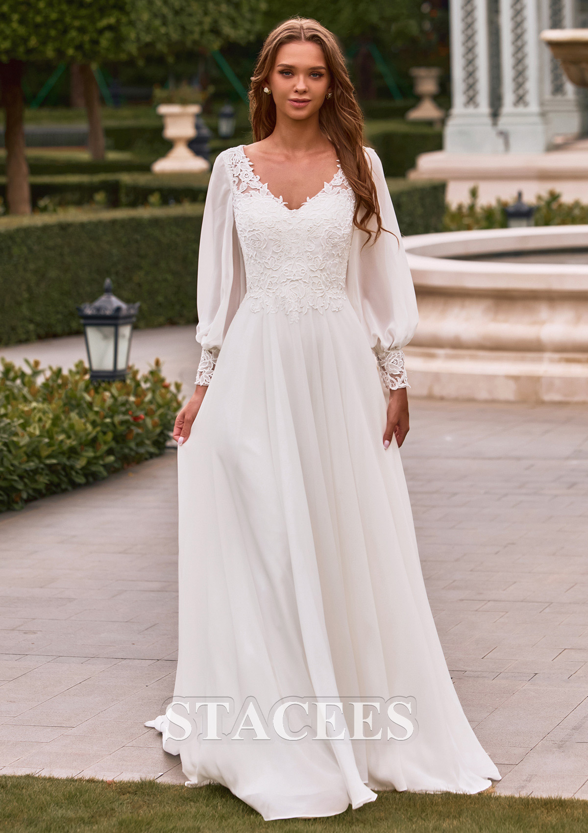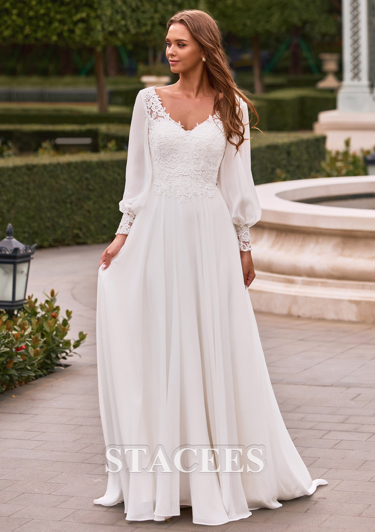 Experience the perfect blend of vintage elegance and modern boho-chic style with this breathtaking A-line gown. The bodice is meticulously crafted with delicate floral lace appliqués that create a soft, textured look. Featuring a flattering illusion V-neckline bodice, the design highlights the natural waistline before flowing into a clean, minimalist skirt. The back of the gown is a true showstopper, open back framed by lace edges for a touch of modern allure. The full-length airy sleeves create a whimsical fairytale aesthetic while providing graceful coverage. Each sleeve is finished with an intricate lace cuff that mirrors the bodice detailing, adding a sophisticated finishing touch. Crafted from premium lightweight chiffon, the skirt is designed for effortless movement. It drapes beautifully, resists wrinkles, and feels light as air.